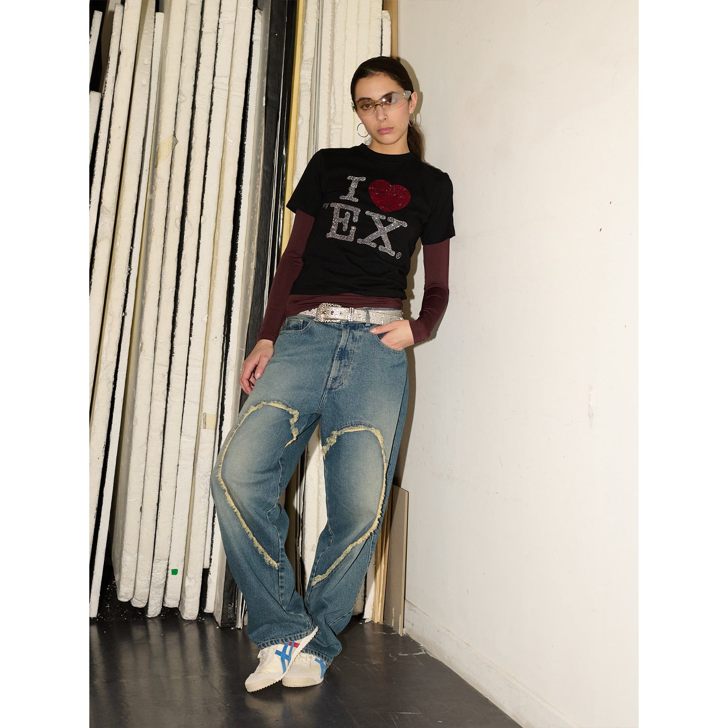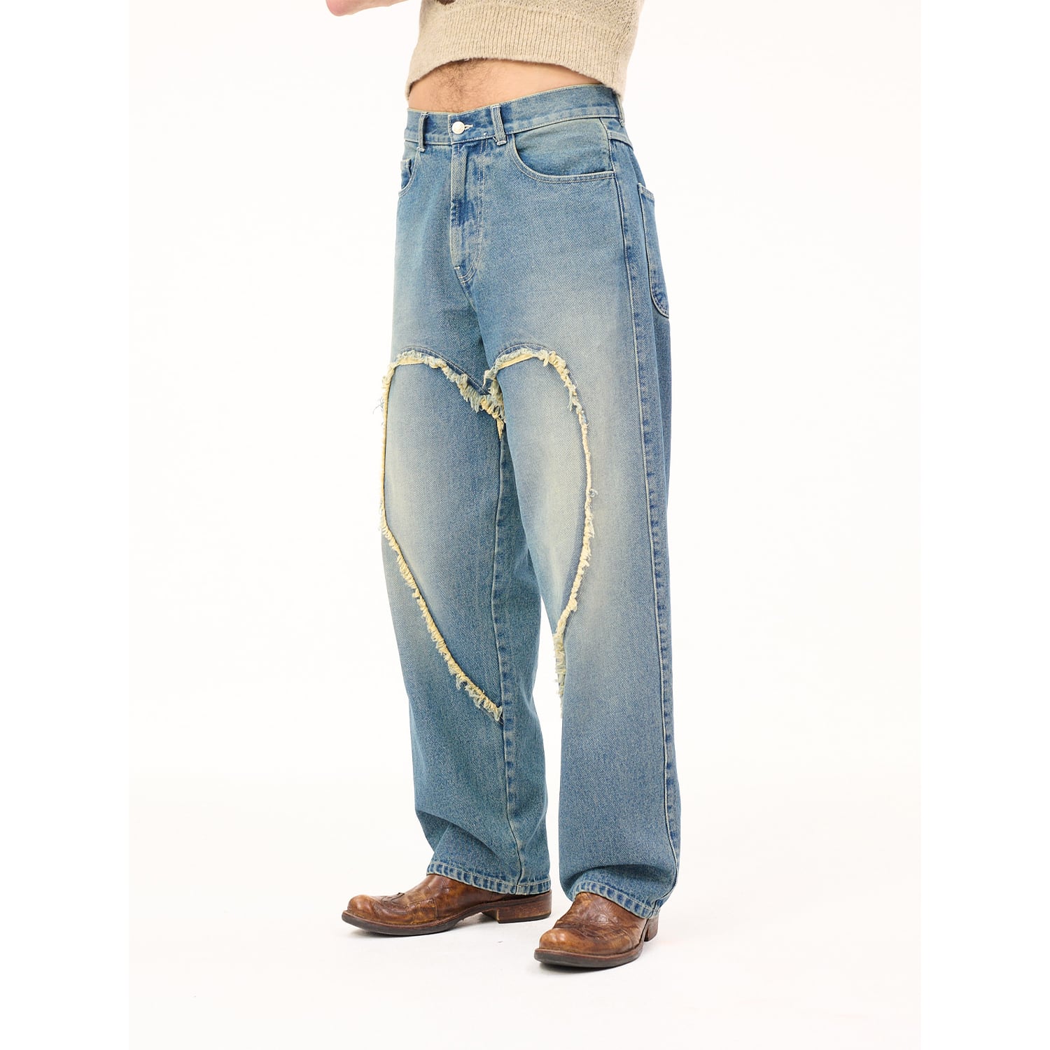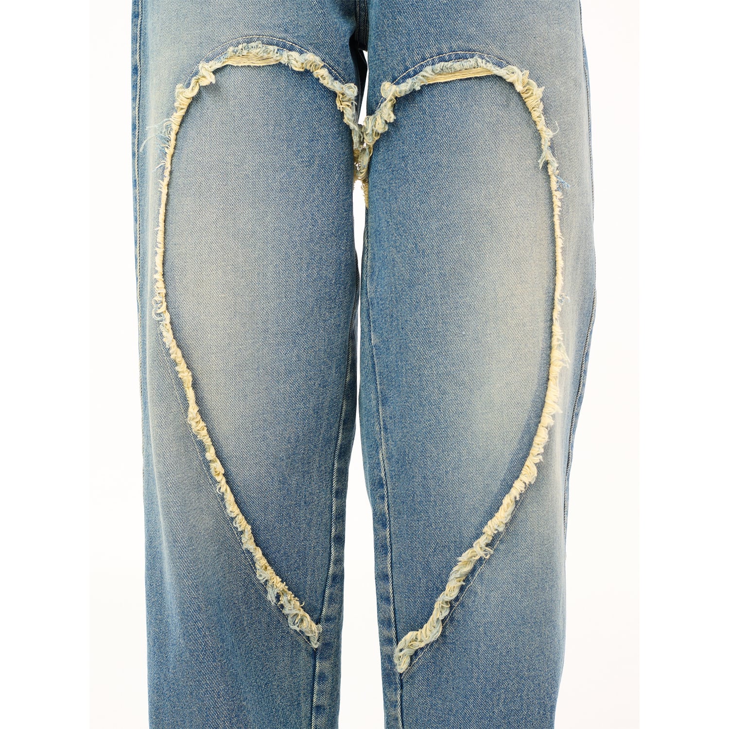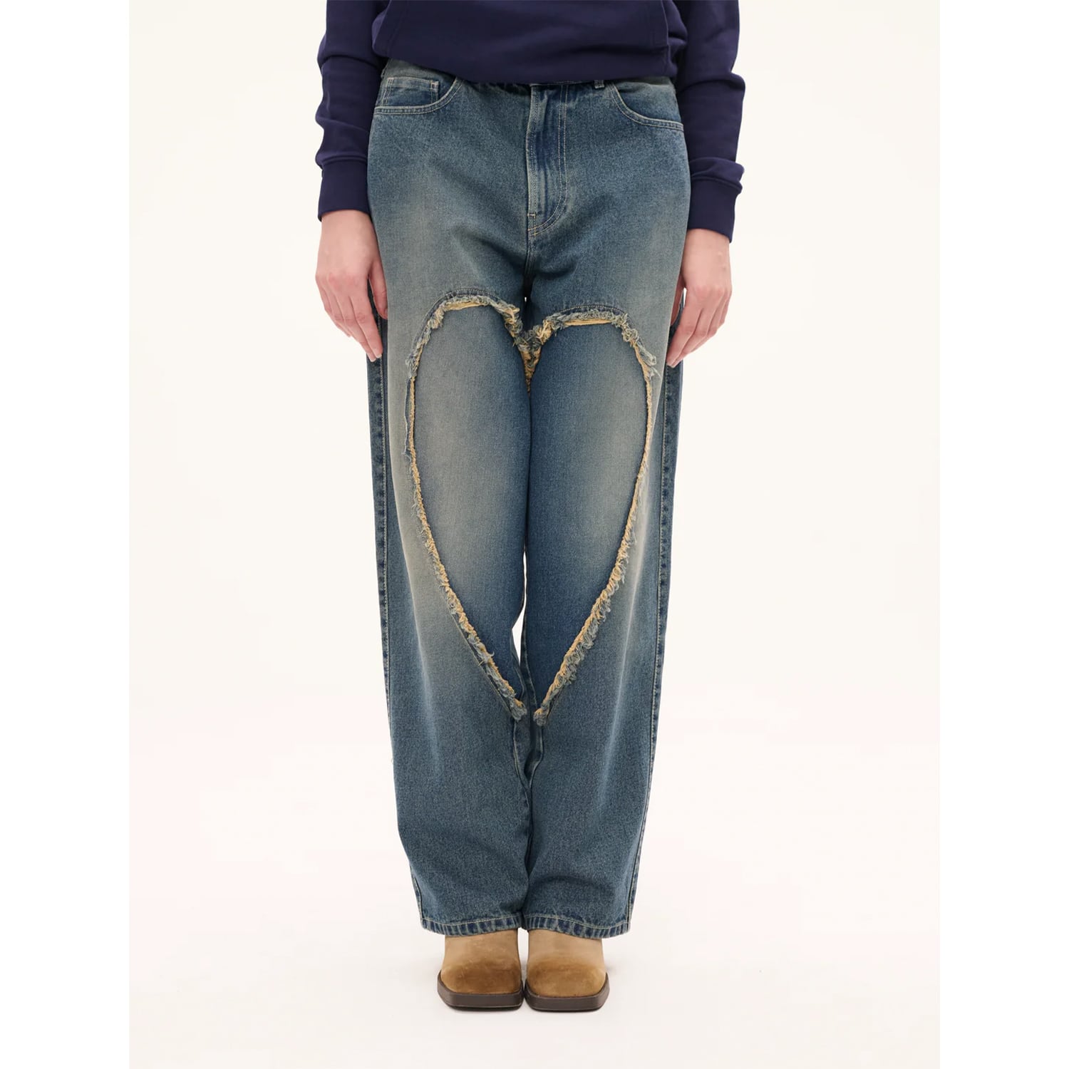 ジェットブリーチウォッシュ加工を施した100%オーガニックコットンのデニムパンツ。ほつれ加工で形作られたハートのモチーフが目を引くアクセントに。リラックスしたストレートフィット。背面にビーガンレザーのベルトパッチ。