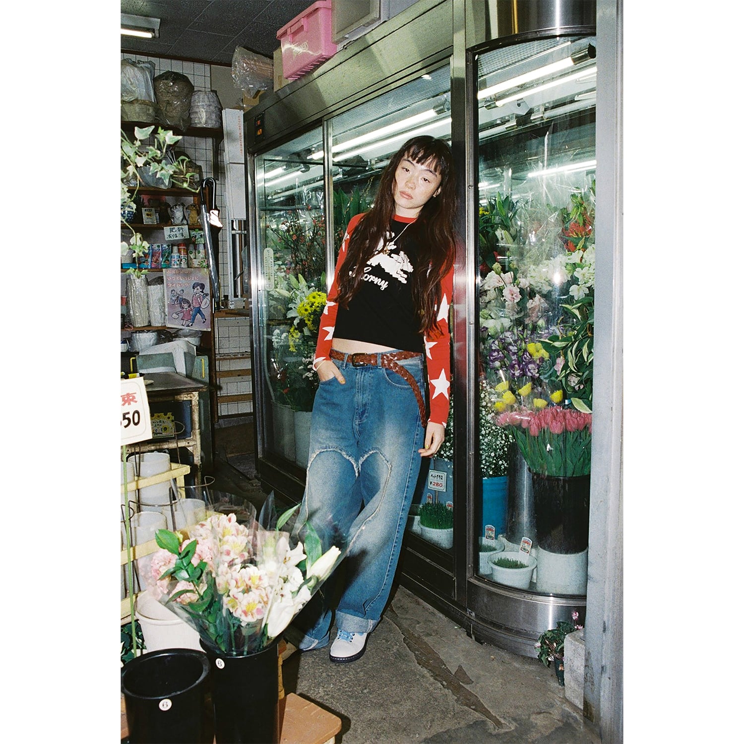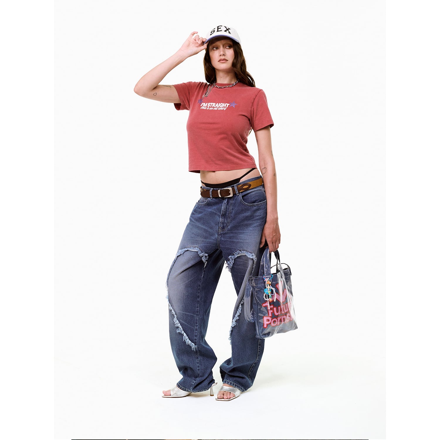 左右の脚を揃えた瞬間に一つの大きなハートが完成するバギージーンズ。