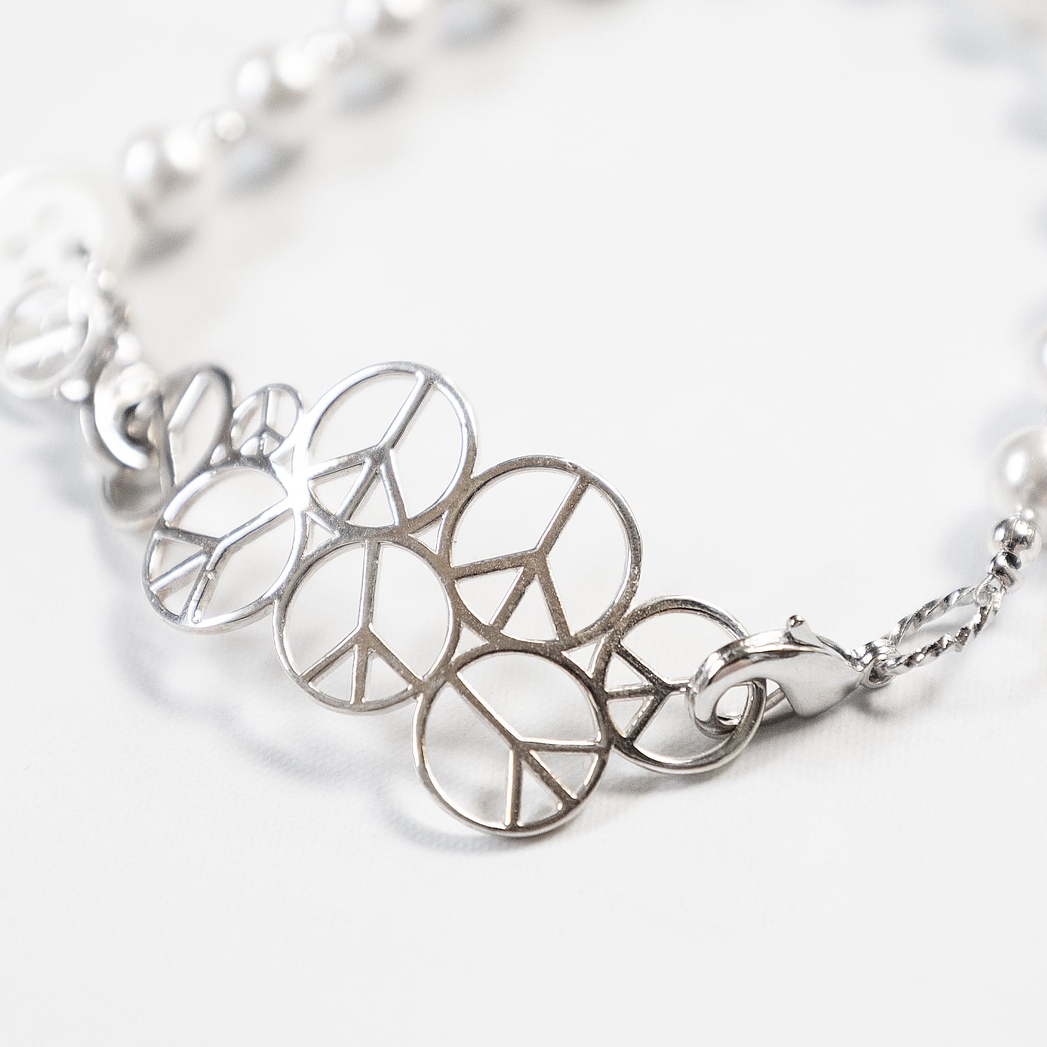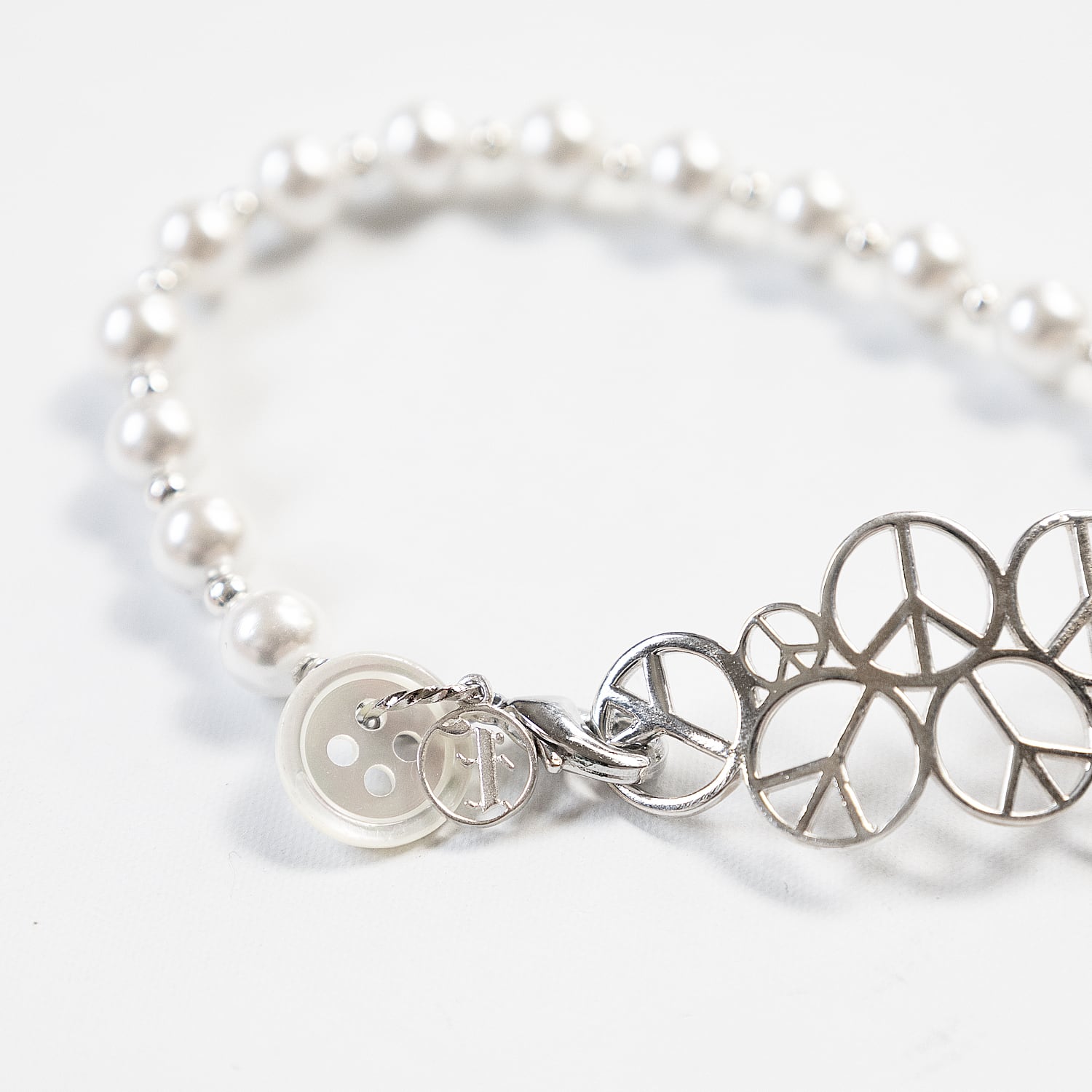 天然パールとシルバー925プレートを組み合わせたブレスレット。連なるピースマークがさりげない個性を添え、柔らかな輝きとクールな質感が絶妙に調和。シンプルながらもしっかりと存在感を放つ一本です。