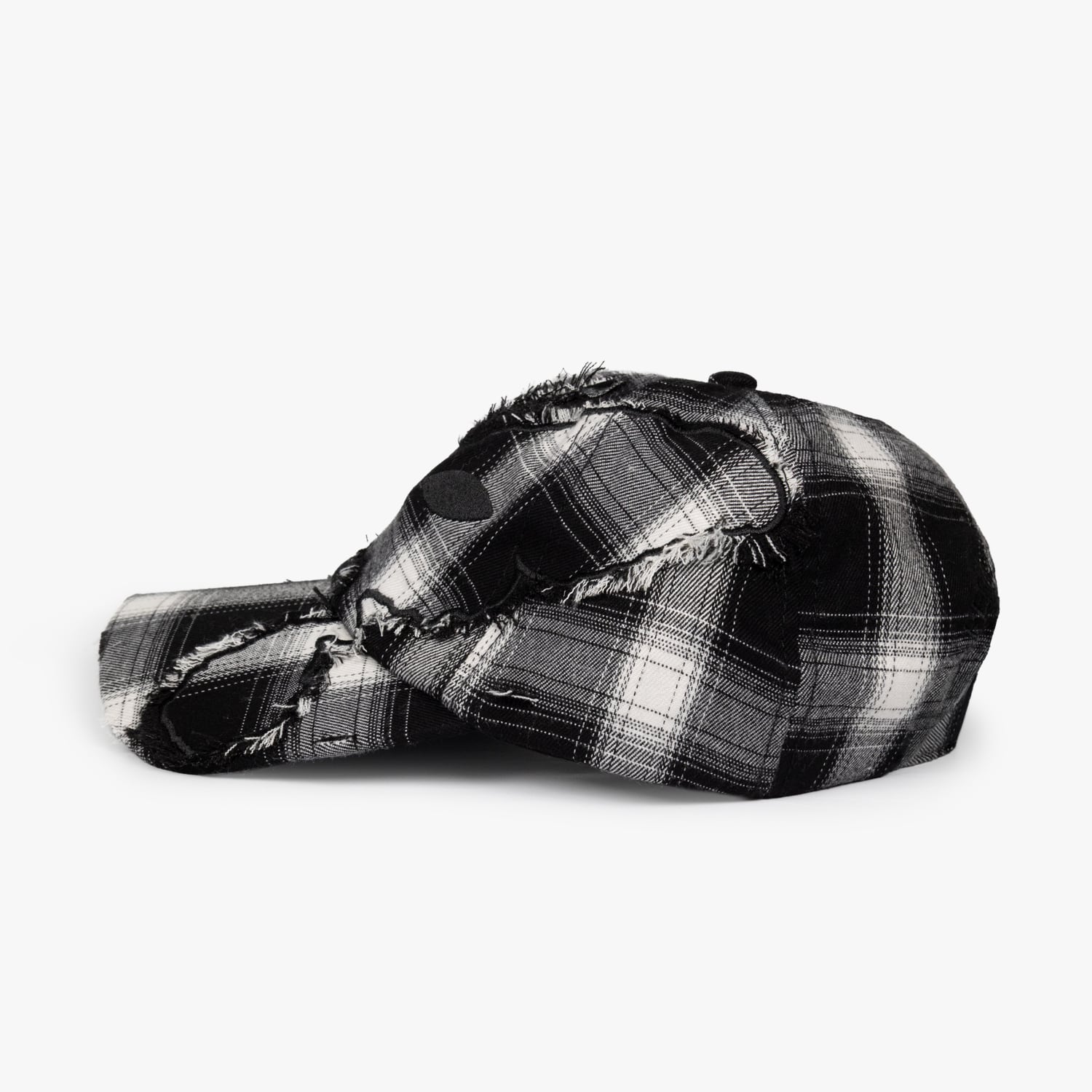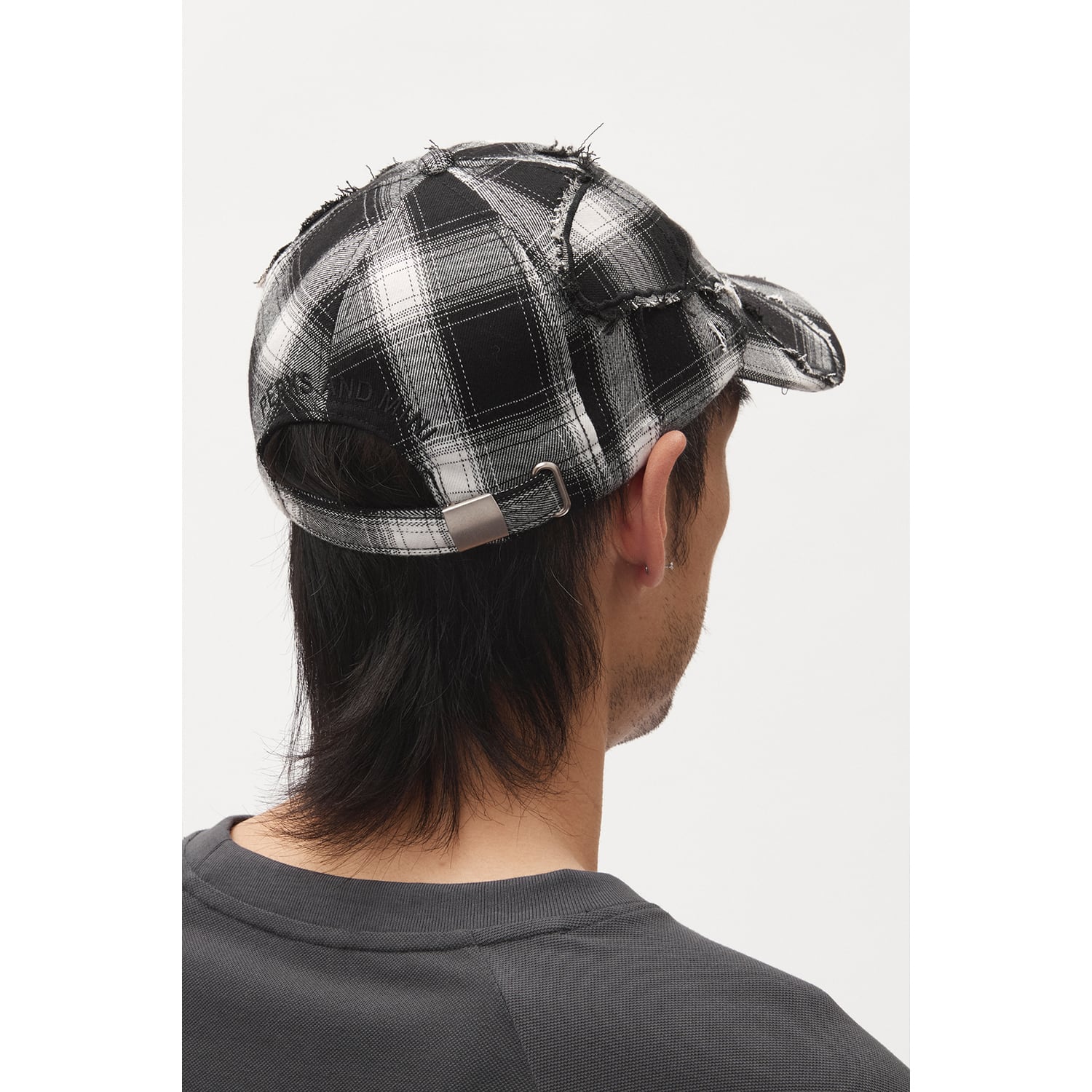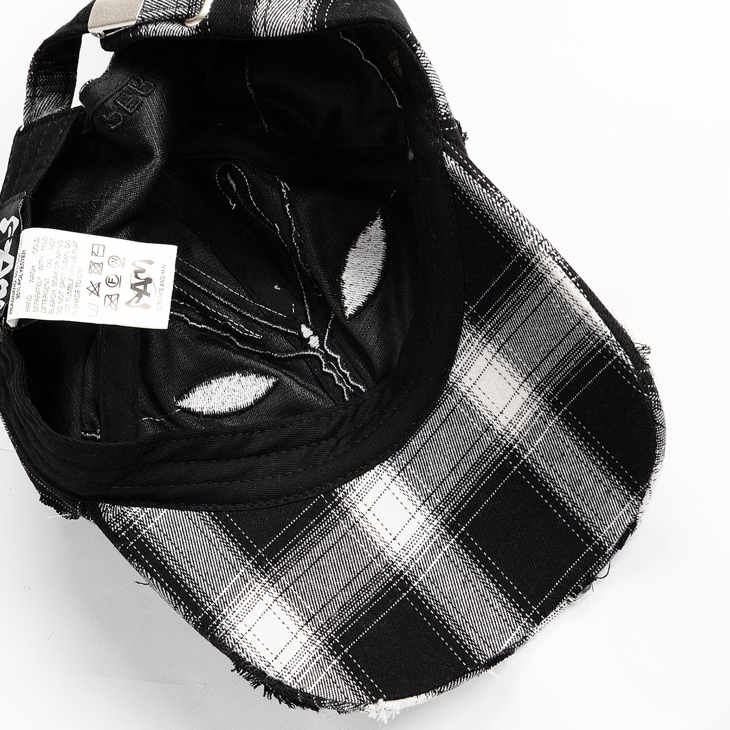 ダメージ加工を施したチェック柄の6パネルキャップ。フロントにはAlien Kiss Butterflyのアップリケ、バックにはPerks and Miniの刺繍入り。チェック柄を主役に、P.A.M.らしいエッジを効かせたデザインです。