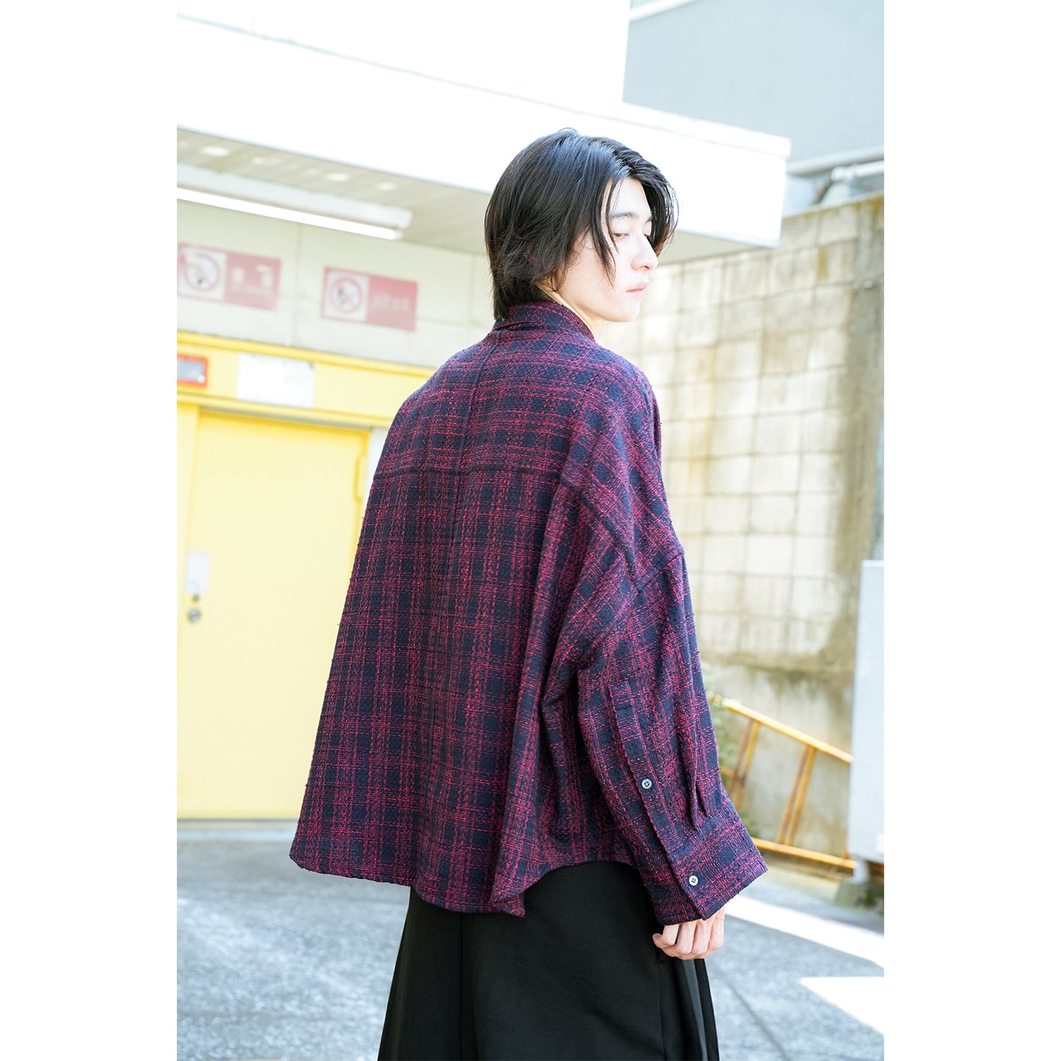 糸の表情を活かしたモダンなチェック柄のジャイアントシャツ。素材は上質なコットン混紡のファンシーツイードを使用し、和紙の繊細な風合いが加わることで特徴のあるテクスチャーを生み出しています。オーバーサイズながらも収まりがよく、バランスのとれたシルエットに仕上げています。
