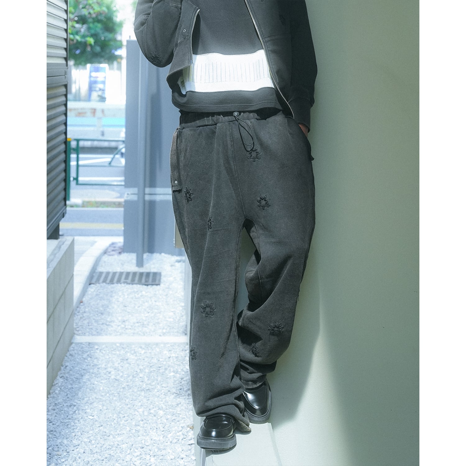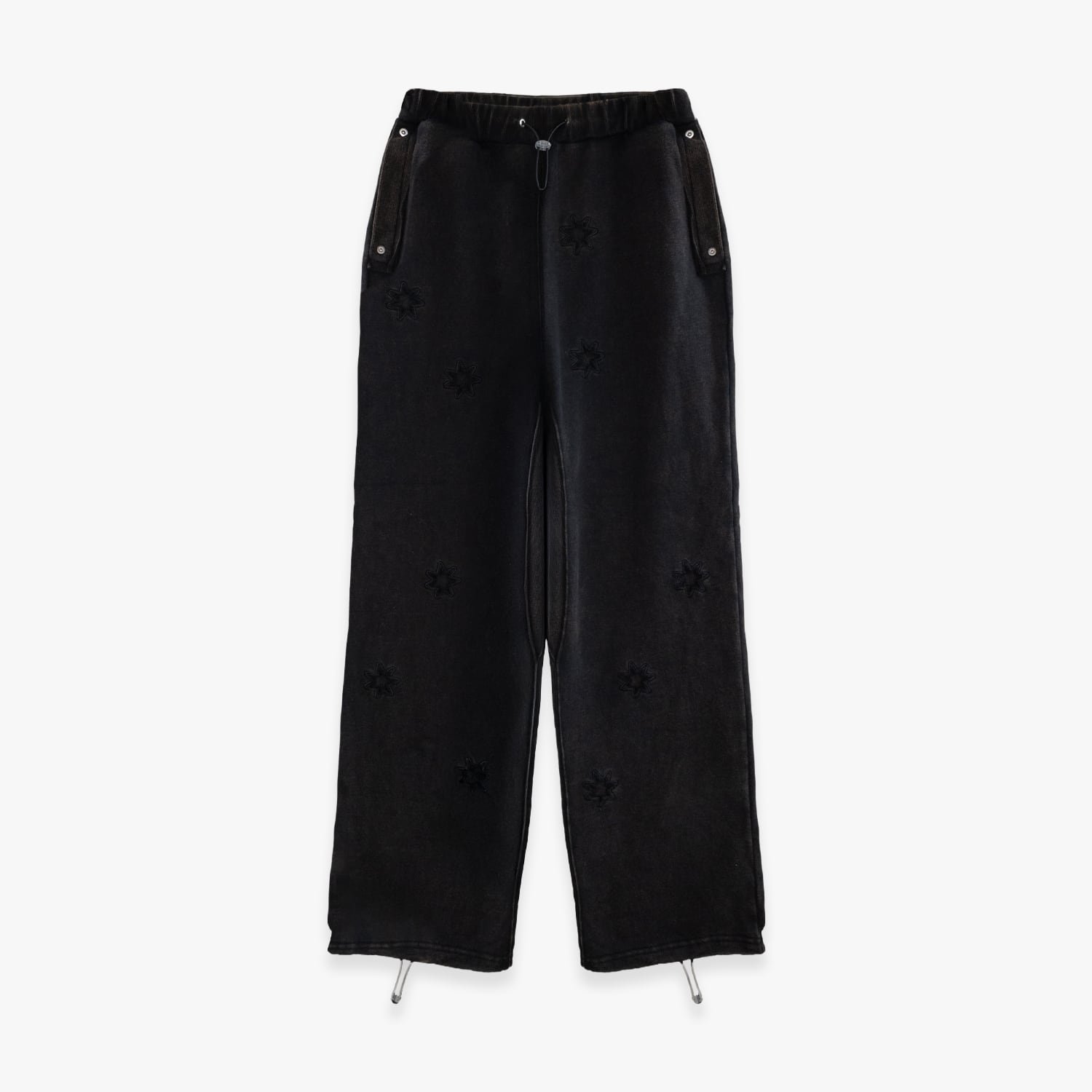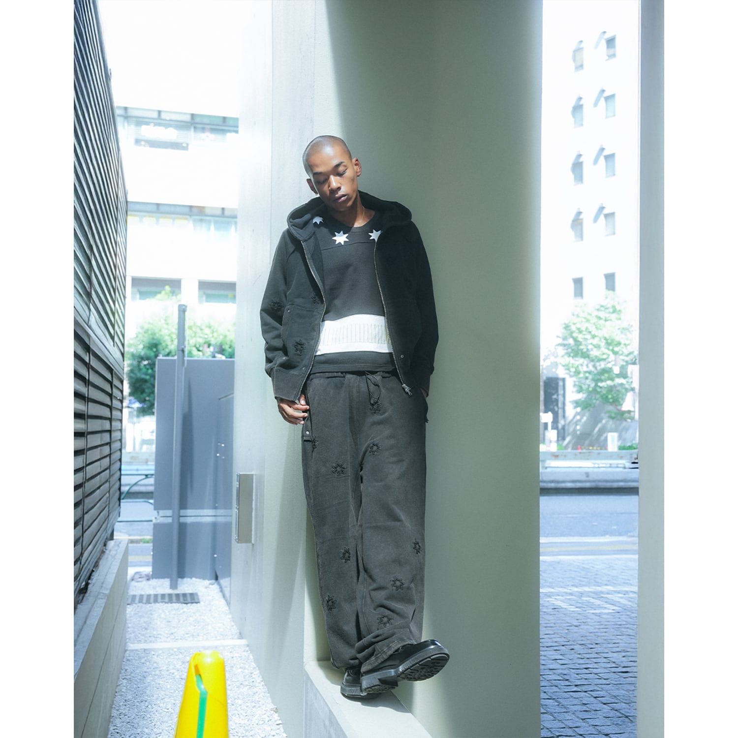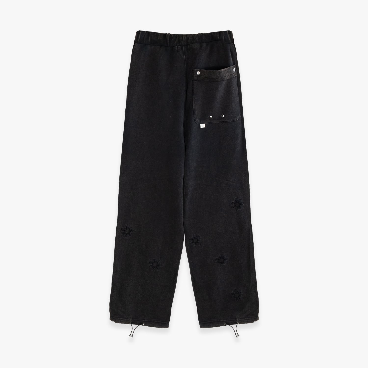 ゆったりとしたバギーシルエットの定番スウェットパンツ。無数の七芒星の刺繍と大胆な脱色加工を施し、ヴィンテージ感とアート感を融合。シンプルな魅力を保ちつつ、ミステリアスで幻想的なモチーフがさりげなく存在感をプラス。リラックス感のある着こなしにも個性を添えてくれる一着です。