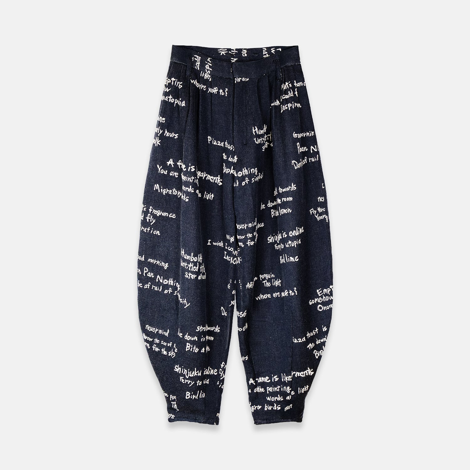 裾に向かって大胆に絞り込まれた独特のワイドシルエットが特徴のFOOT SOLDIER。立体的なフォルムは、クラシックな作業着を思わせながらも、詩的なテキスタイルによってモダンに昇華されています。見た目はデニムライクでありながら、軽やかなジャカード生地を採用したユニークな一本です。