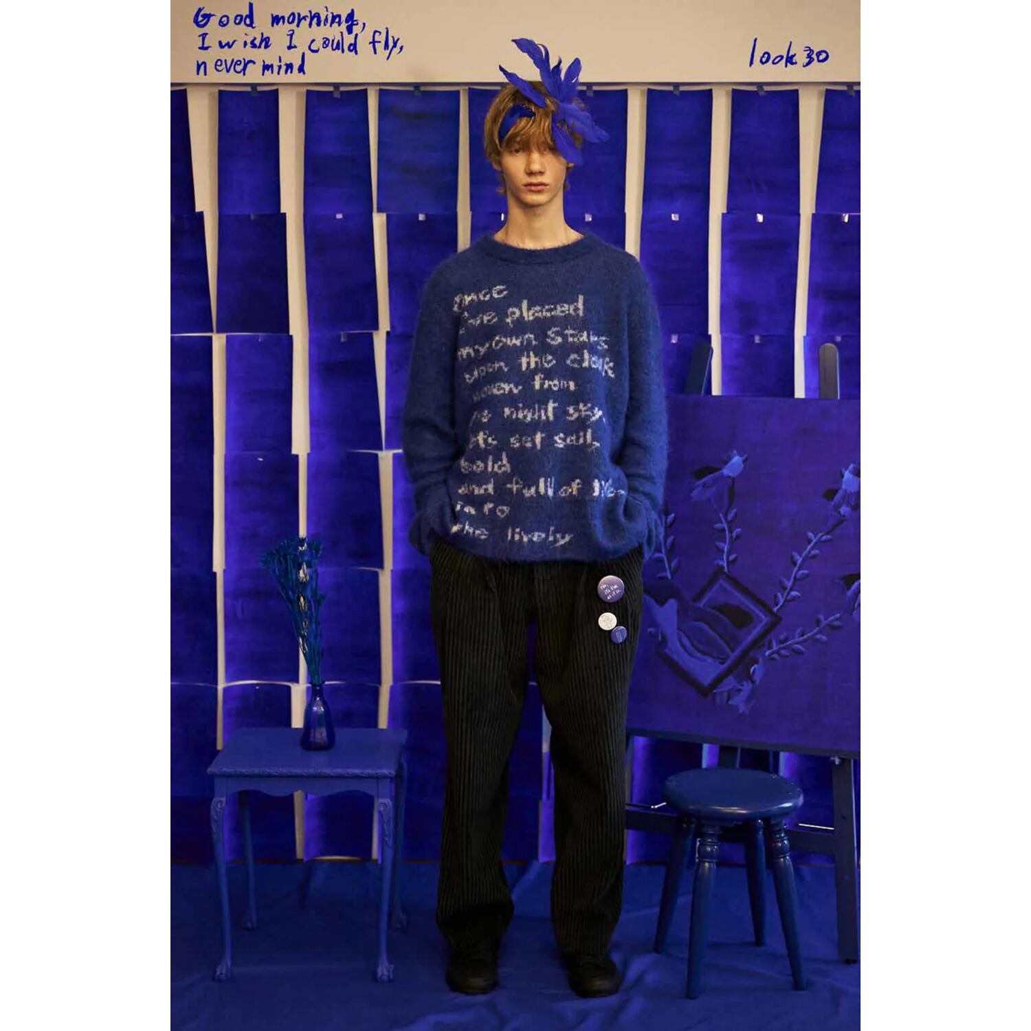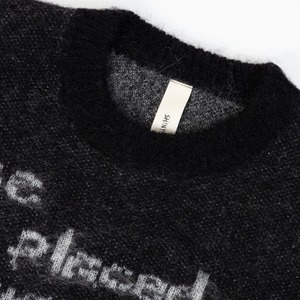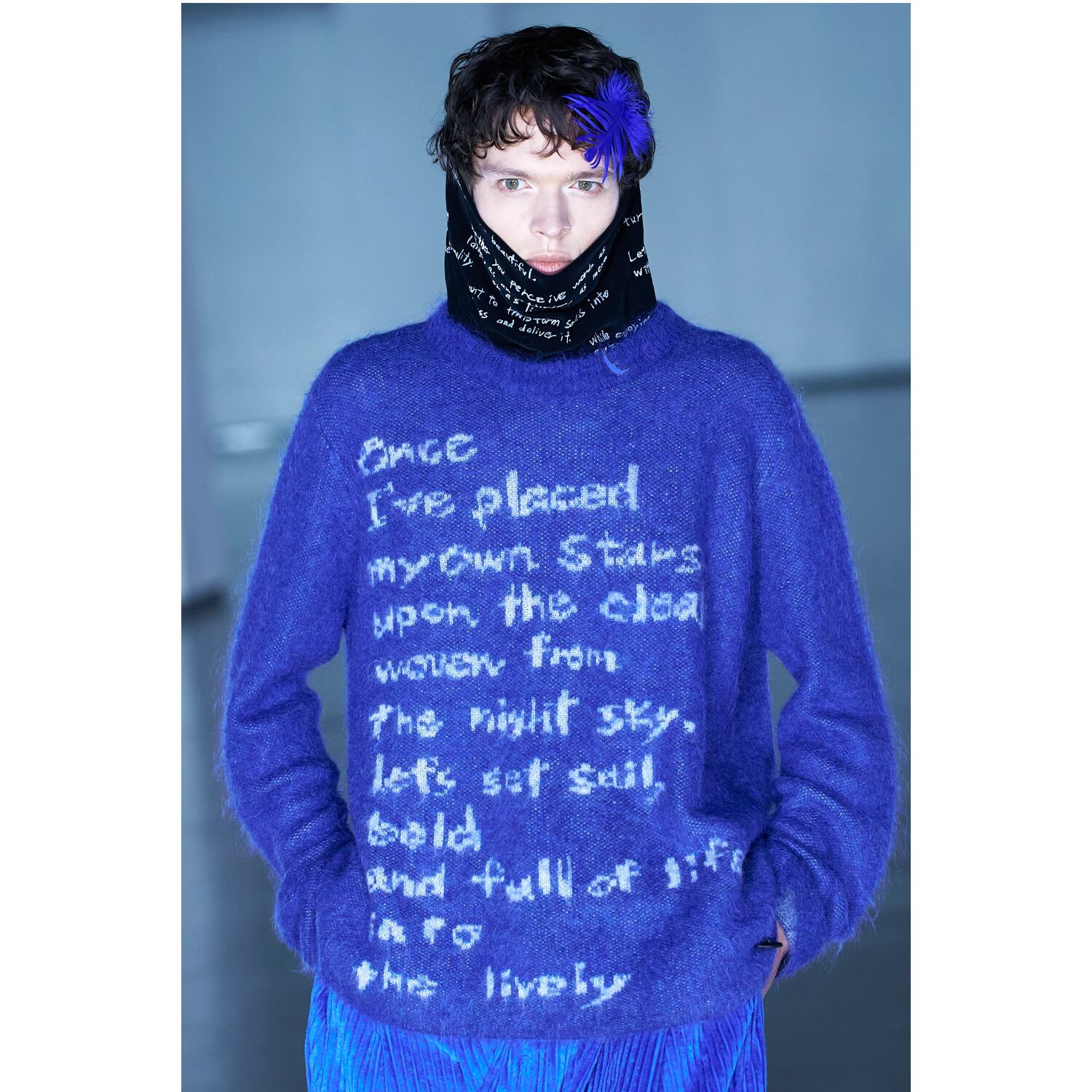 柔らかなモヘア混の糸で編み上げたニットです。軽さと温かさを兼ね備えた柔らかな着心地に仕上げています。「自分だけの光や個性を夜空に置き、勇気を持って新しい世界へ踏み出そう」という自由で冒険心にあふれたメッセージをフロントに。裾と袖はリブを付けないラフな仕立てで、レイヤードにも馴染みやすいデザインです。
