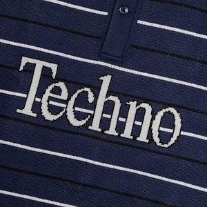 フロントに“Techno”のロゴを配したゲームニット。クラシックなボーダー柄とポロタイプのネックデザインを掛け合わせ、ストリートとスポーツのニュアンスをバランスよく落とし込んだ一着です。コットンとアクリルをブレンドした柔らかな素材感で、シーズンを問わず快適に着用できます。オーバーサイズシルエットで、1枚での着こなしはもちろん、アウターとのレイヤードでも存在感を発揮します。