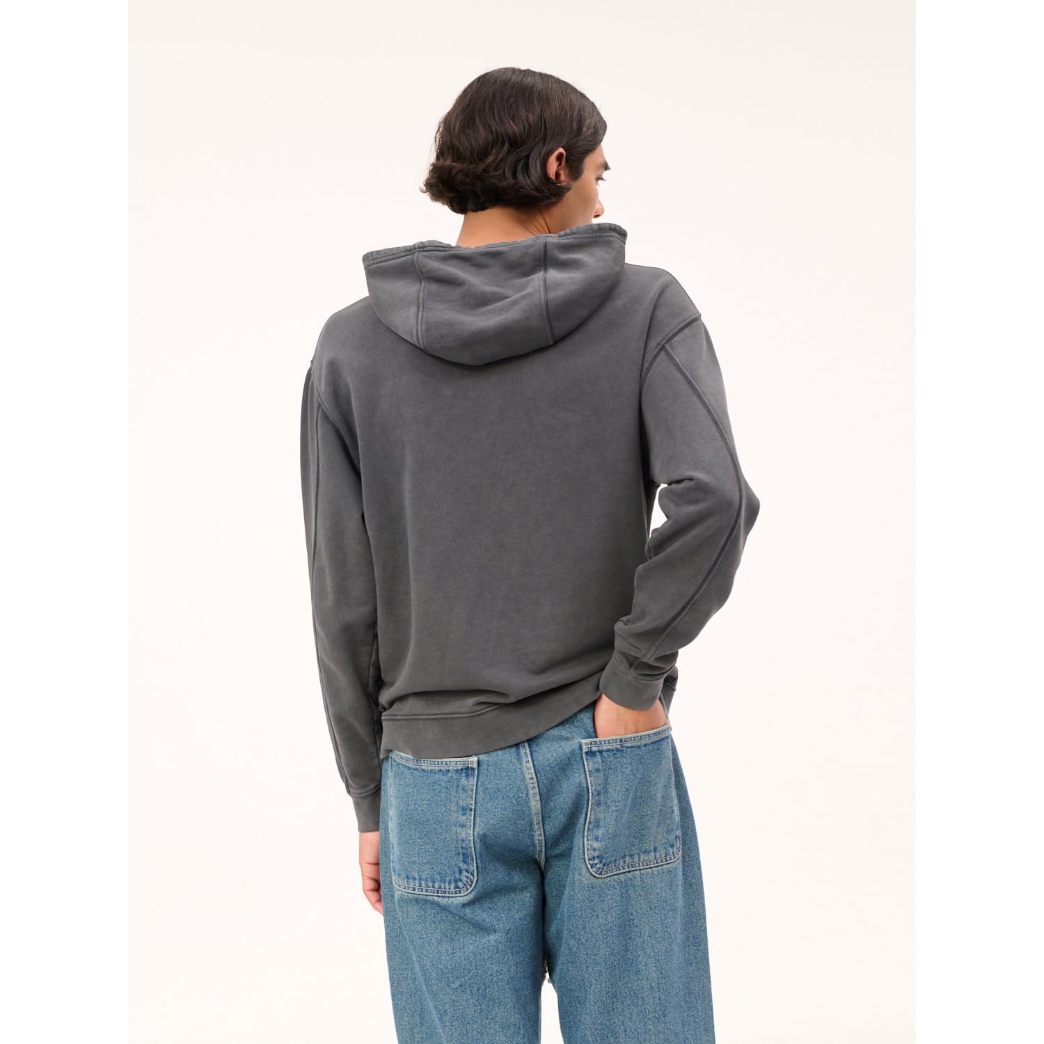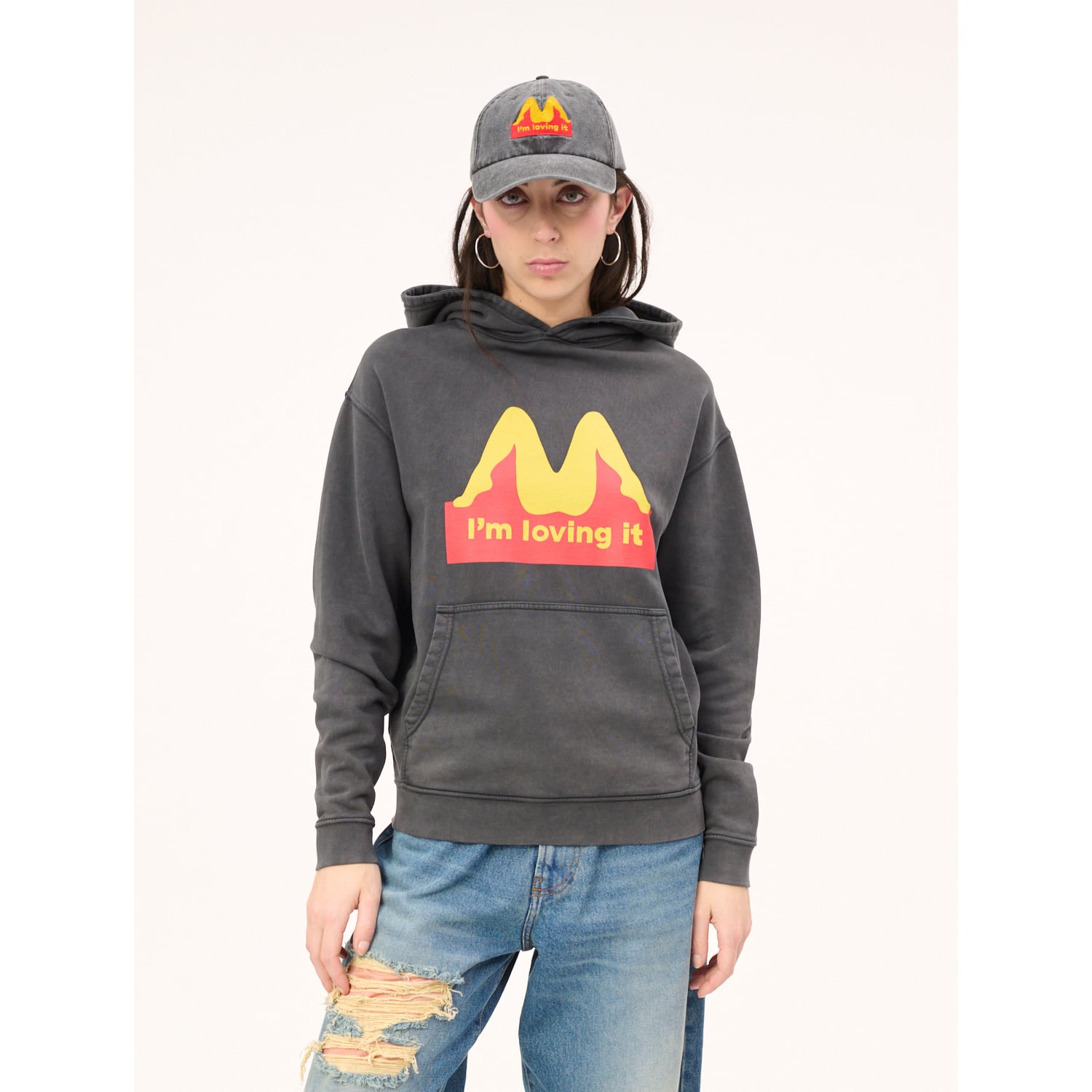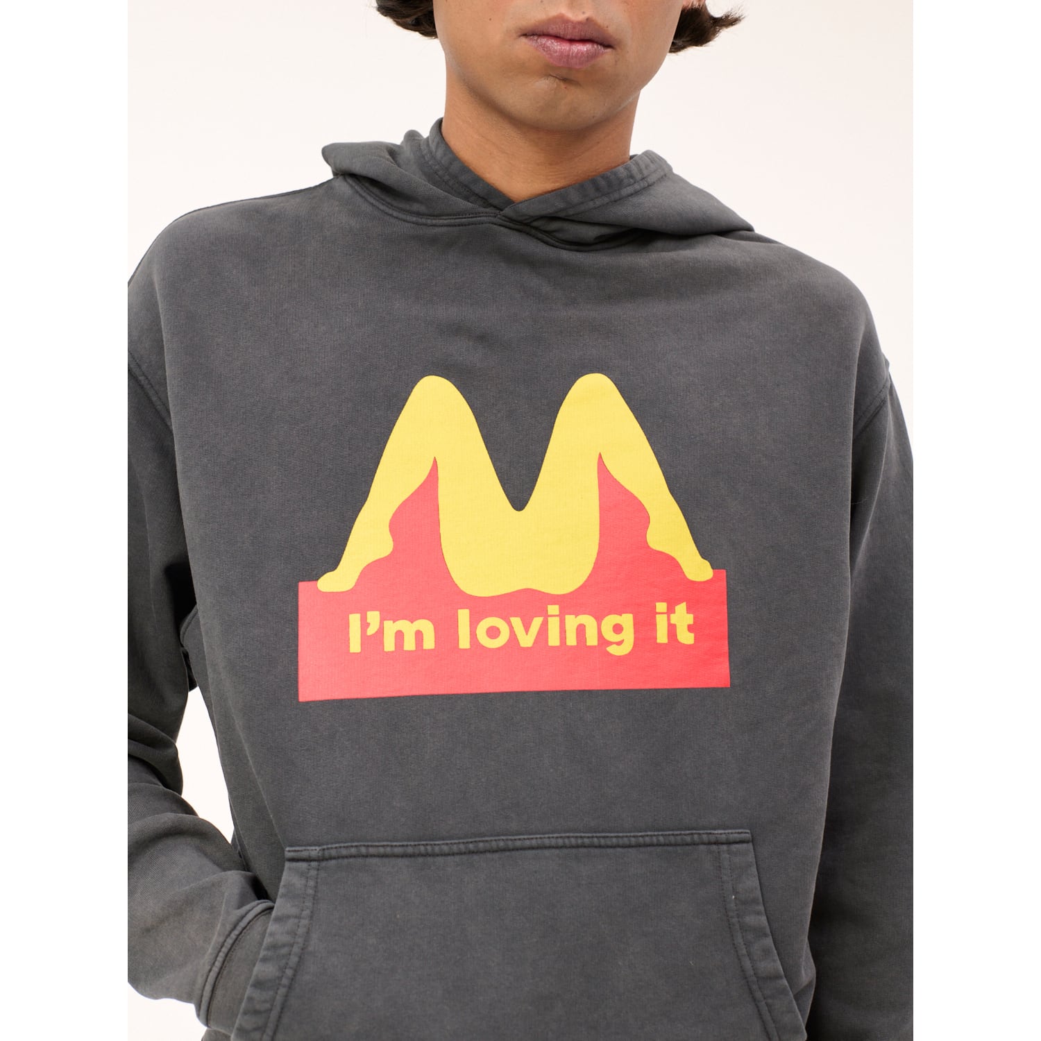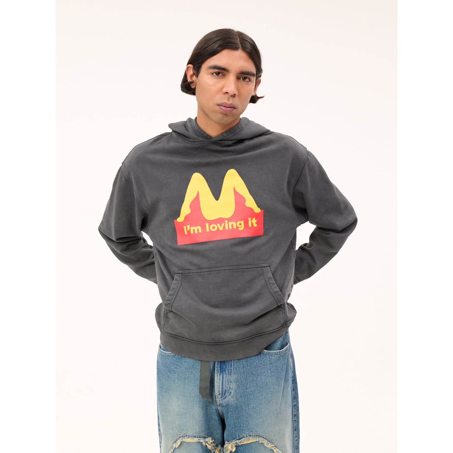 某ハンバーガーチェーンのロゴを大胆にサンプリング。カルネボレンテらしいユーモアを落とし込んだプルオーバーフーディです。カラーは程よくフェードが効いたヴィンテージブラック。オーガニックコットンで軽やかに仕立て、裏地はパイル織りでシーズン問わず爽やかに楽しめます。