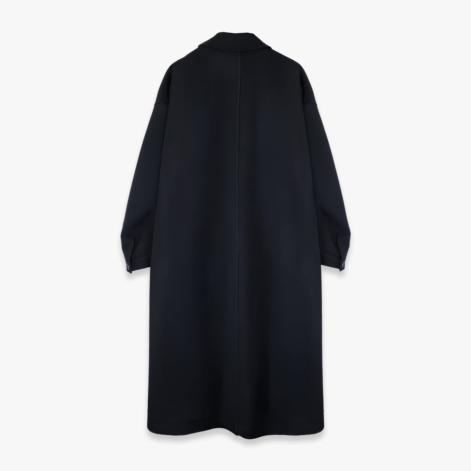 膝下まで覆うロング丈のダブルブレストコート。縦にすっと落ちる直線的なシルエットと、ゆとりのあるワイドな身幅で身体を包み込むように仕上げています。袖丈をやや抑えることで全体にリズムを与え、シンヤコヅカらしい存在感を体現しています。素材はダブルウィーブのウールツイル。重厚感がありながらも、上品さがあり、ブラックのメタルボタンが深い黒の生地にシックな華やかさを添えています。ダーツを効かせた三日月型のポケット。袖口は同型のボタンを二箇所設け、手首で留めるとまた違った雰囲気が味わえます。裏地のキュプラによる滑らかな着心地が相まって、着るだけで自然と品格が漂い、洗練された印象を演出してくれます。