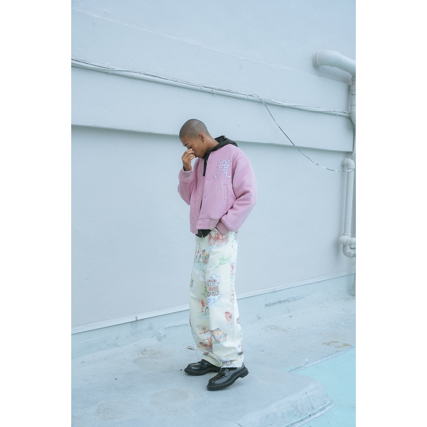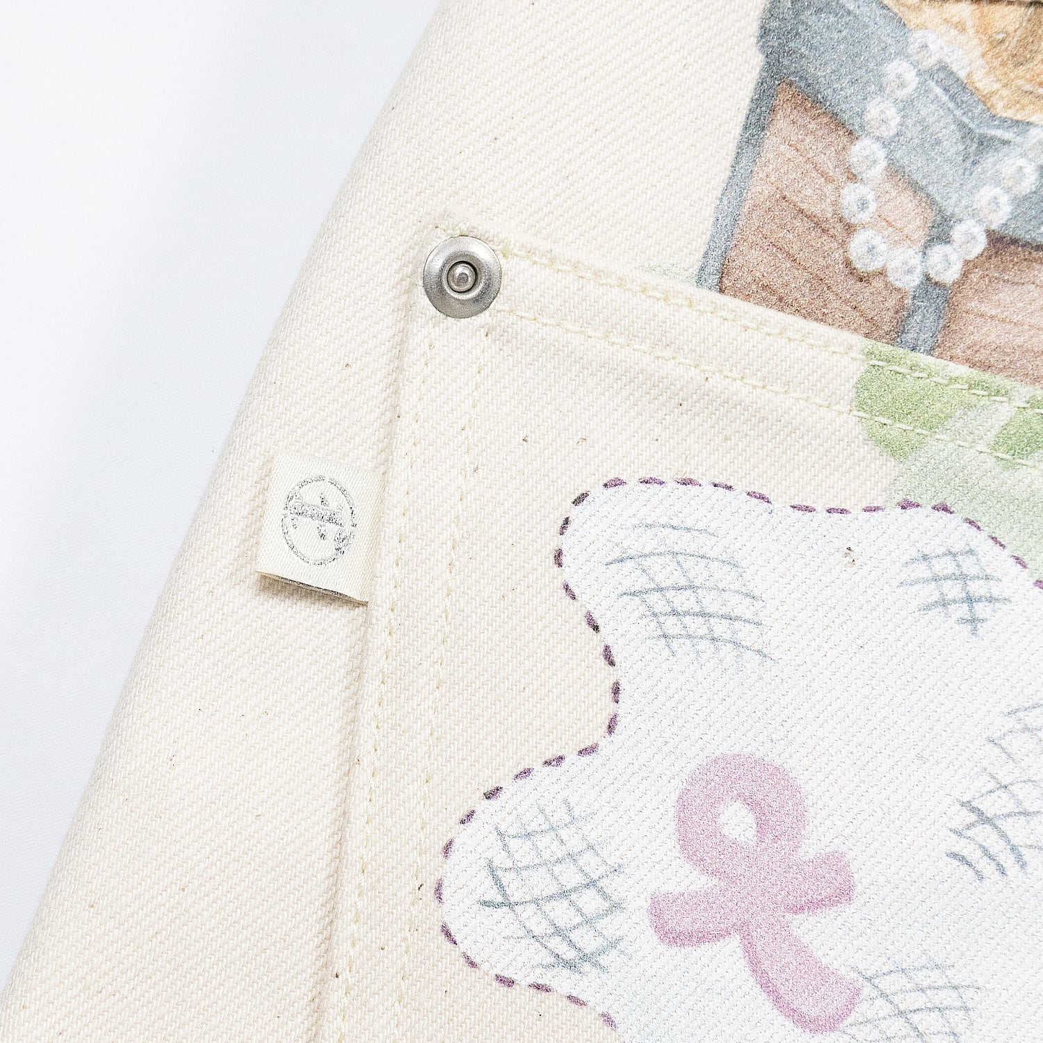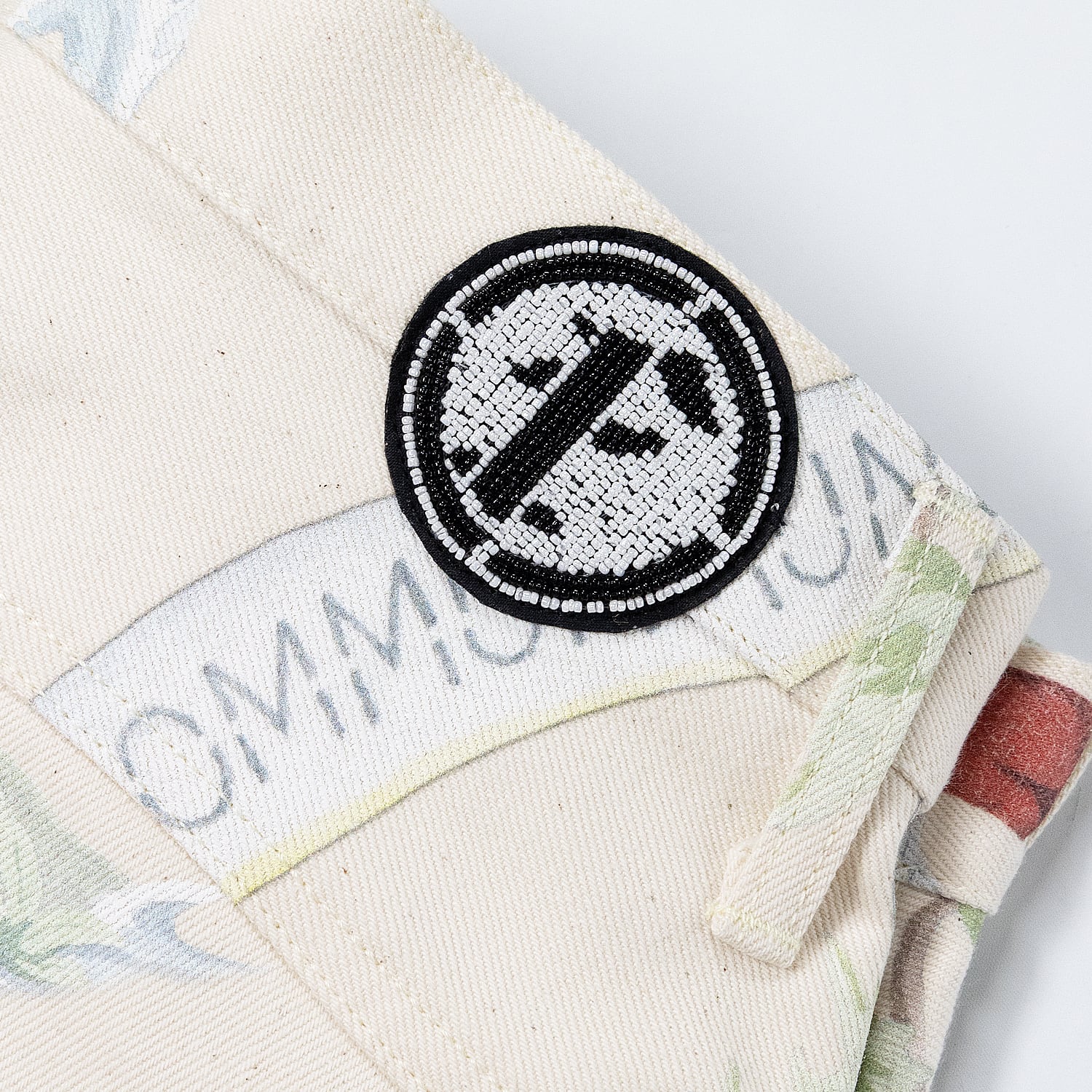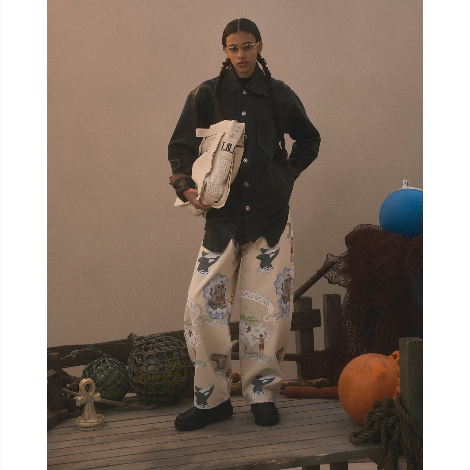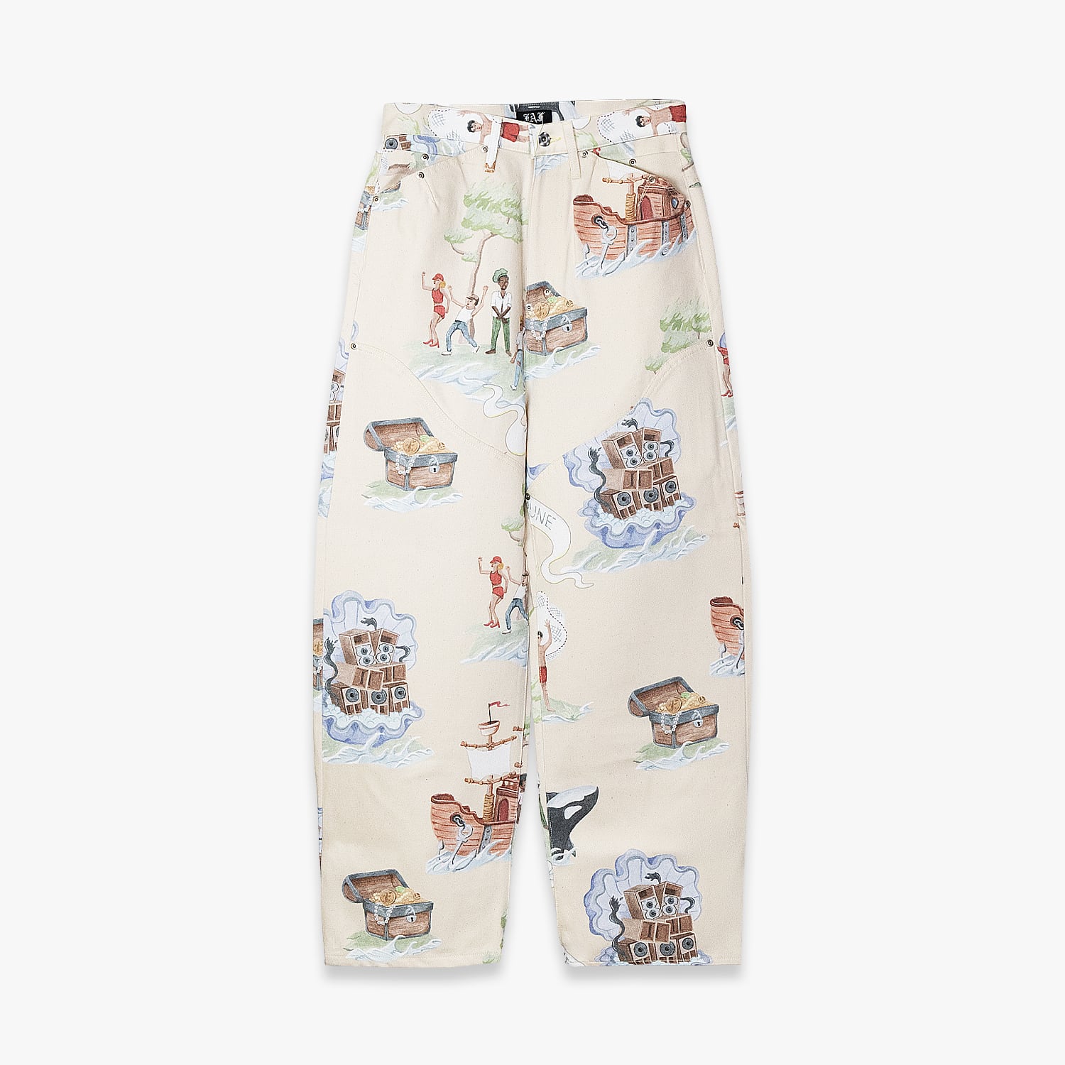 国産デニムを使用したタフなバギーデニムパンツ。リジットデニムならではの硬さと無骨さを残し、穿き込むほどに自分だけの風合いに育っていきます。ハイウエストでもローウエストでも着用可能なデザインで、気分やスタイルに合わせて楽しめます。カーペンターパンツ特有のディテールを取り入れ、ワークウェアの実用性とカジュアルな雰囲気を融合。島や海、宝の山、海賊船、サウンドシステムなど、FAFらしいアドベンチャーとカルチャーを落とし込んだ存在感あふれる一本です。