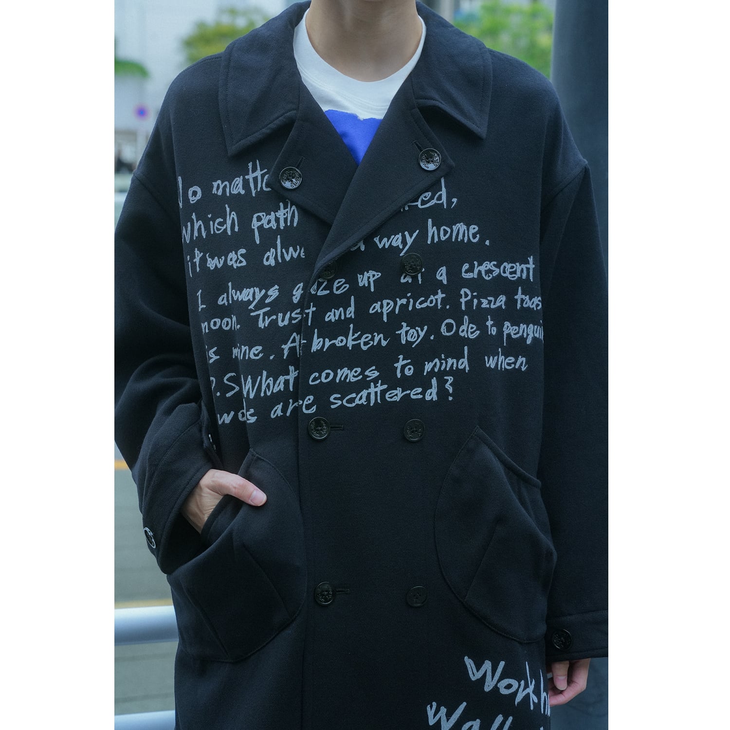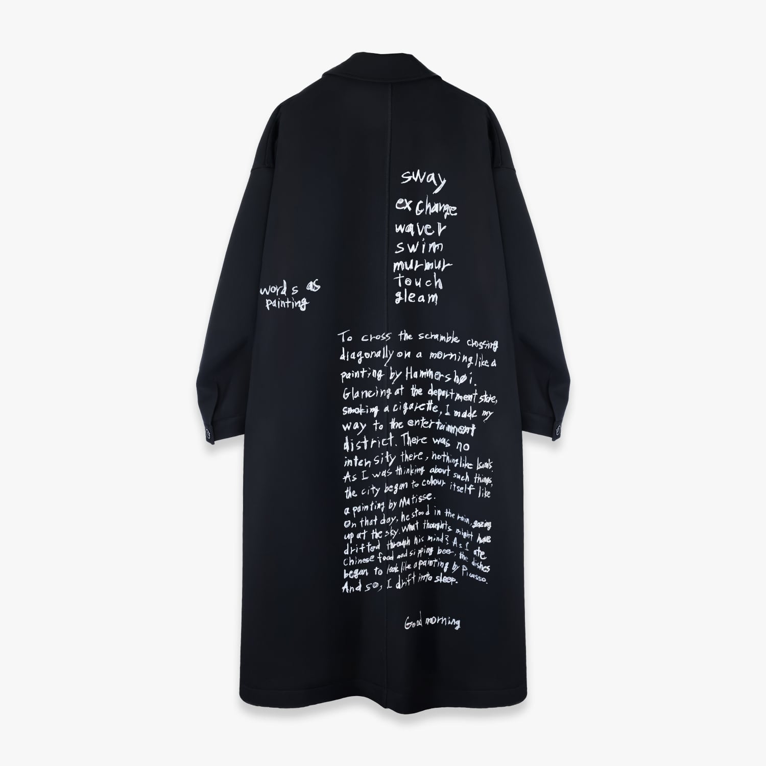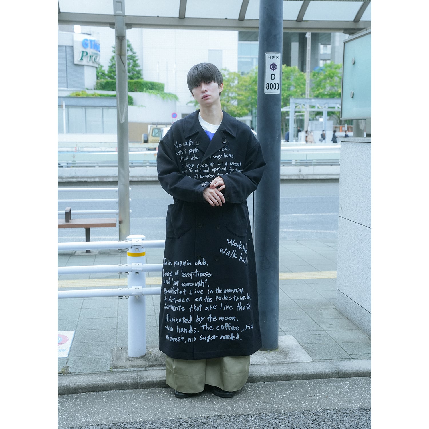 膝下まで覆うロング丈のダブルブレストコート。縦にすっと落ちる直線的なシルエットと、ゆとりのあるワイドな身幅で身体を包み込むように仕上げています。袖丈をやや抑えることで全体にリズムを与え、シンヤコヅカらしい存在感を体現しています。素材はダブルウィーブのウールツイル。重厚感がありながらも、上品さがあり、ブラックのメタルボタンが深い黒の生地にシックな華やかさを添えています。ダーツを効かせた三日月型のポケット。袖口は同型のボタンを二箇所設け、手首で留めるとまた違った雰囲気が味わえます。裏地のキュプラによる滑らかな着心地が相まって、着るだけで自然と品格が漂い、洗練された印象を演出してくれます。