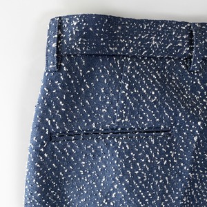 “綺麗なものを崩しても綺麗” センターラインをあえて崩すことで立体感を生むパンツ。プレスで仕上げたすっきりとしたシルエットが動きによって様々な表情を見せます。生地はブランド定番のデニムを用い、ヨコ糸部分のみを針で引っ掻くニードルパンチ加工で凹凸を柄のように表現しています。