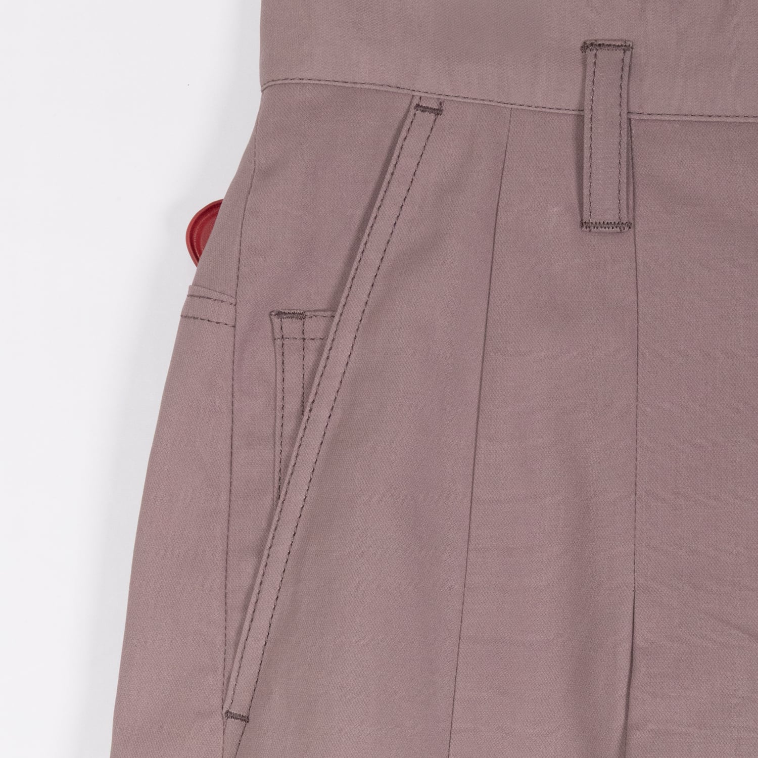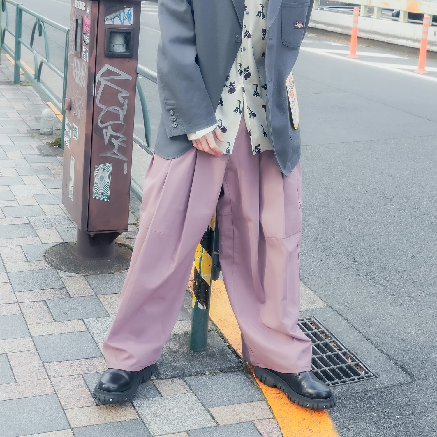 深い2タックと中縫いを長めに入れ、腰回りをすっきりとさせながら大胆な太さを出しています。
