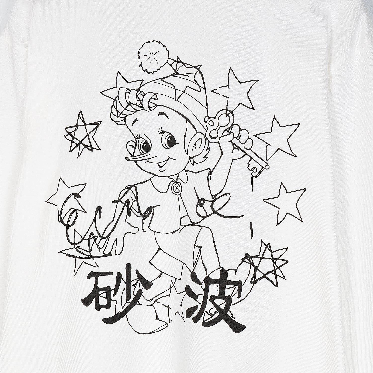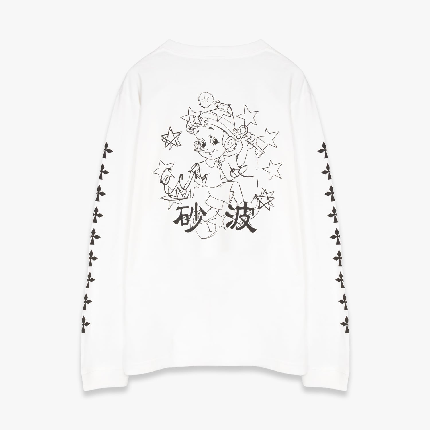 バックに配された「砂波」の文字とピノキオを思わせるグラフィック、そして両袖に連なる象徴的なモチーフは、あえて時代錯誤な違和感を生むように緻密に計算されています。