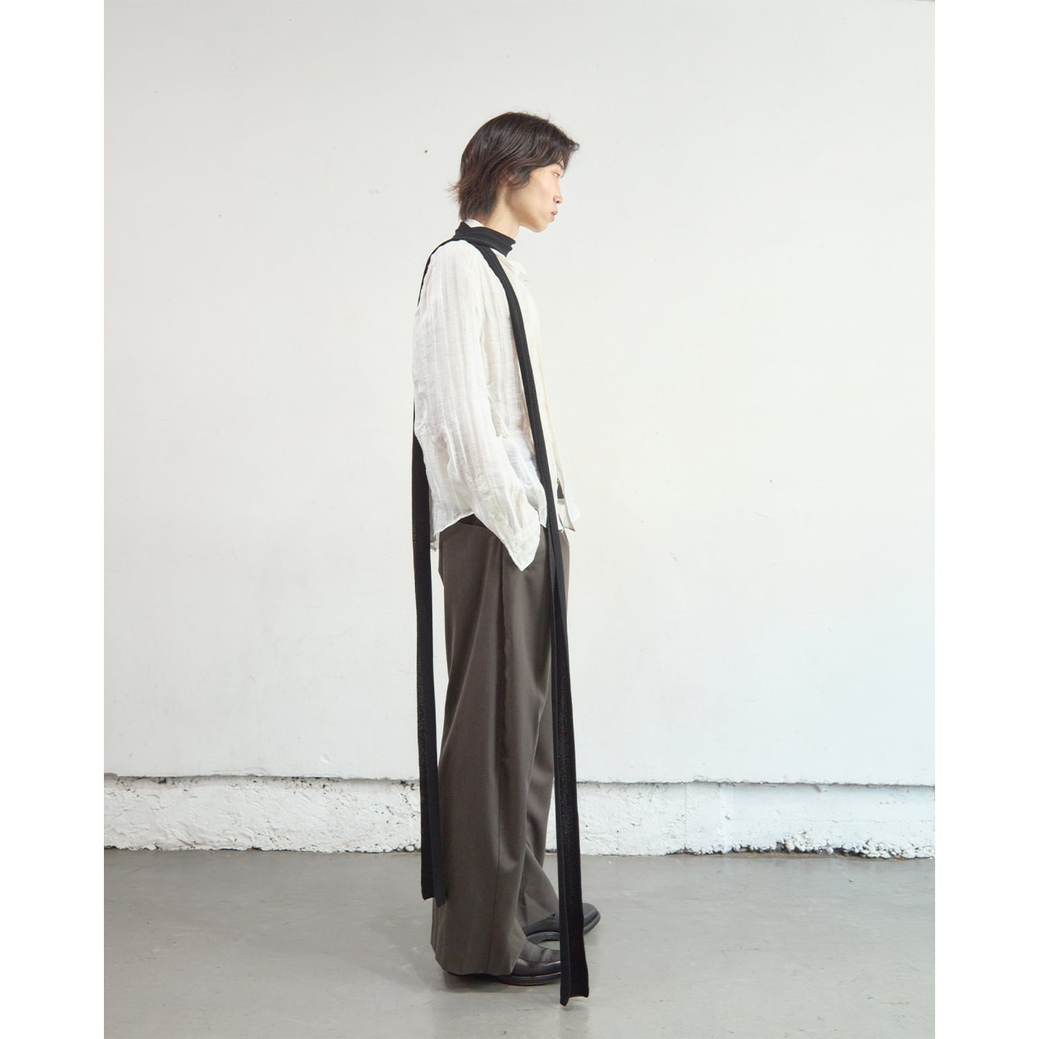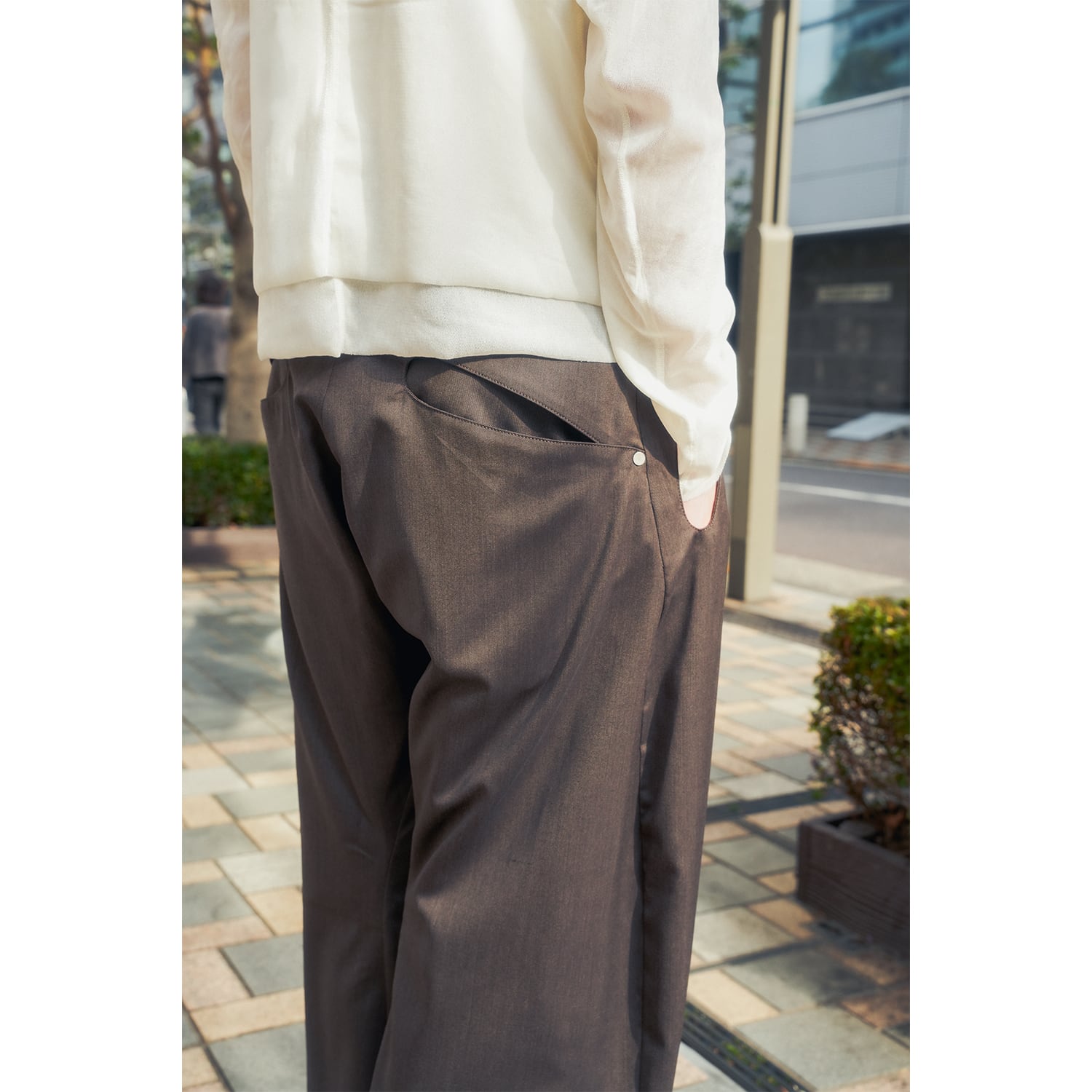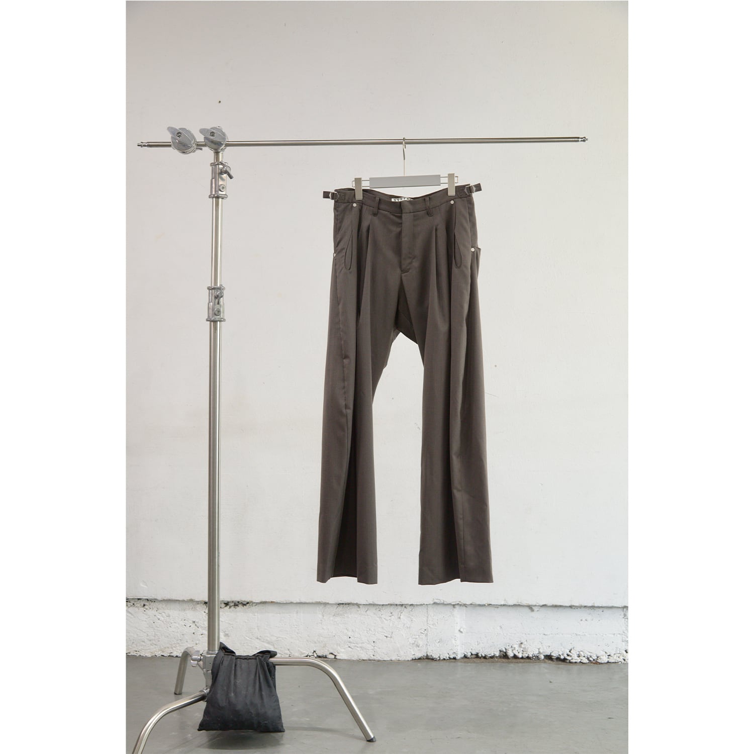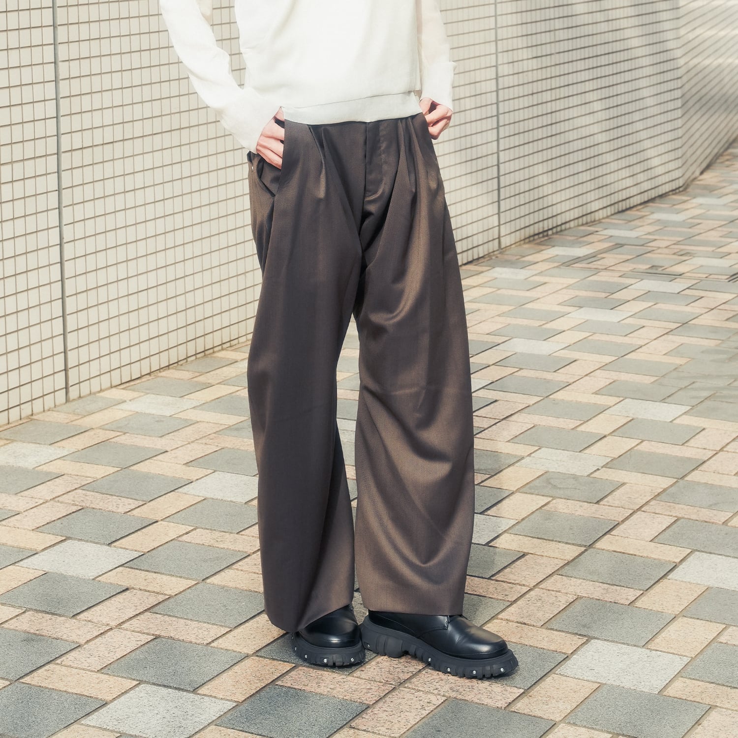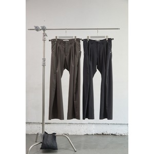 ブランドを象徴するカーブレッグシルエットのタックトラウザー。