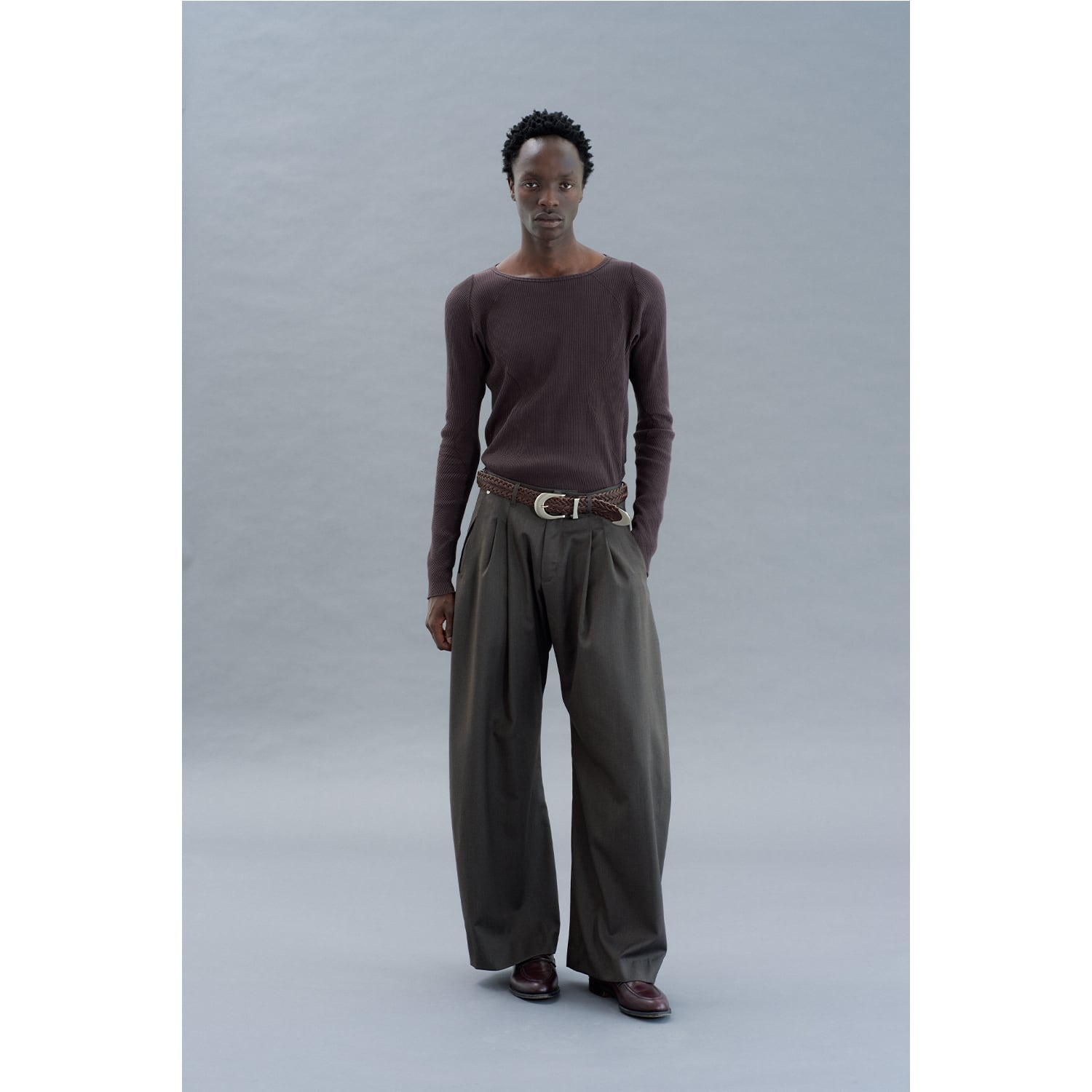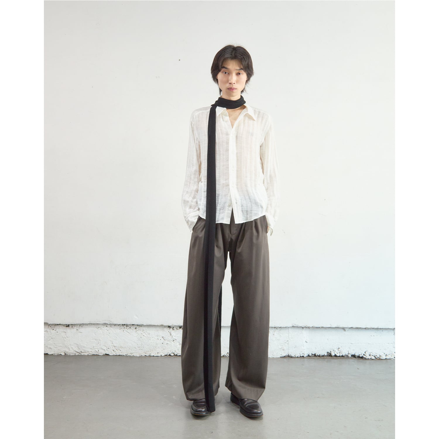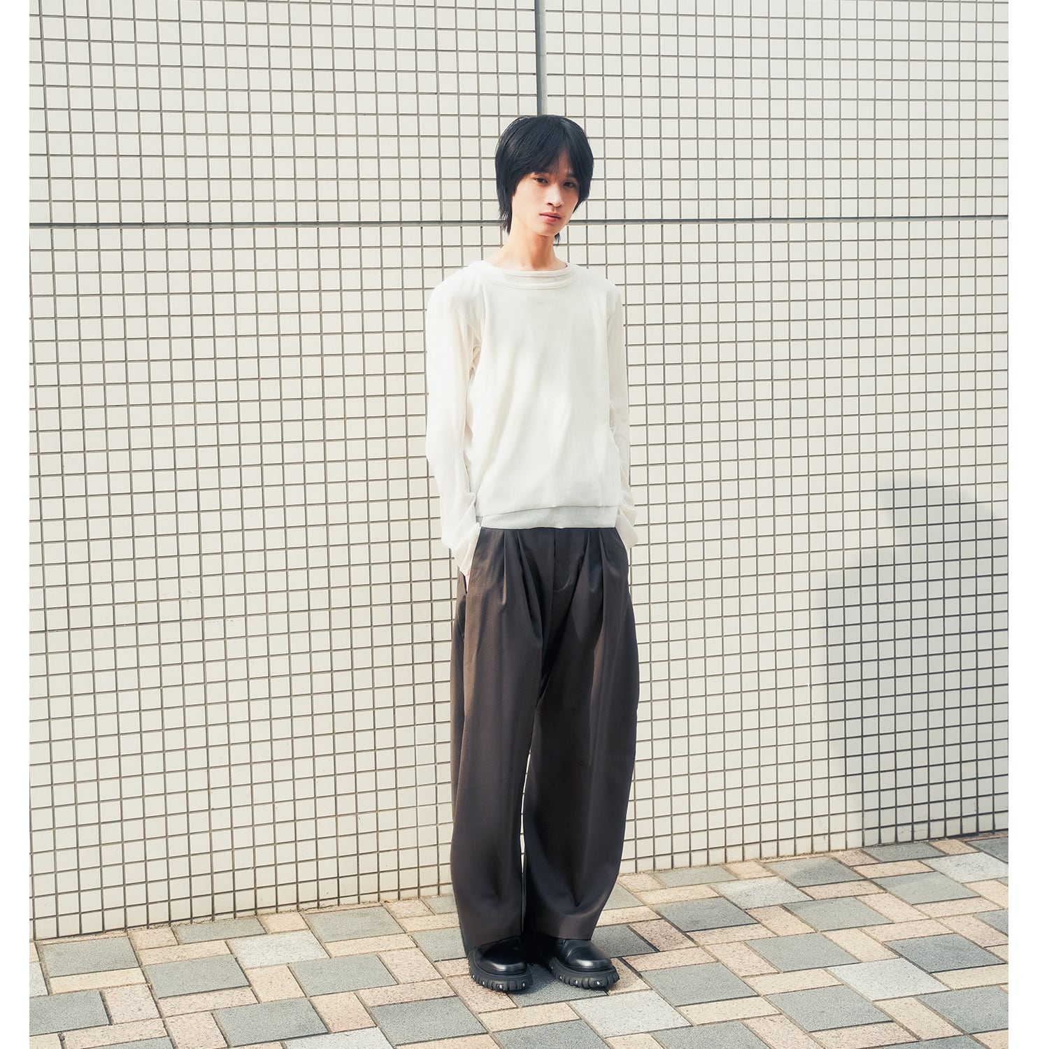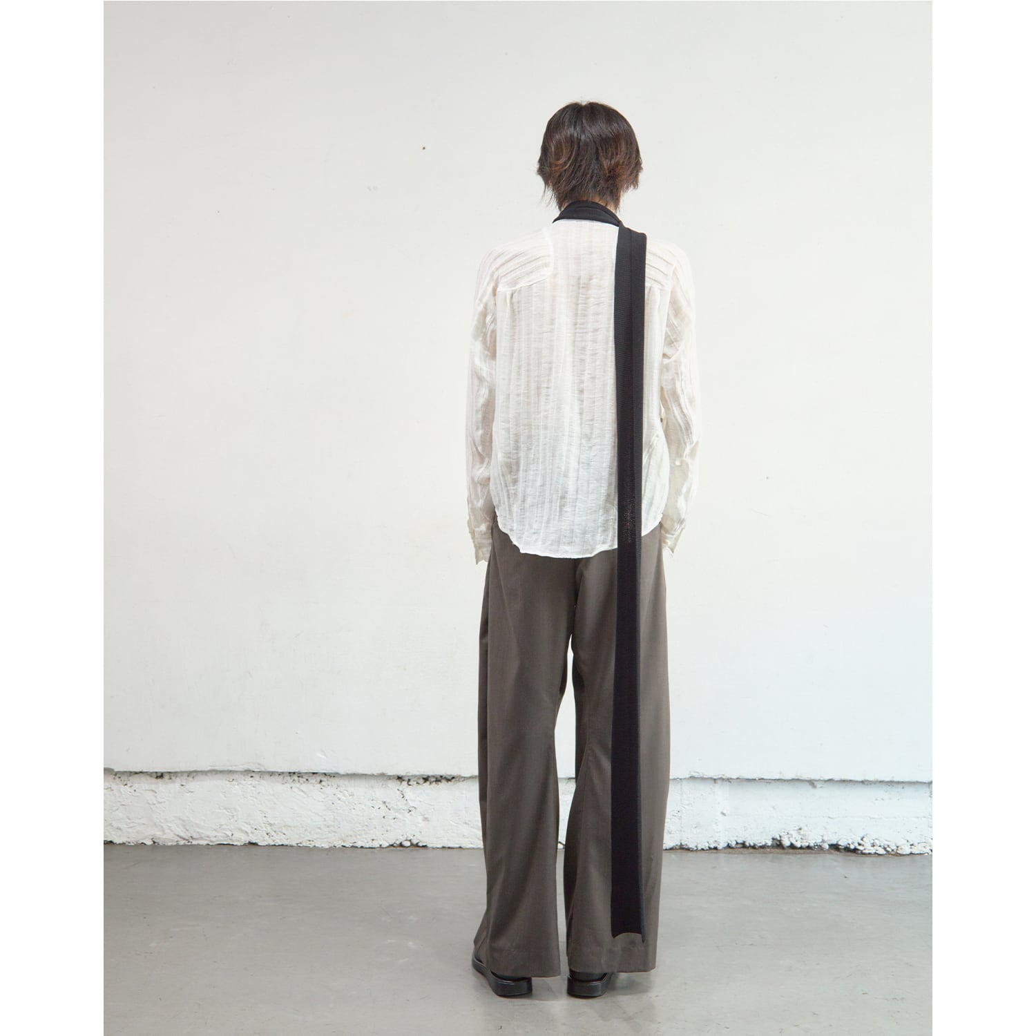 ブランドを象徴するカーブレッグシルエットのタックトラウザー。