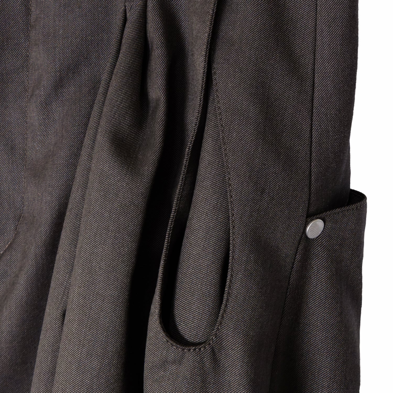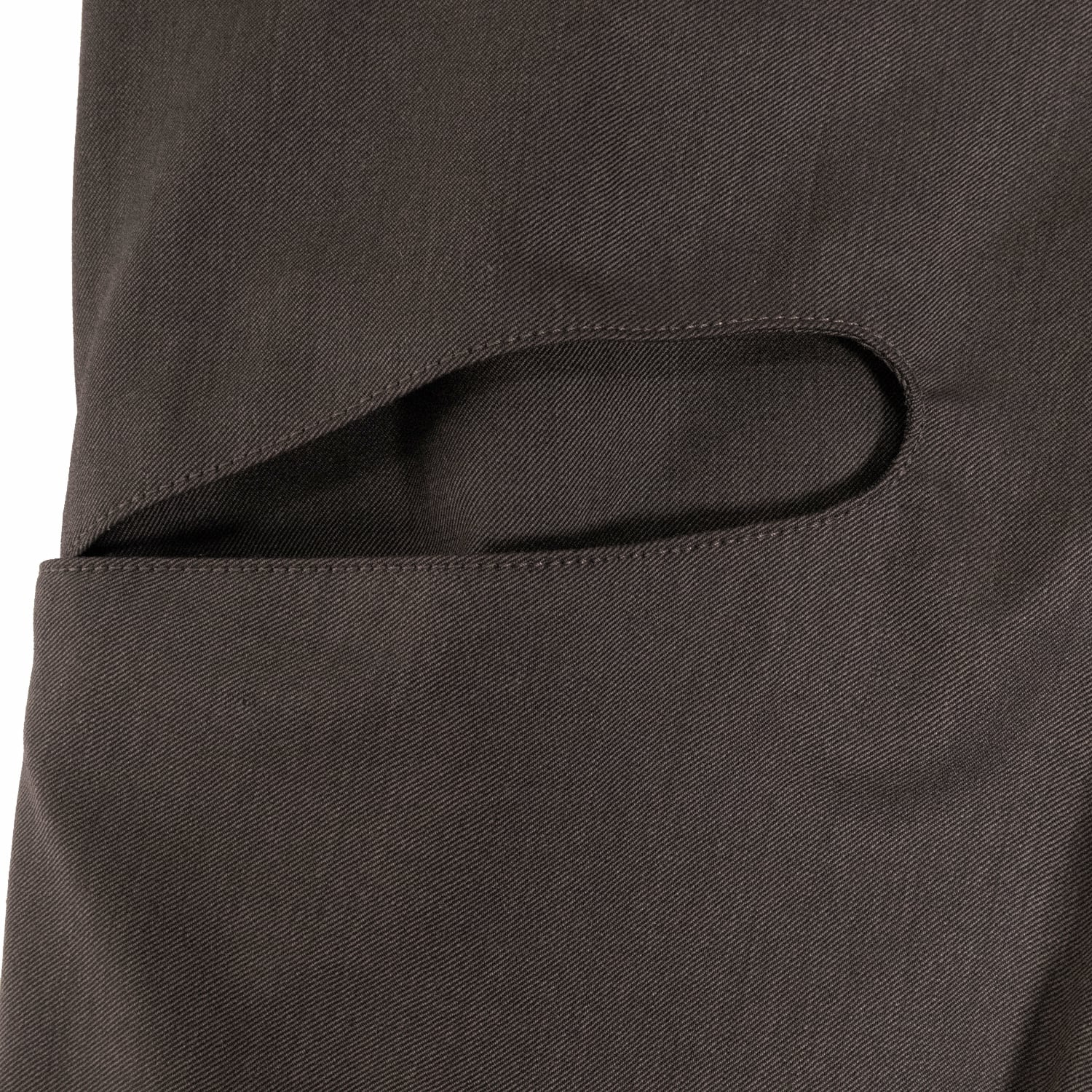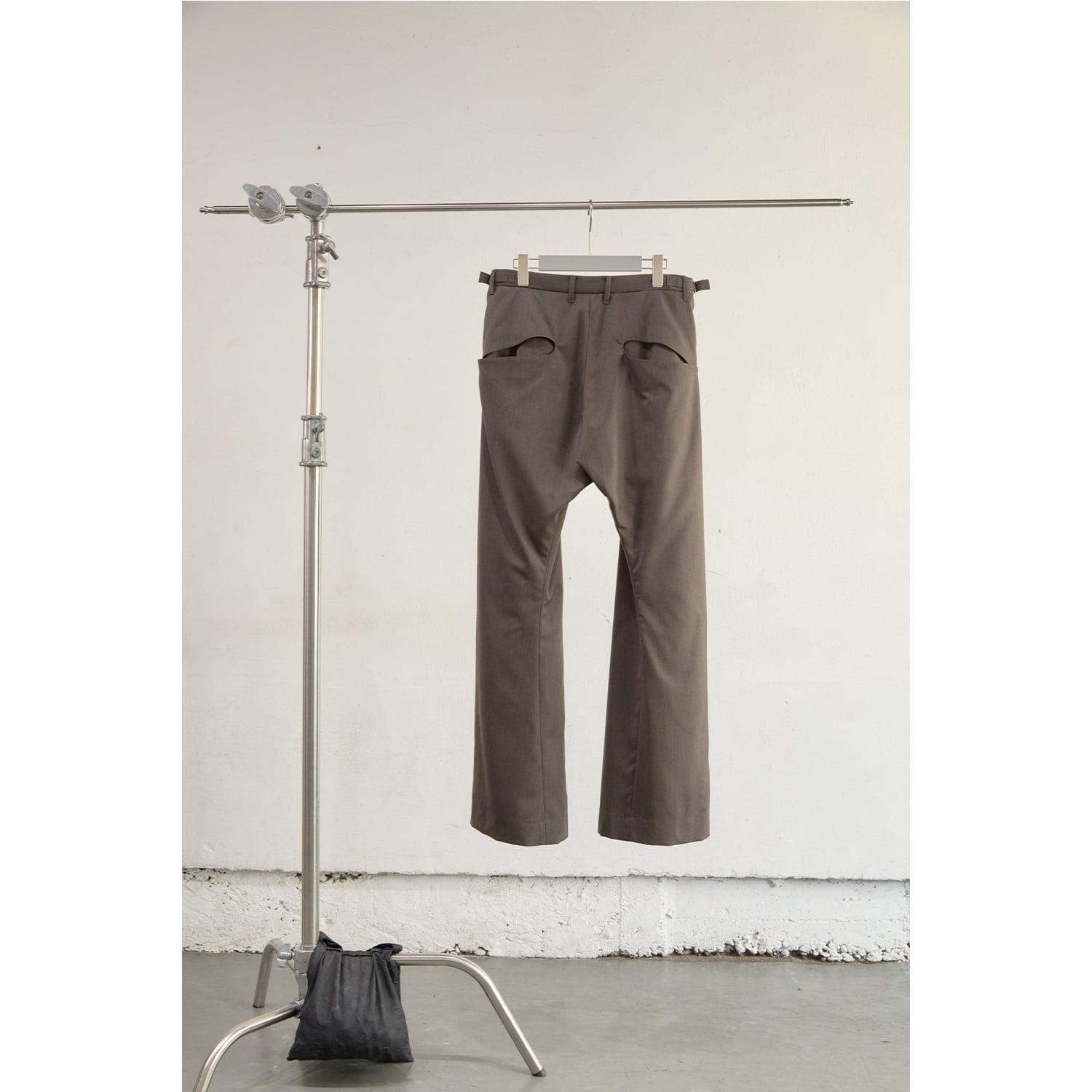 深く取られた2タックの構造を活かしたミニマルなカットアウトポケットや、オリジナルパターンの彫刻を施した精密なリベットワークなど、装飾を機能美へと昇華させたストイックなディテールが目を引きます。