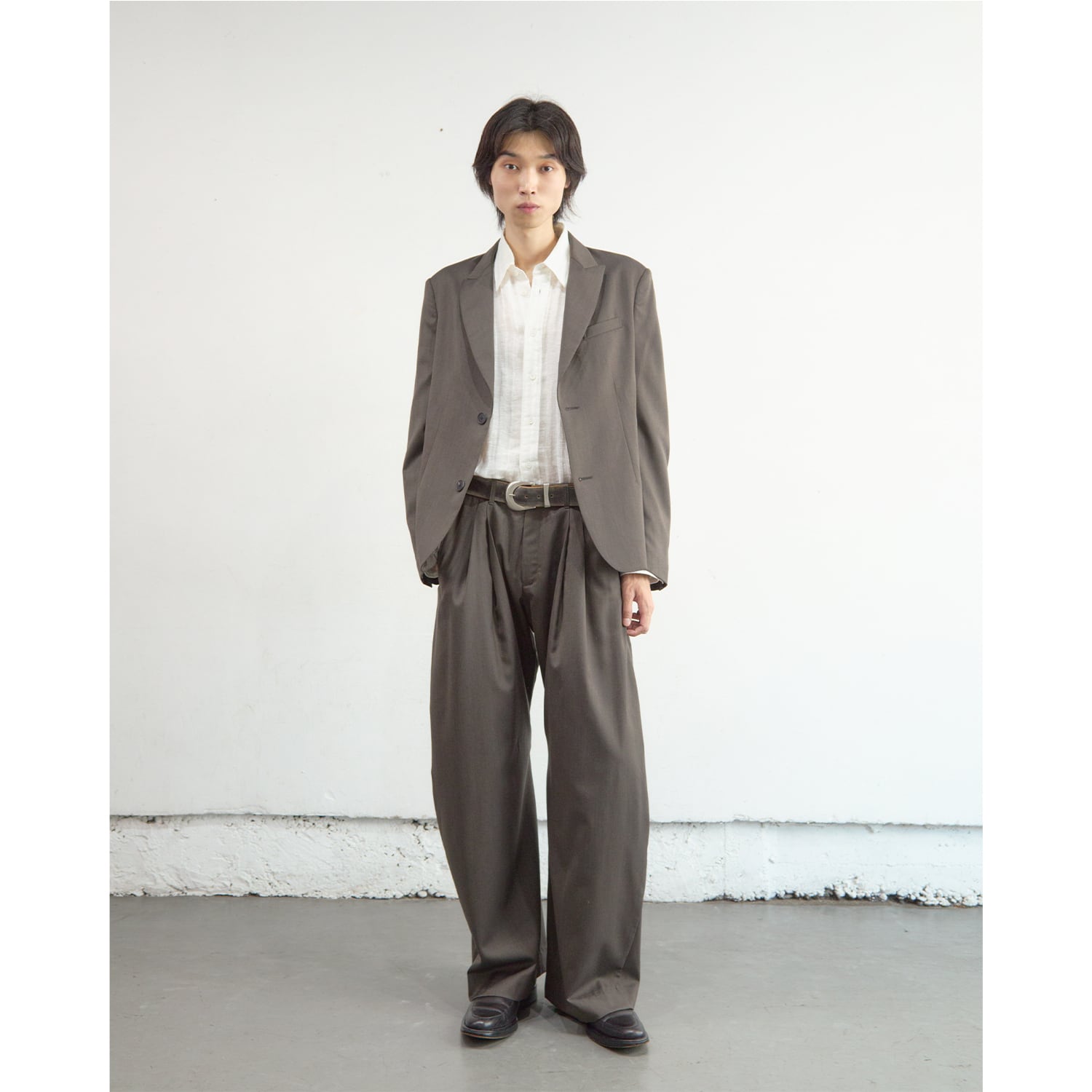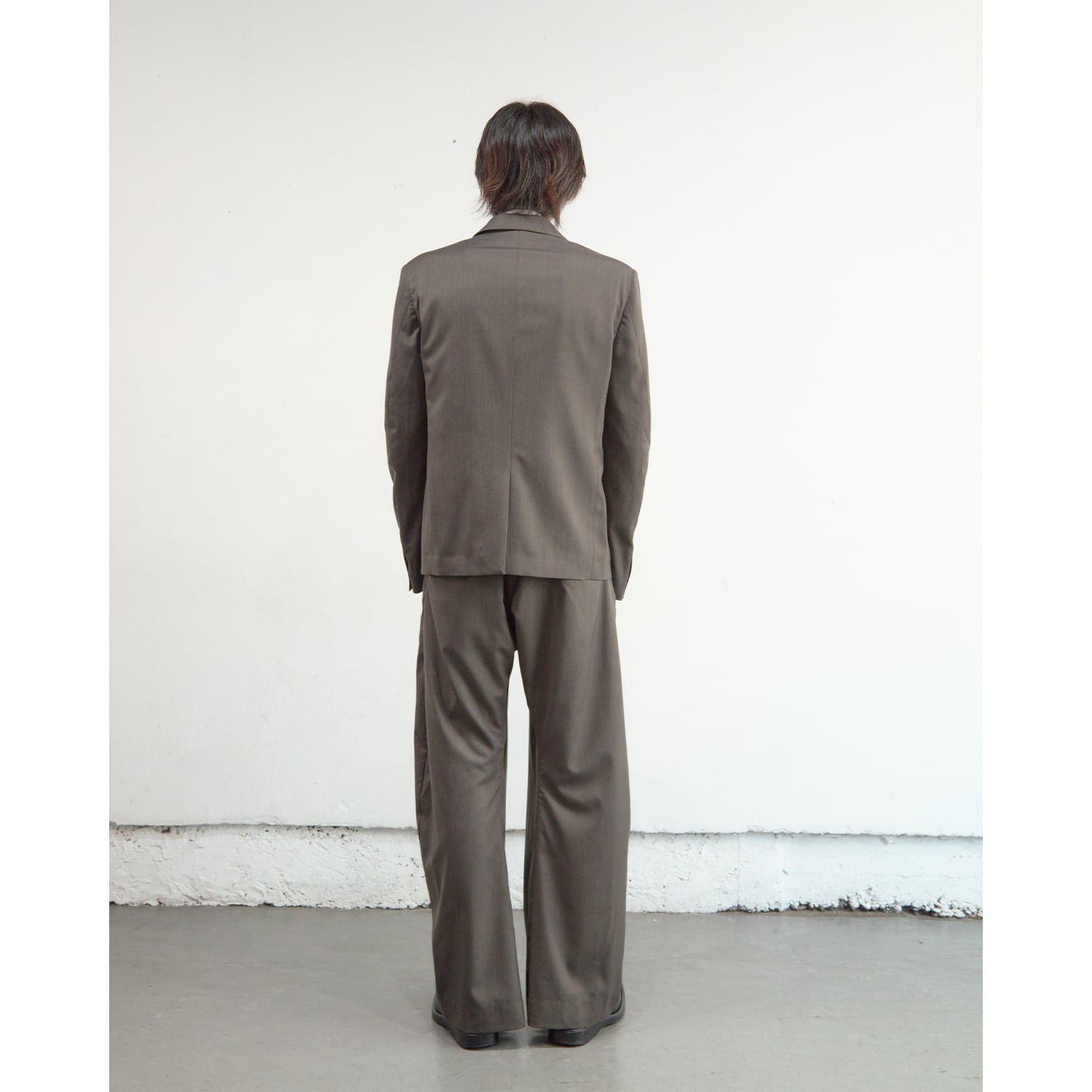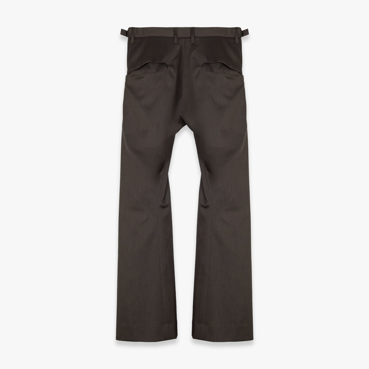 深く取られた2タックの構造を活かしたミニマルなカットアウトポケットや、オリジナルパターンの彫刻を施した精密なリベットワークなど、装飾を機能美へと昇華させたストイックなディテールが目を引きます。