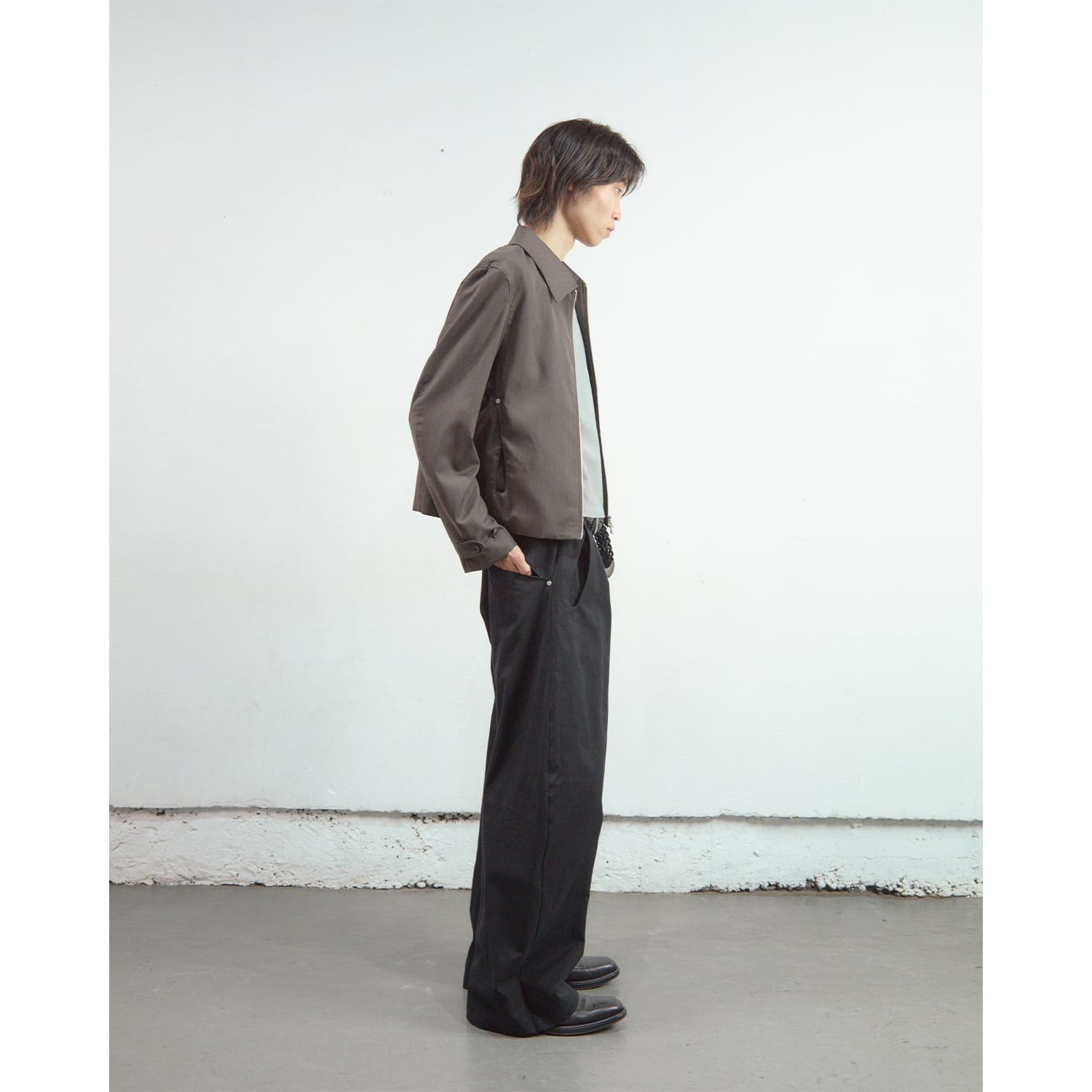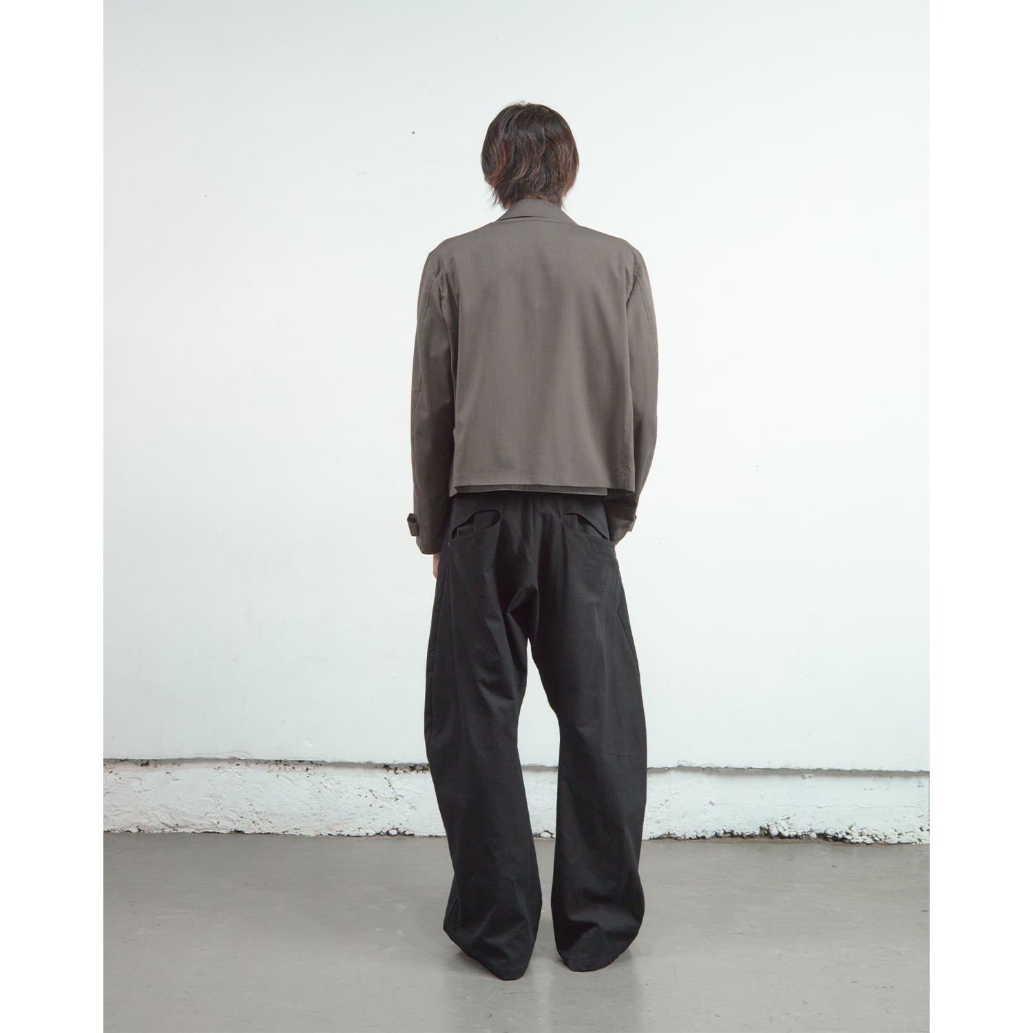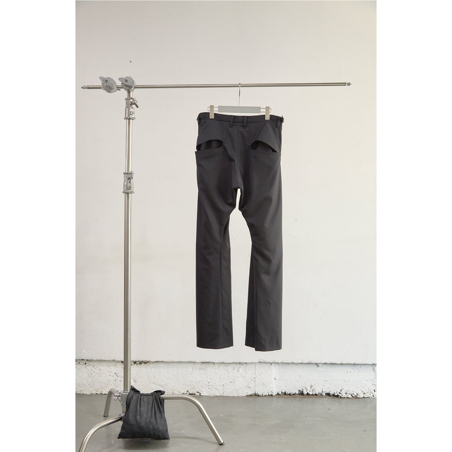 深く取られた2タックの構造を活かしたミニマルなカットアウトポケットや、オリジナルパターンの彫刻を施した精密なリベットワークなど、装飾を機能美へと昇華させたストイックなディテールが目を引きます。