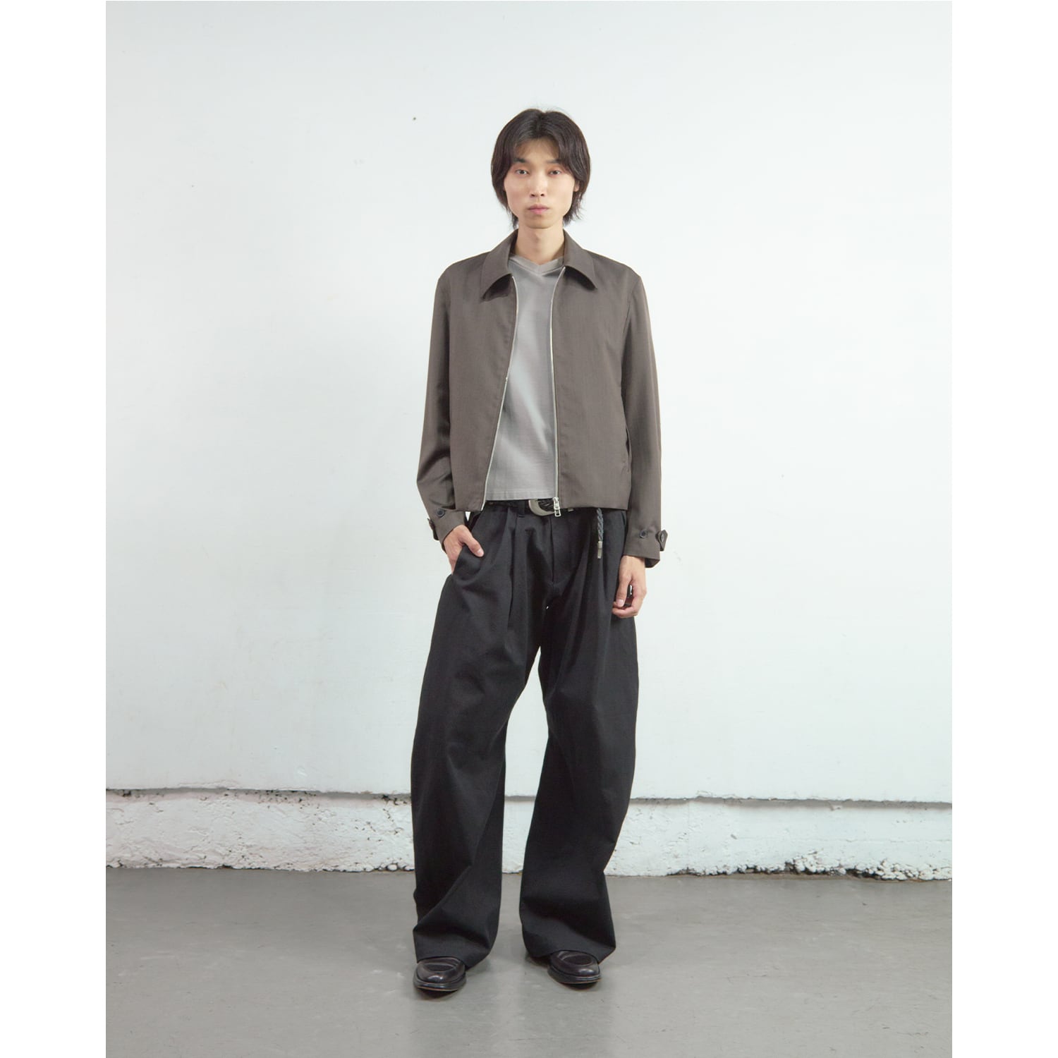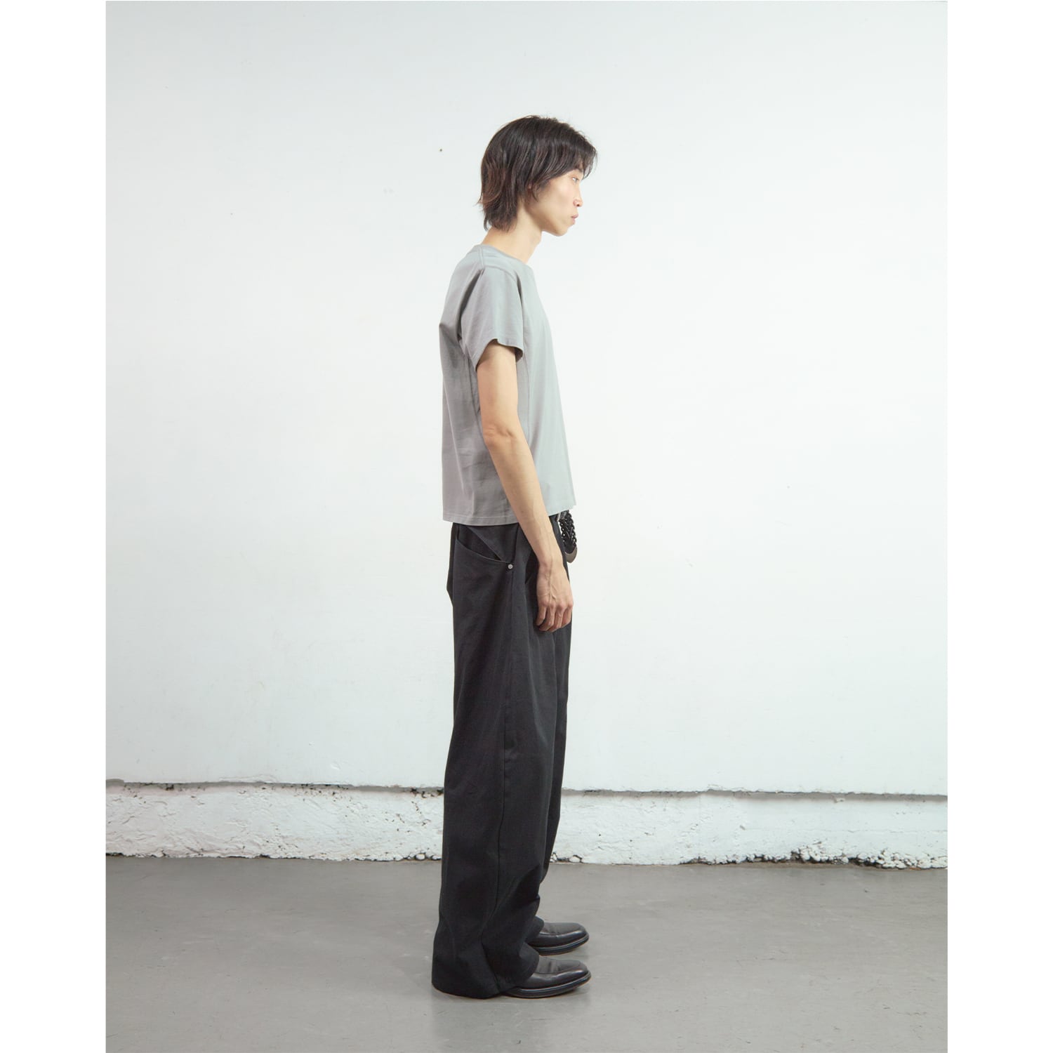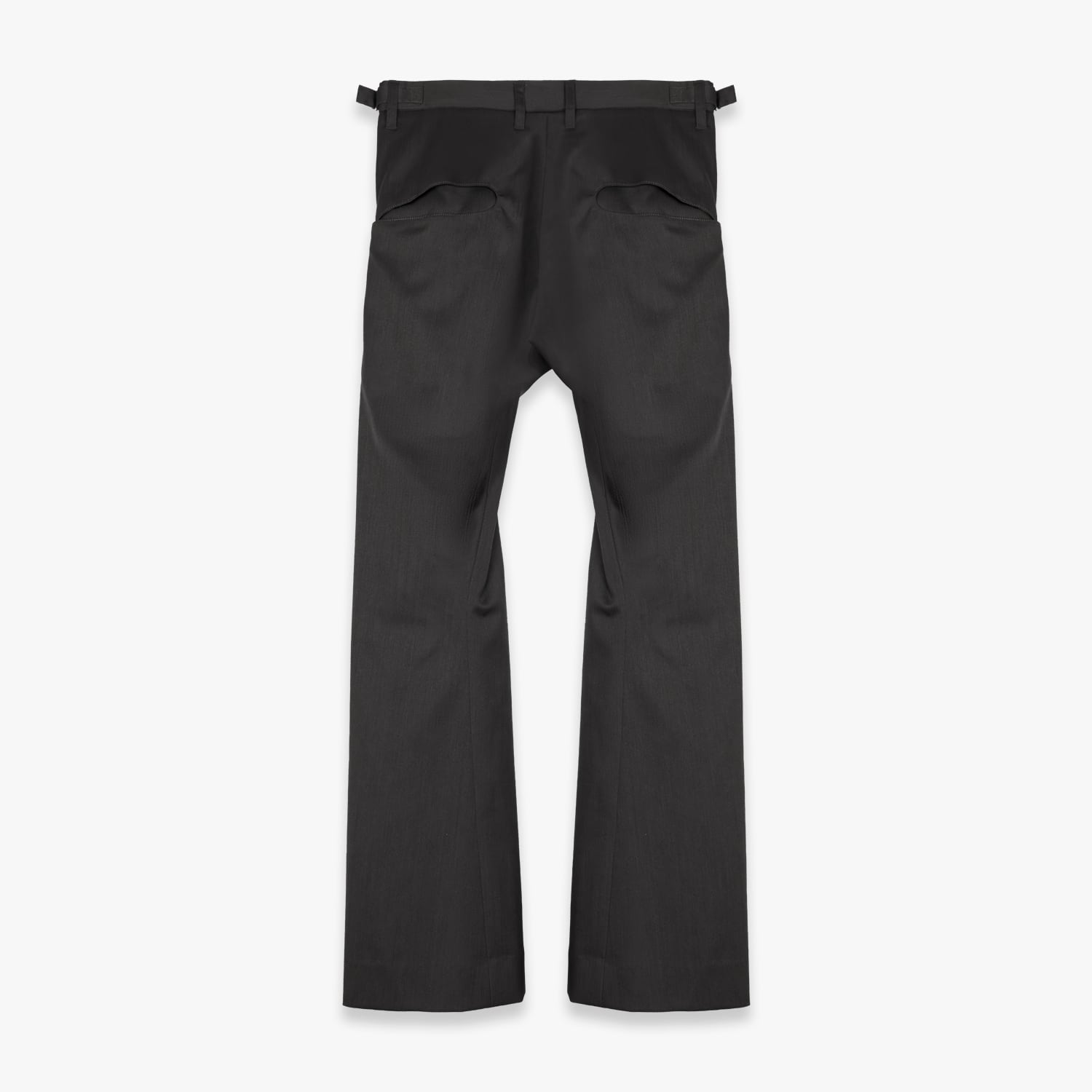 深く取られた2タックの構造を活かしたミニマルなカットアウトポケットや、オリジナルパターンの彫刻を施した精密なリベットワークなど、装飾を機能美へと昇華させたストイックなディテールが目を引きます。