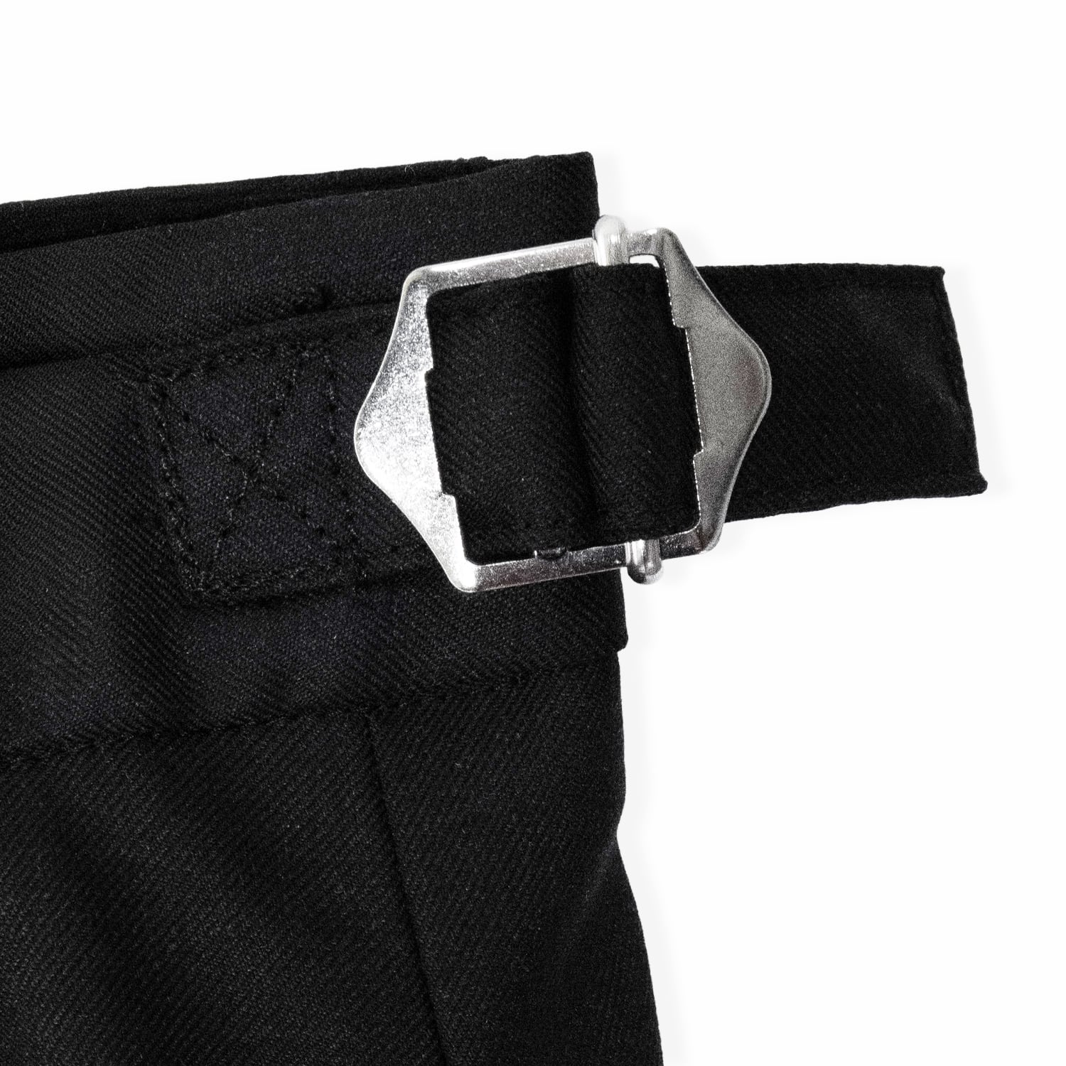 腰回りにはベルトなしでもウエスト調整ができるサイドバックルを備え、無骨な表情が魅力の本水牛ボタンを採用。さらに裏地(膝裏)を付けることで、ウール特有のチクつきを抑え、なめらかな足通りと快適な履き心地を実現しています。