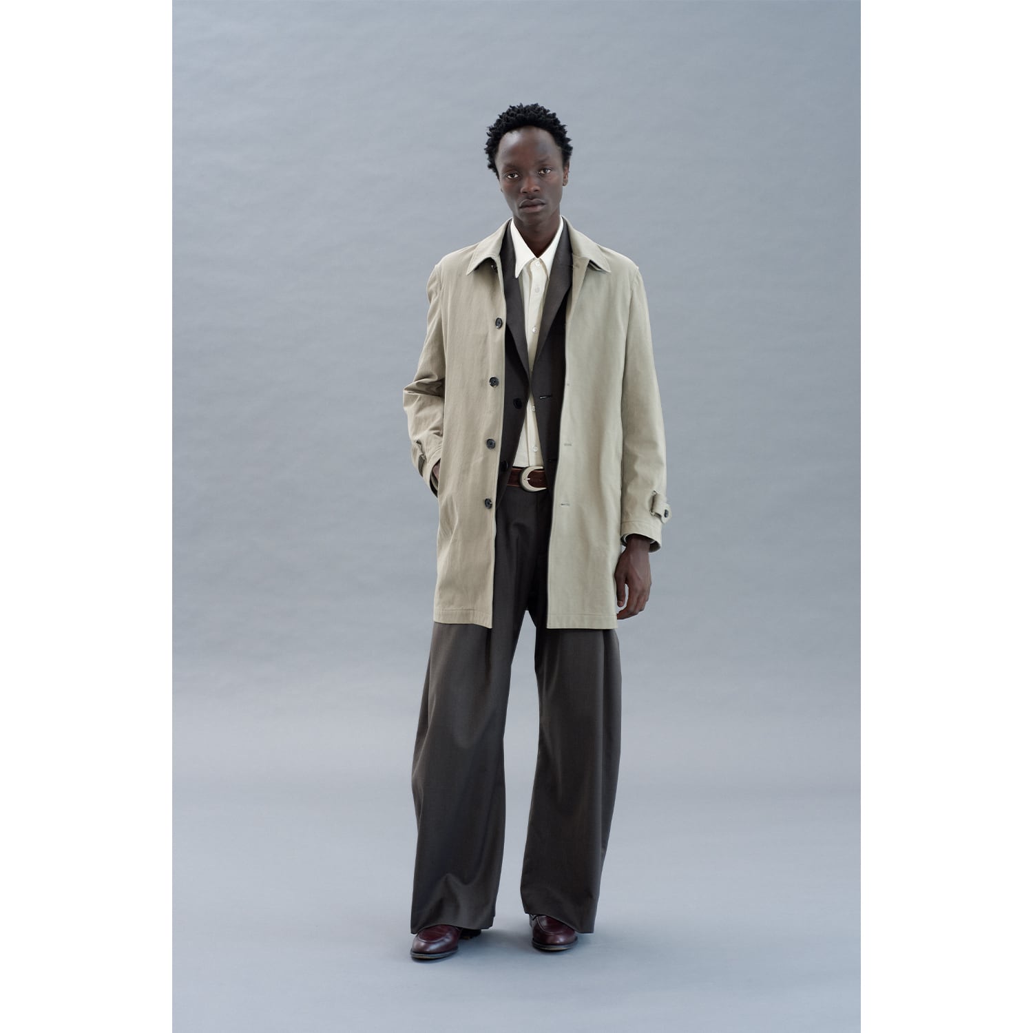 ブランドを象徴するカーブレッグシルエットのタックトラウザー。
