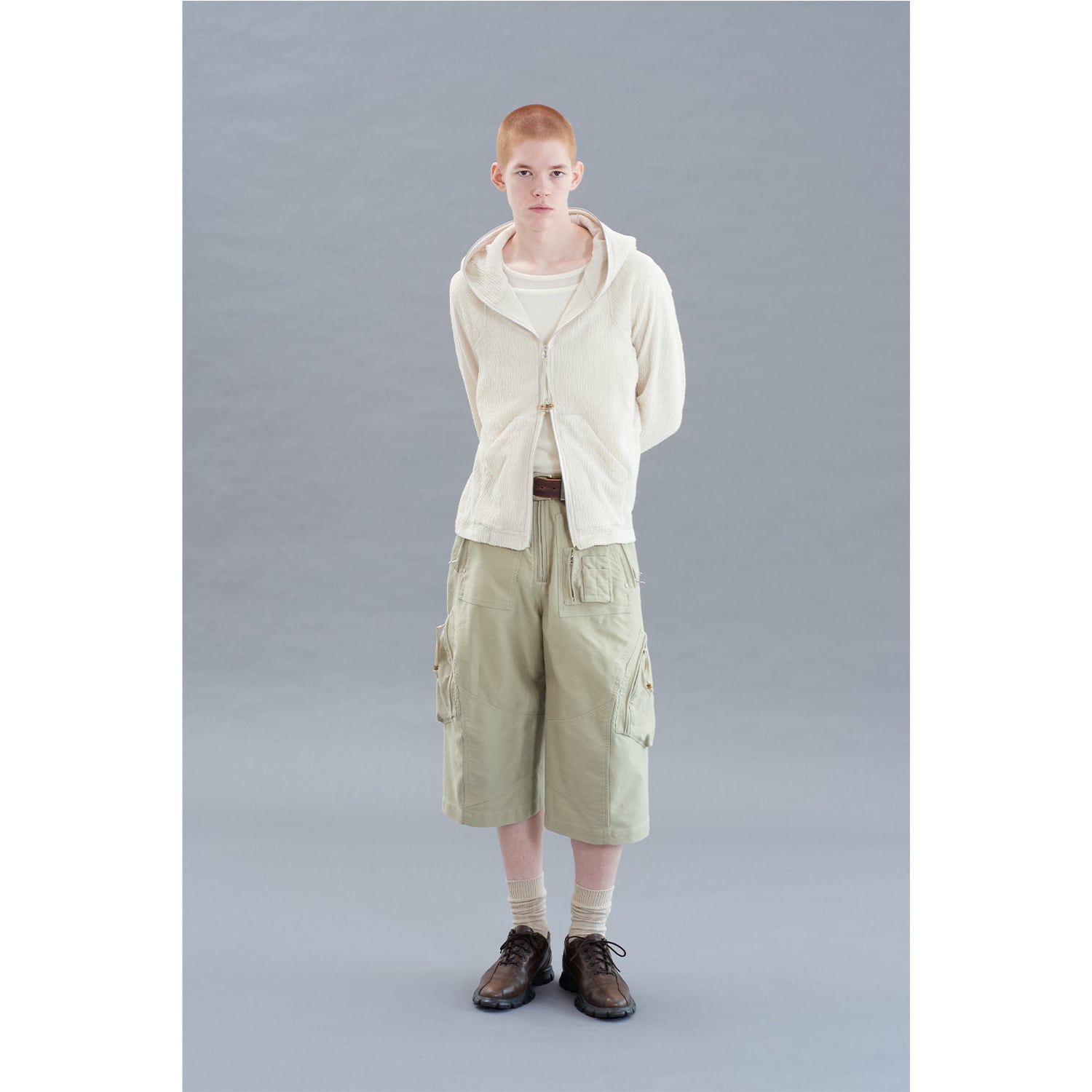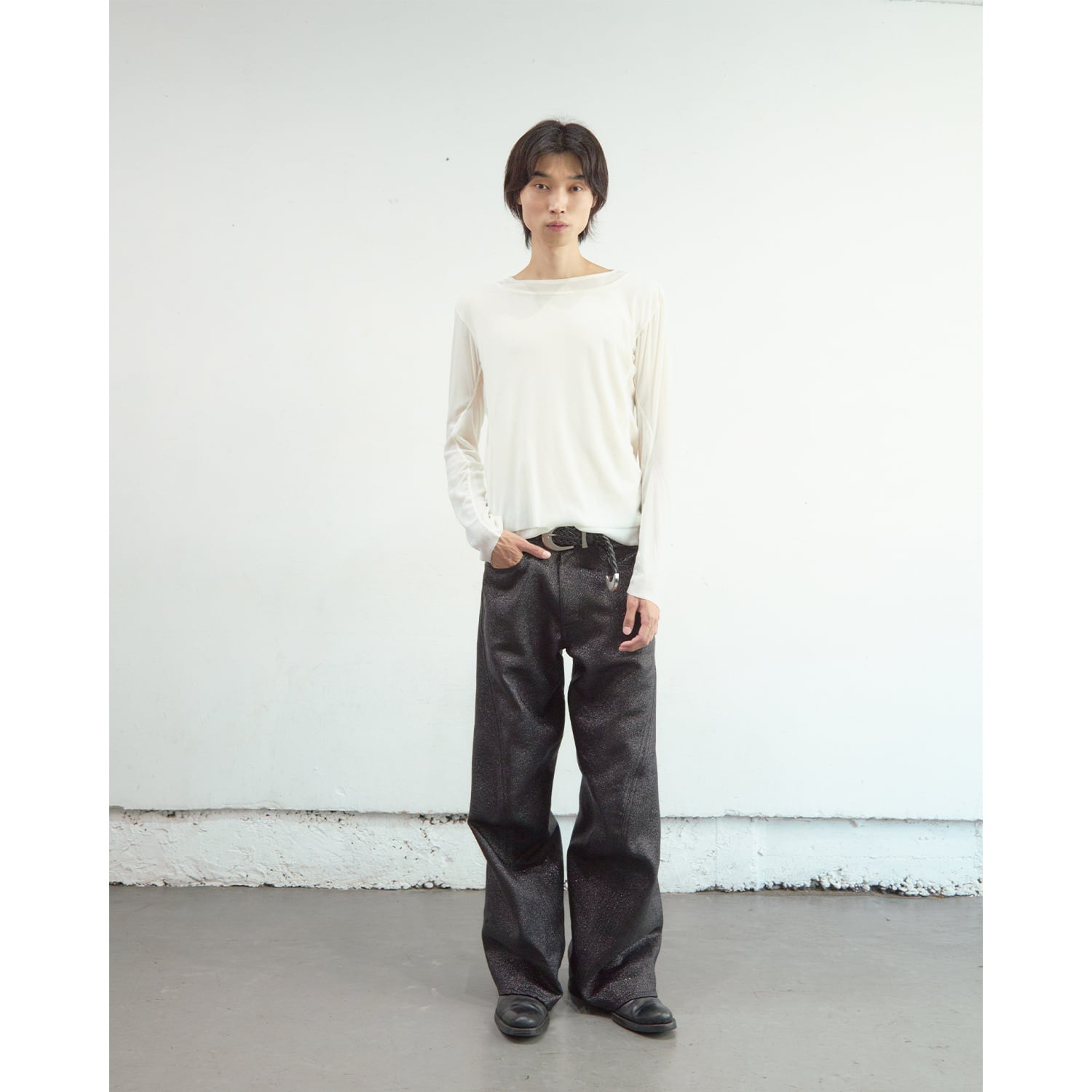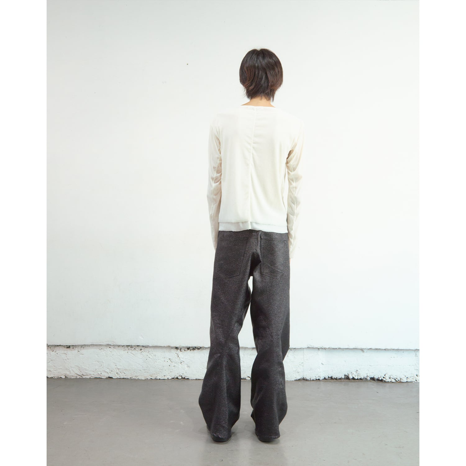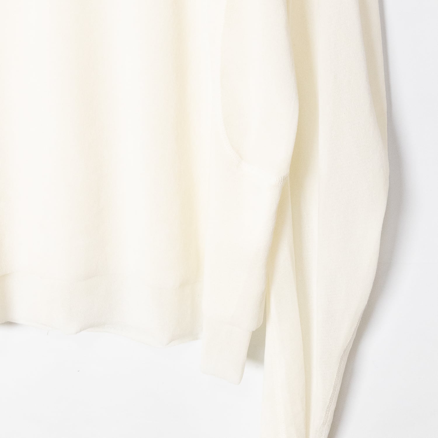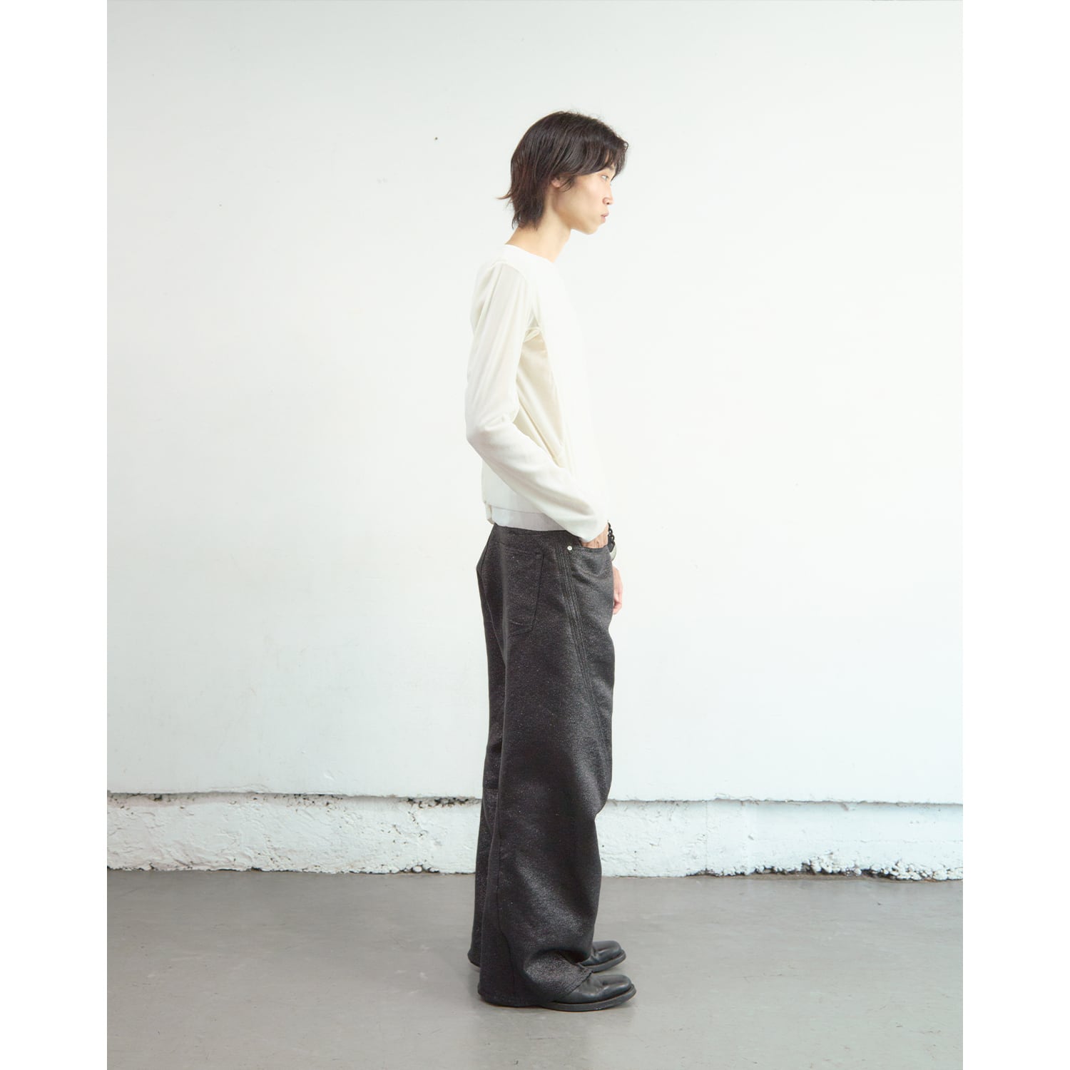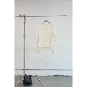 やや広めのネックラインやカットオフ仕様のヘムなど、あえて無駄を省いたミニマルなディテールが素材ならではの風合いを引き立てます。