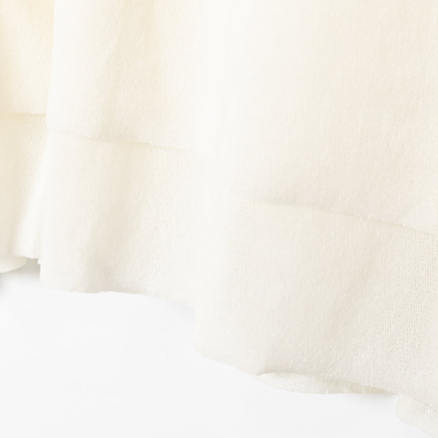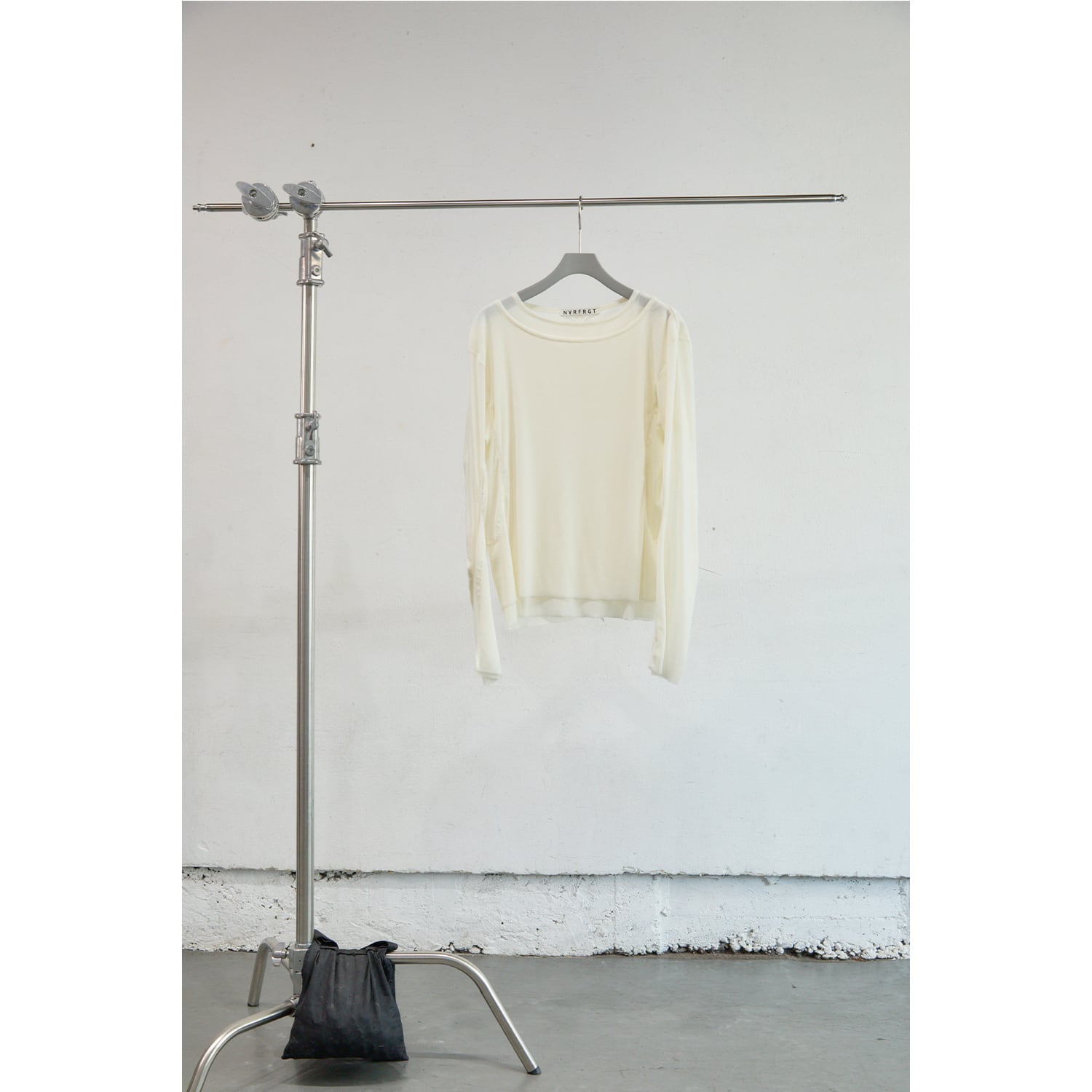 高品質なナイロンチュールにレーヨンフロッキー加工を施した透け感のある素材を採用し、身頃を二重に仕立てることで、単色でありながら奥行きのあるレイヤードスタイルを一枚で表現しています。