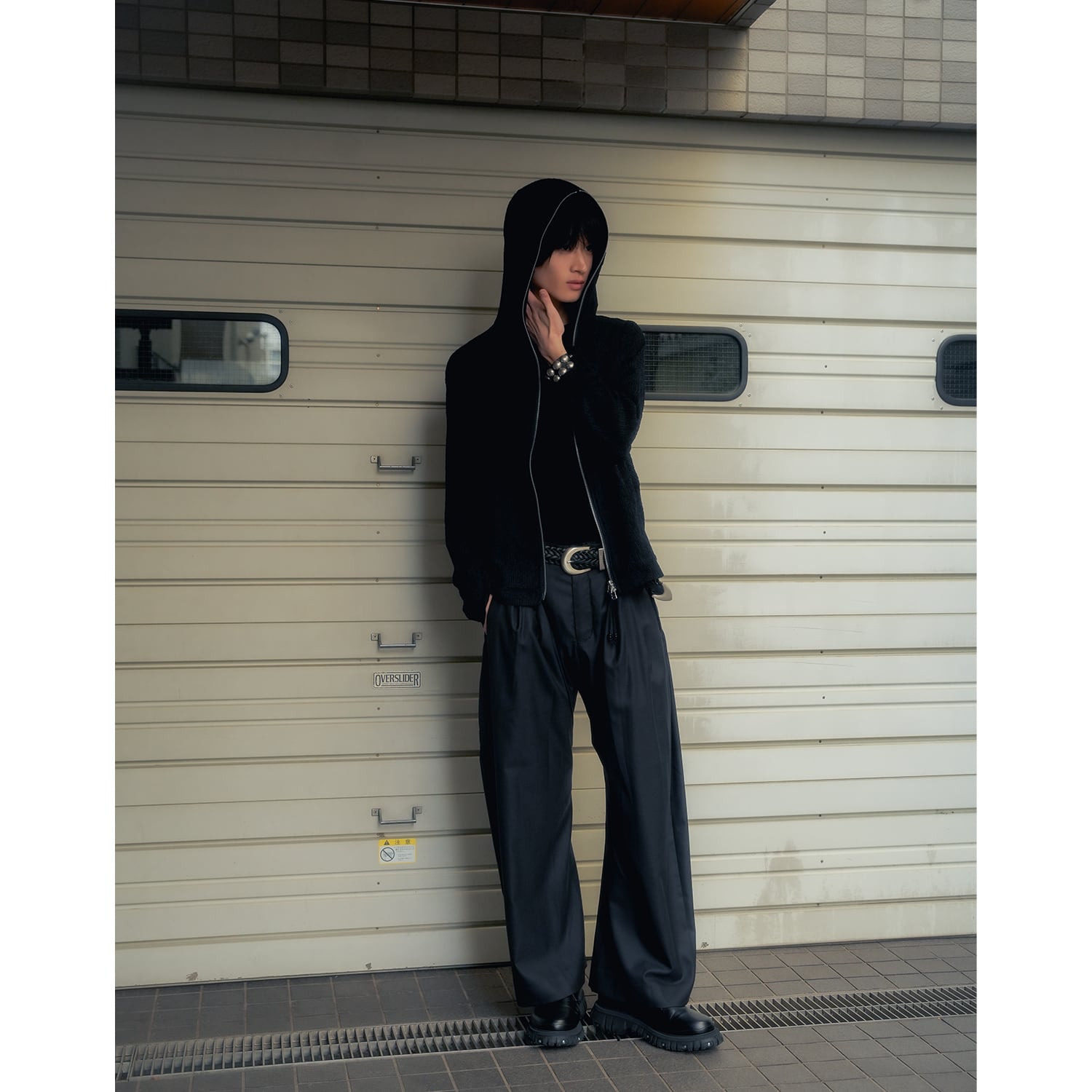フロントは上下から開閉可能なダブルジッパーを採用し、顔周りまで完全に覆うことができる構造。先端には天然石ビーズを配するなど、細部までしっかりとこだわりが行き届いています。
