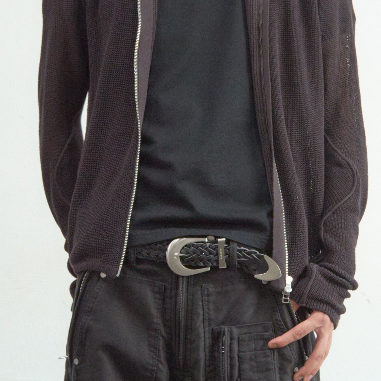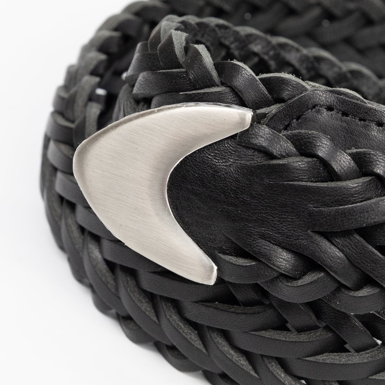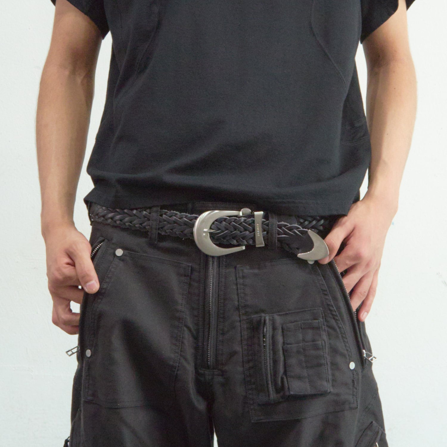 職人技を感じさせる緻密な編み込みとエッジの効いたメタルの質感が相まって、腰回りに圧倒的な存在感をもたらします。