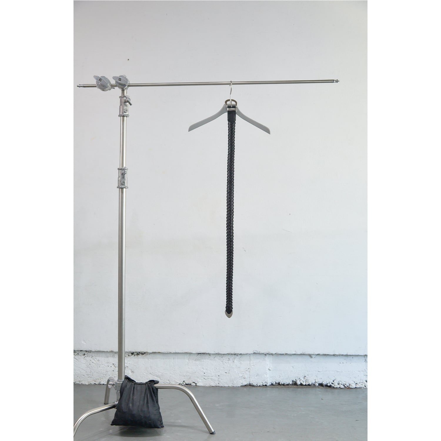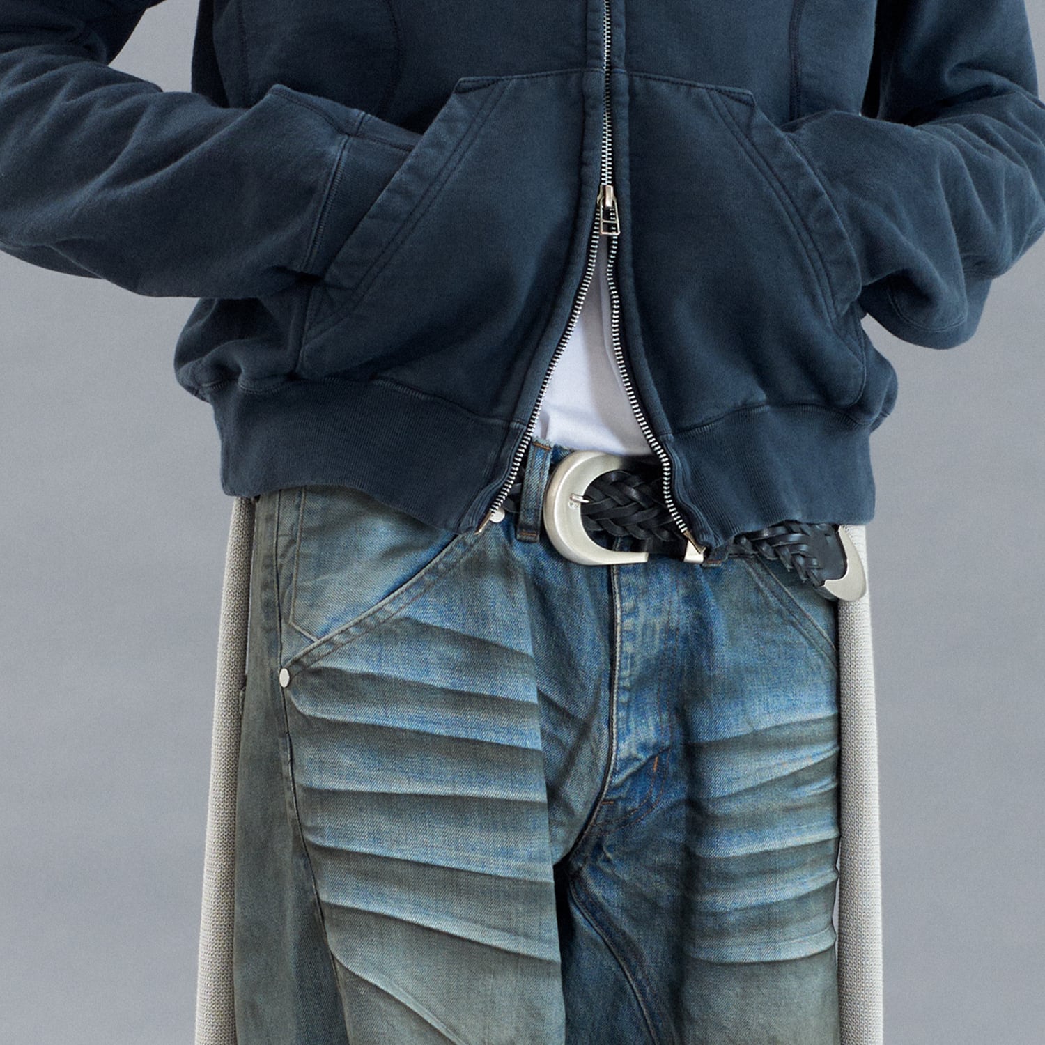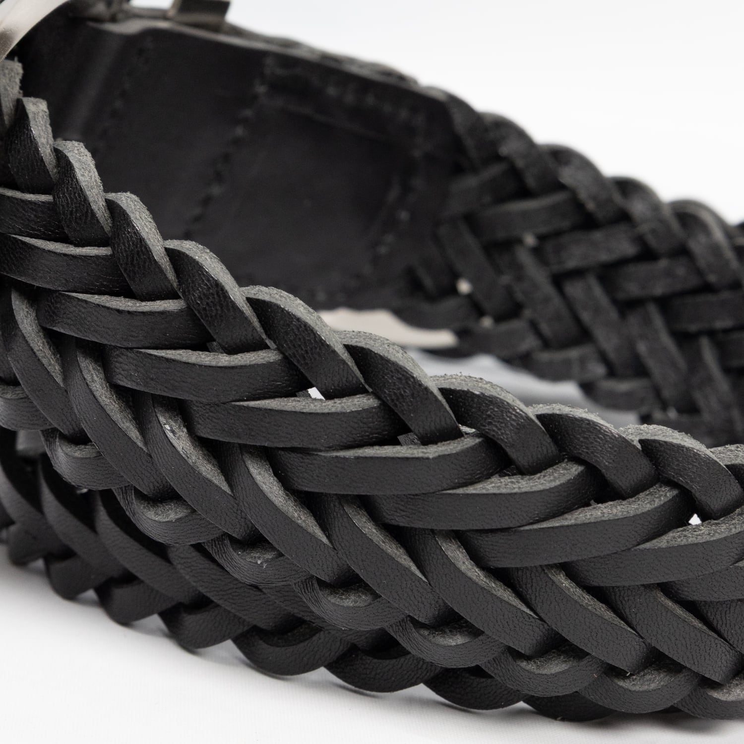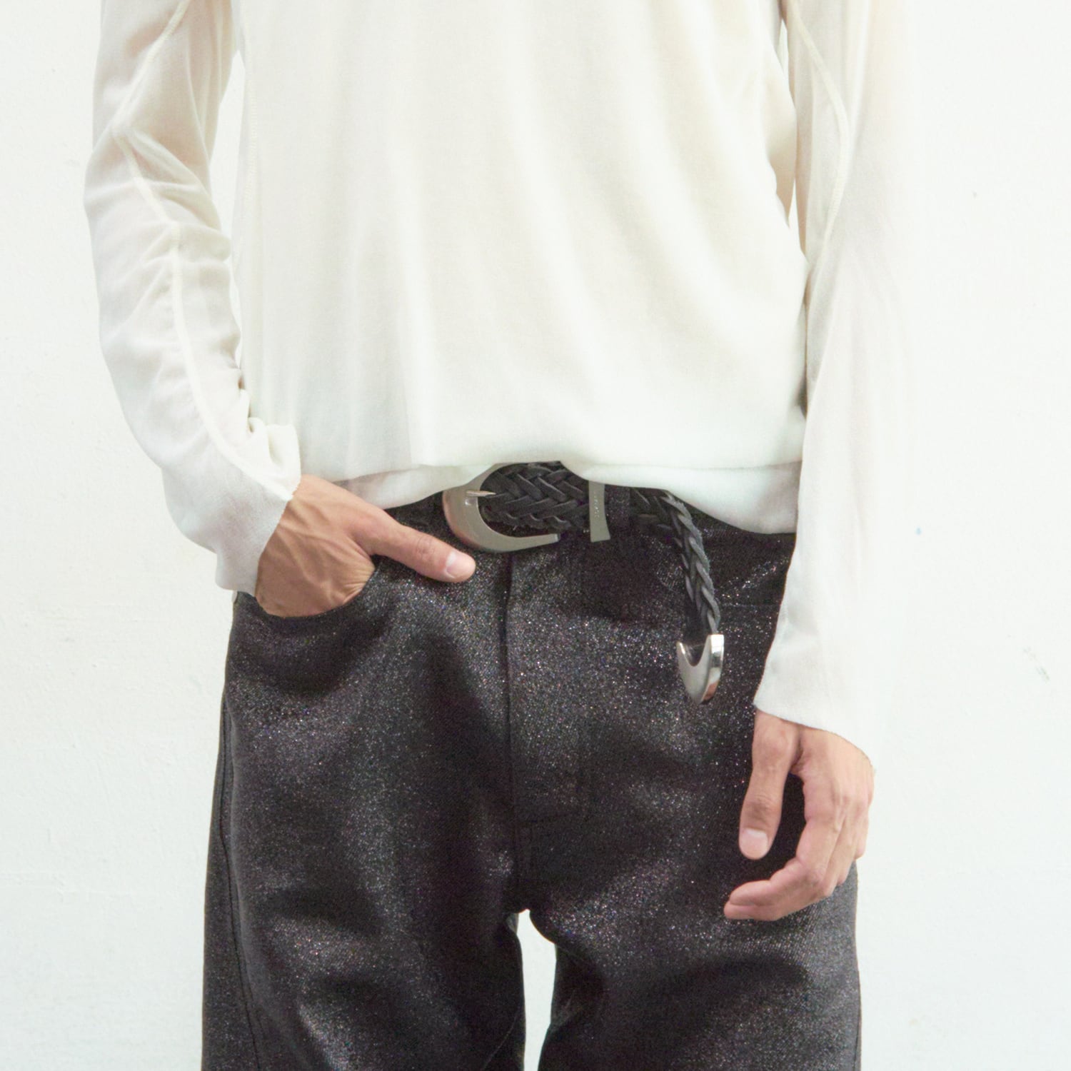 職人技を感じさせる緻密な編み込みとエッジの効いたメタルの質感が相まって、腰回りに圧倒的な存在感をもたらします。