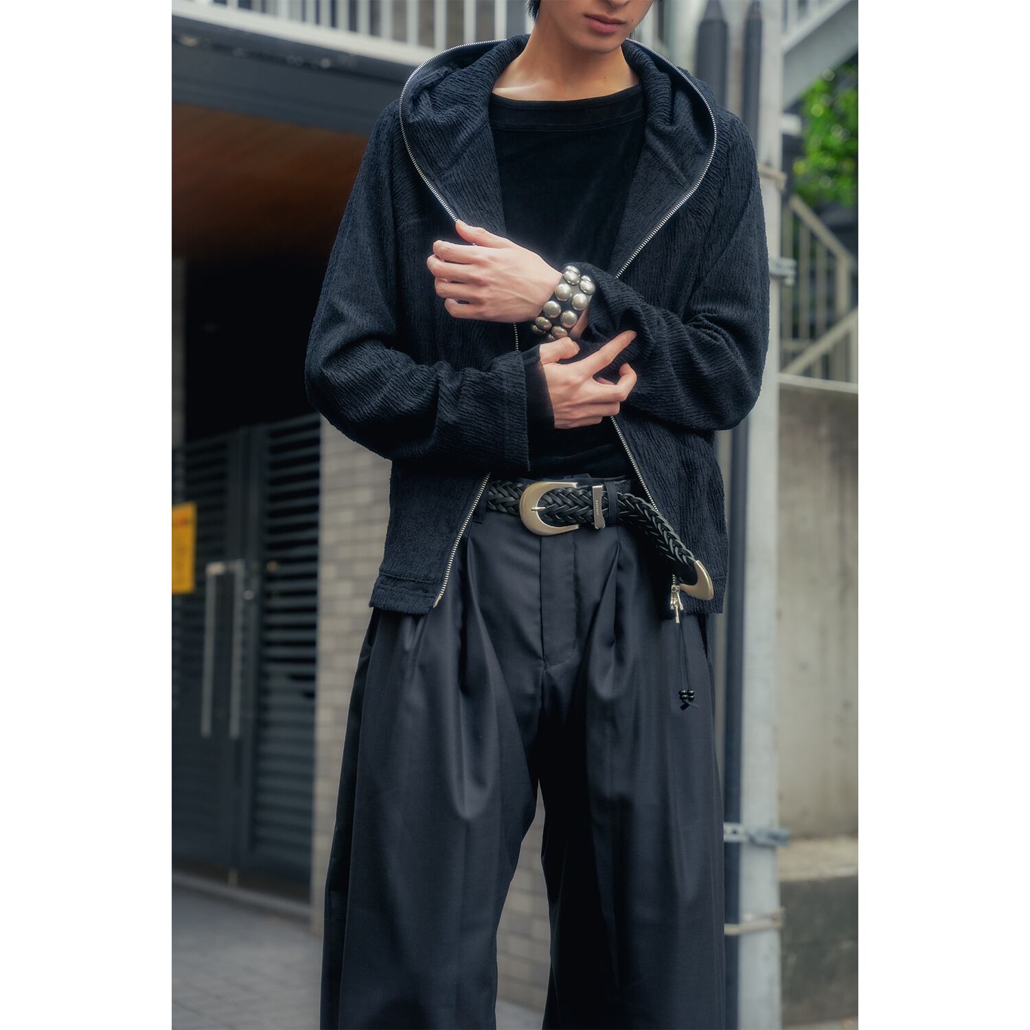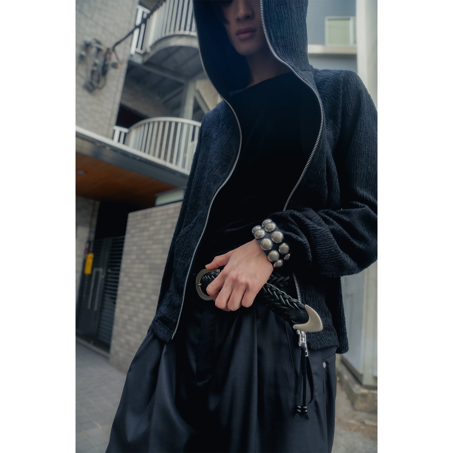 無垢なスタッズと緻密な紋様を刻み込んだスタッズボタンを組み合わせることで、単なるパンキッシュな装飾に留まらない、洗練された工芸品のような佇まいに仕上げています。