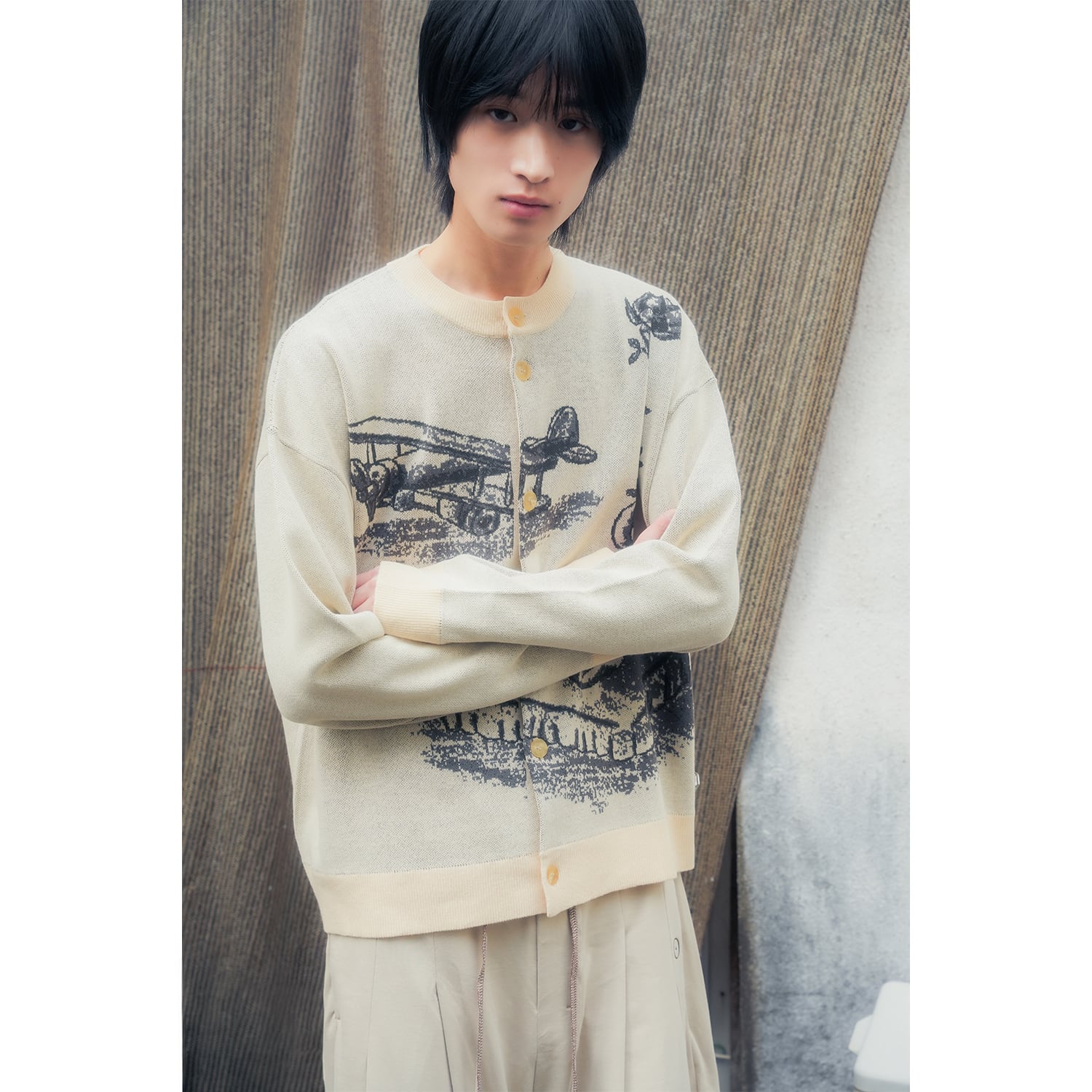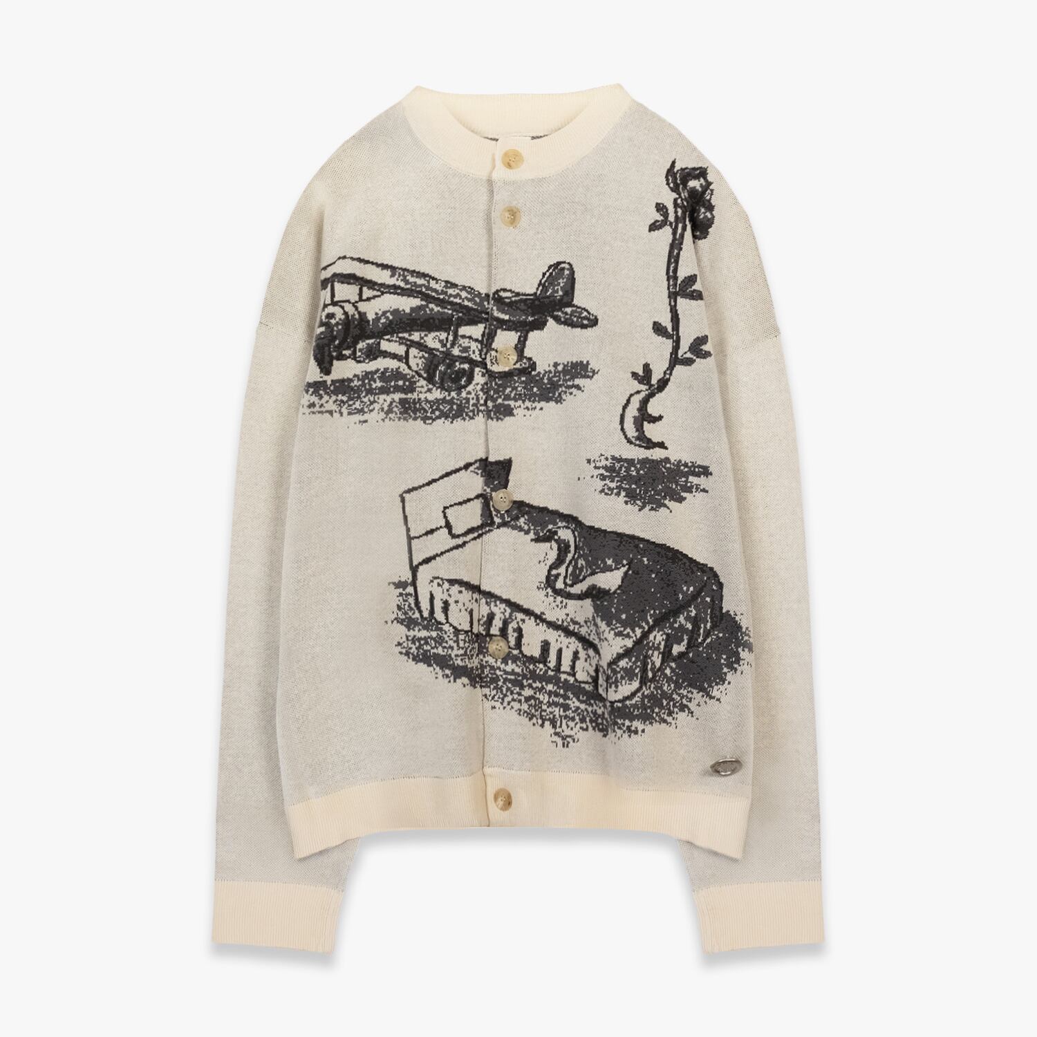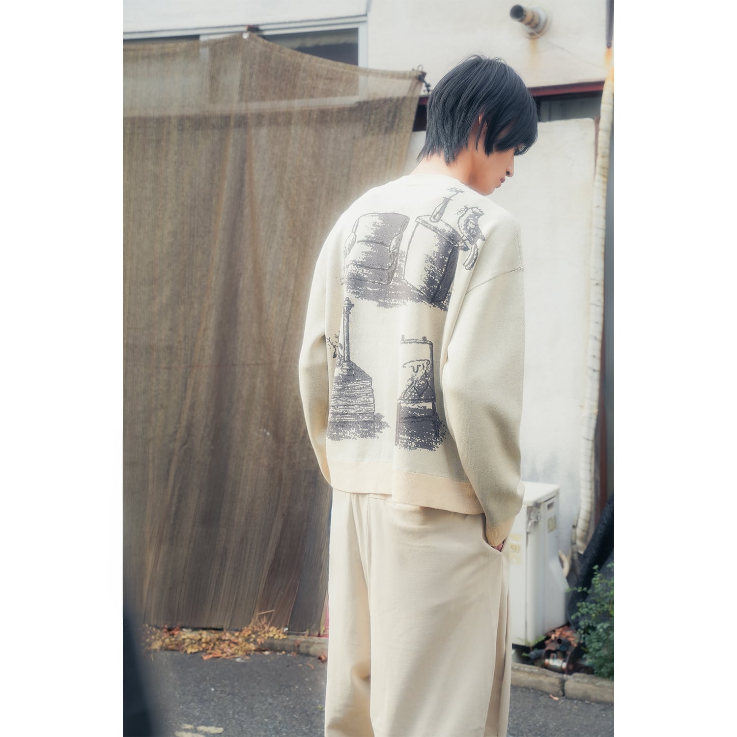 実家の片隅にあるような椅子やイーゼルといったノスタルジックなアートワークを落とし込んだクルーネックのカーディガン。