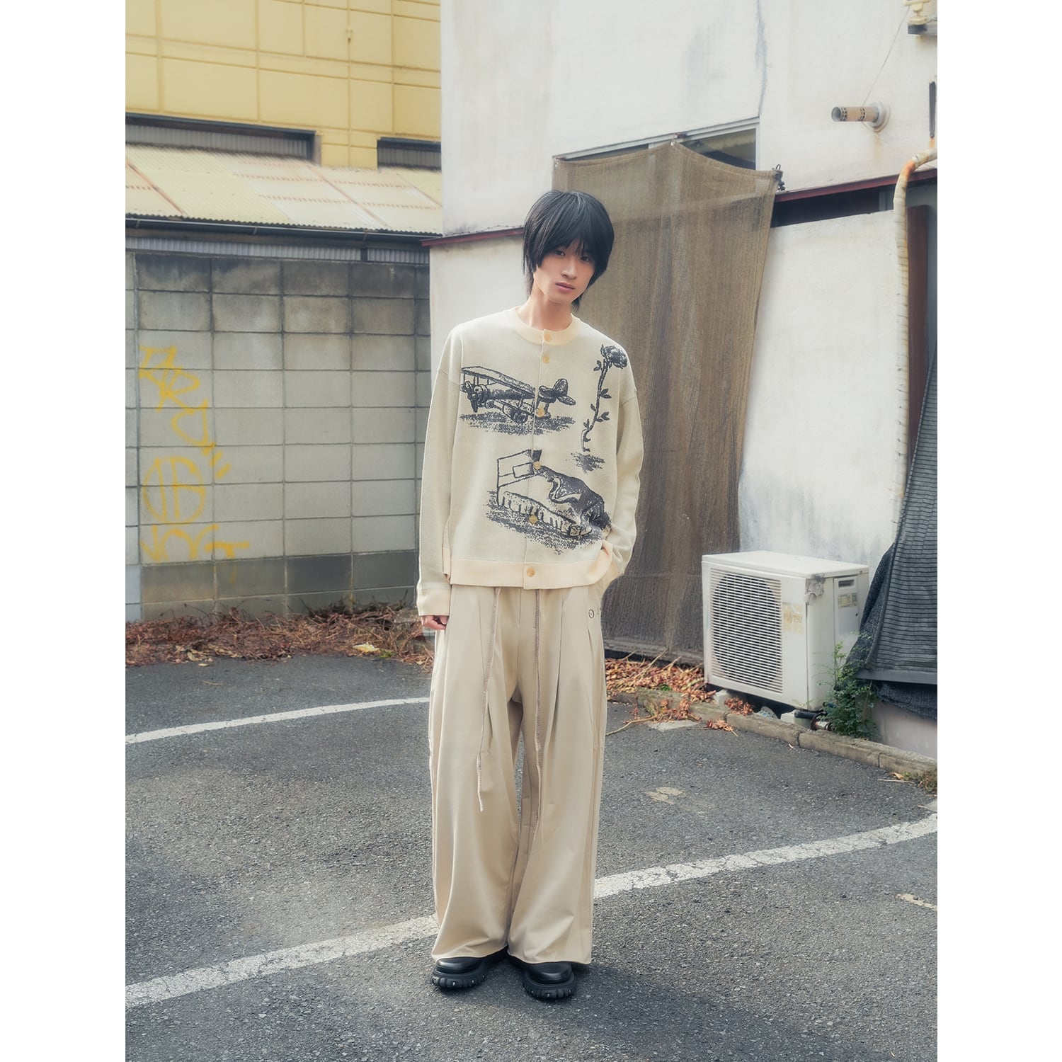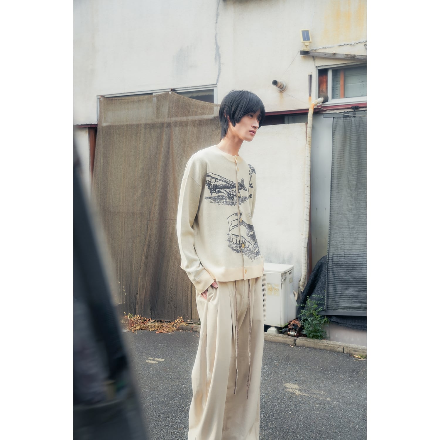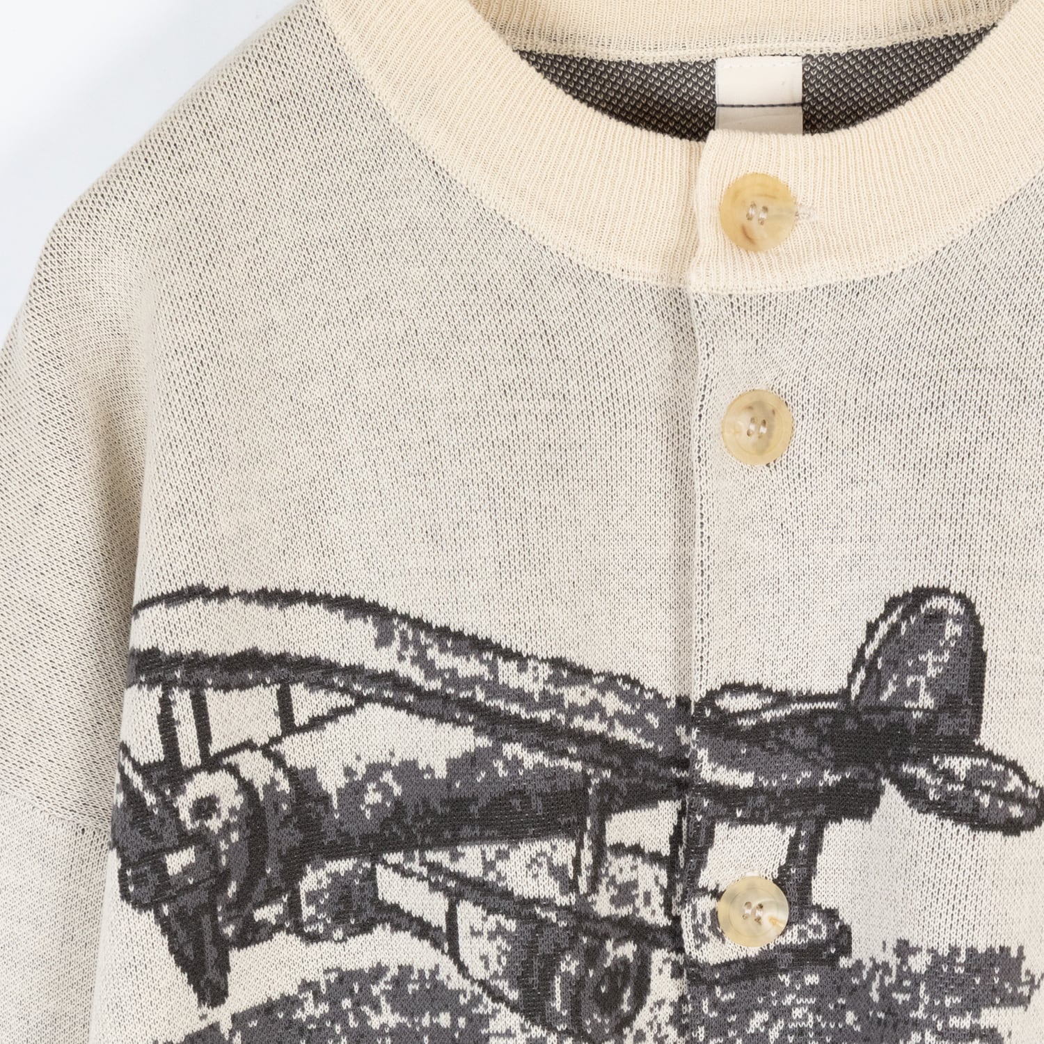 実家の片隅にあるような椅子やイーゼルといったノスタルジックなアートワークを落とし込んだクルーネックのカーディガン。