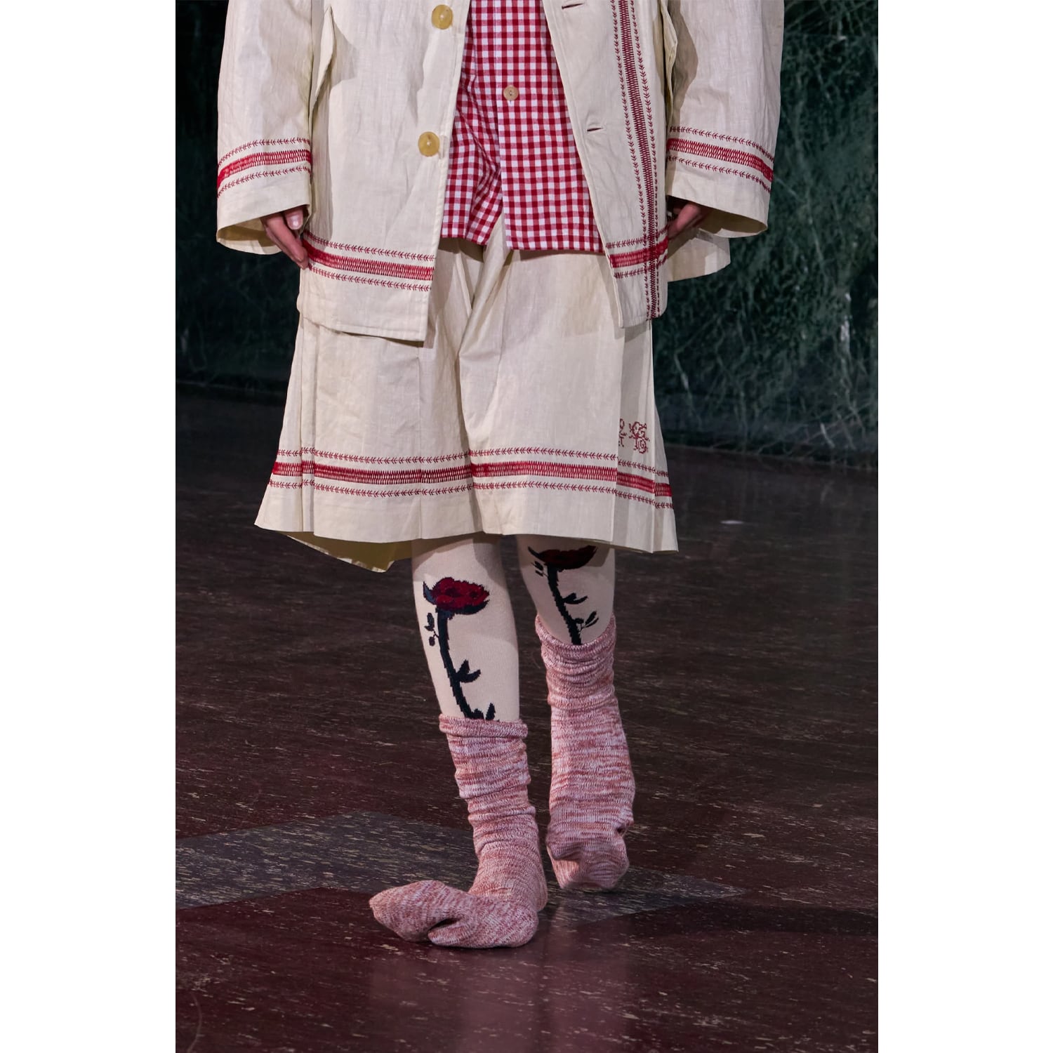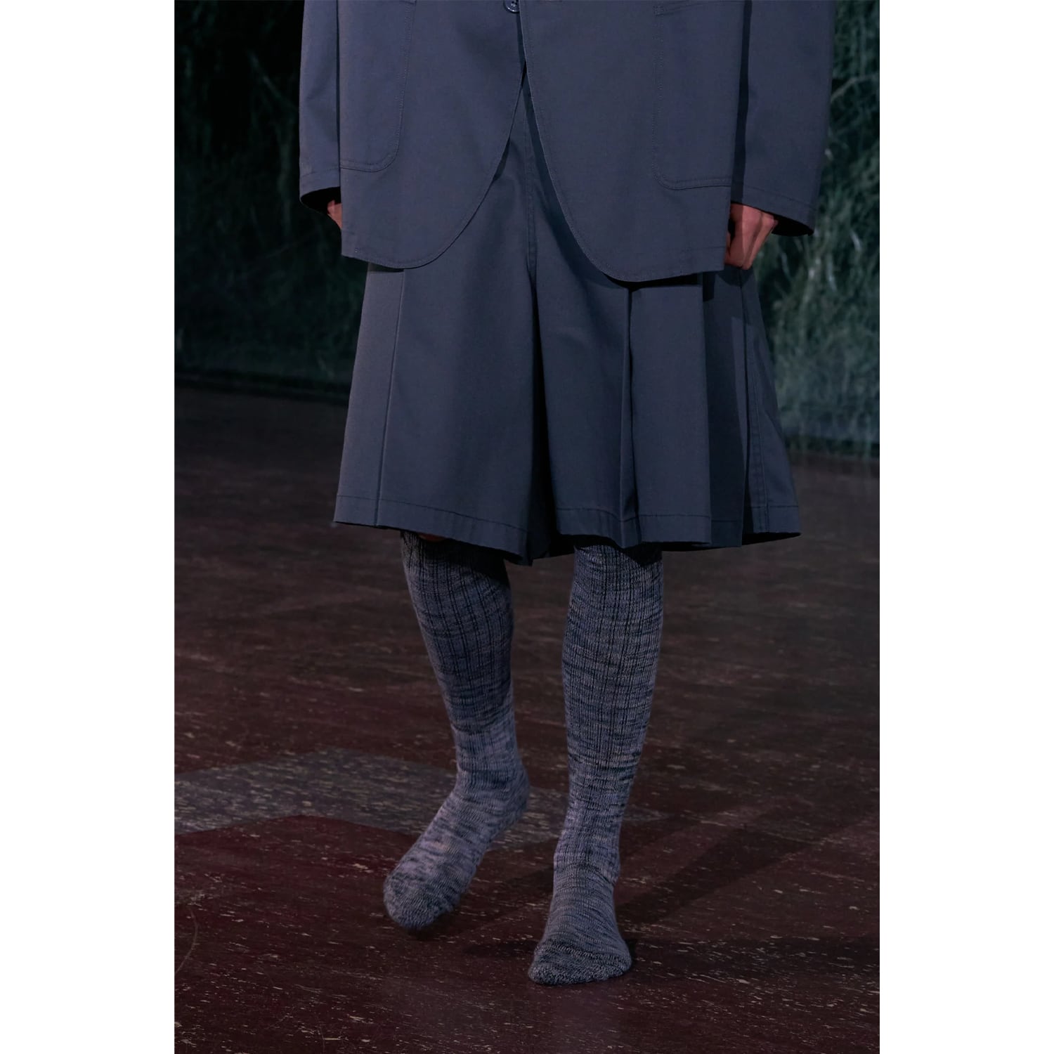 膝下まで届くほどのロング丈に設定されており、ルーズに溜めて履くことで足元にボリュームを演出できます。