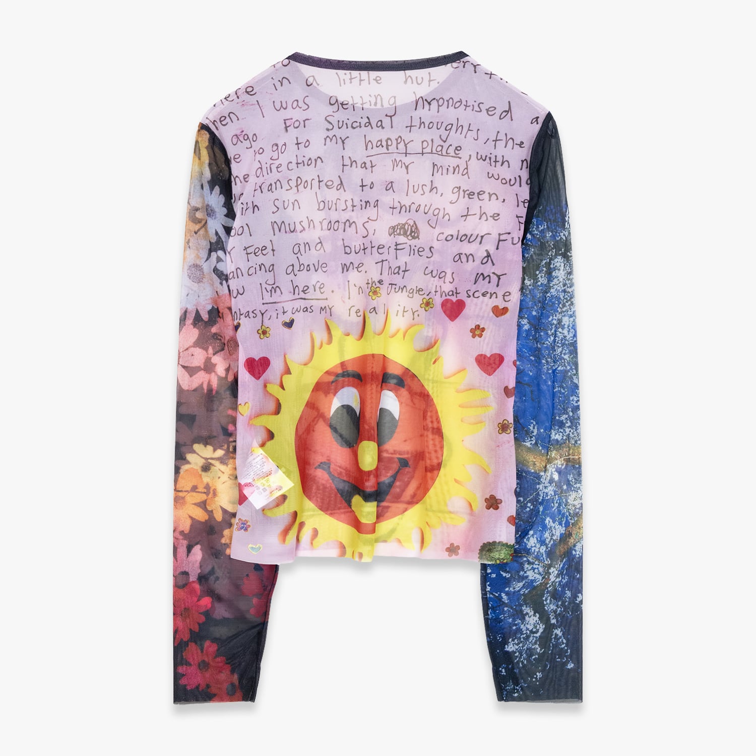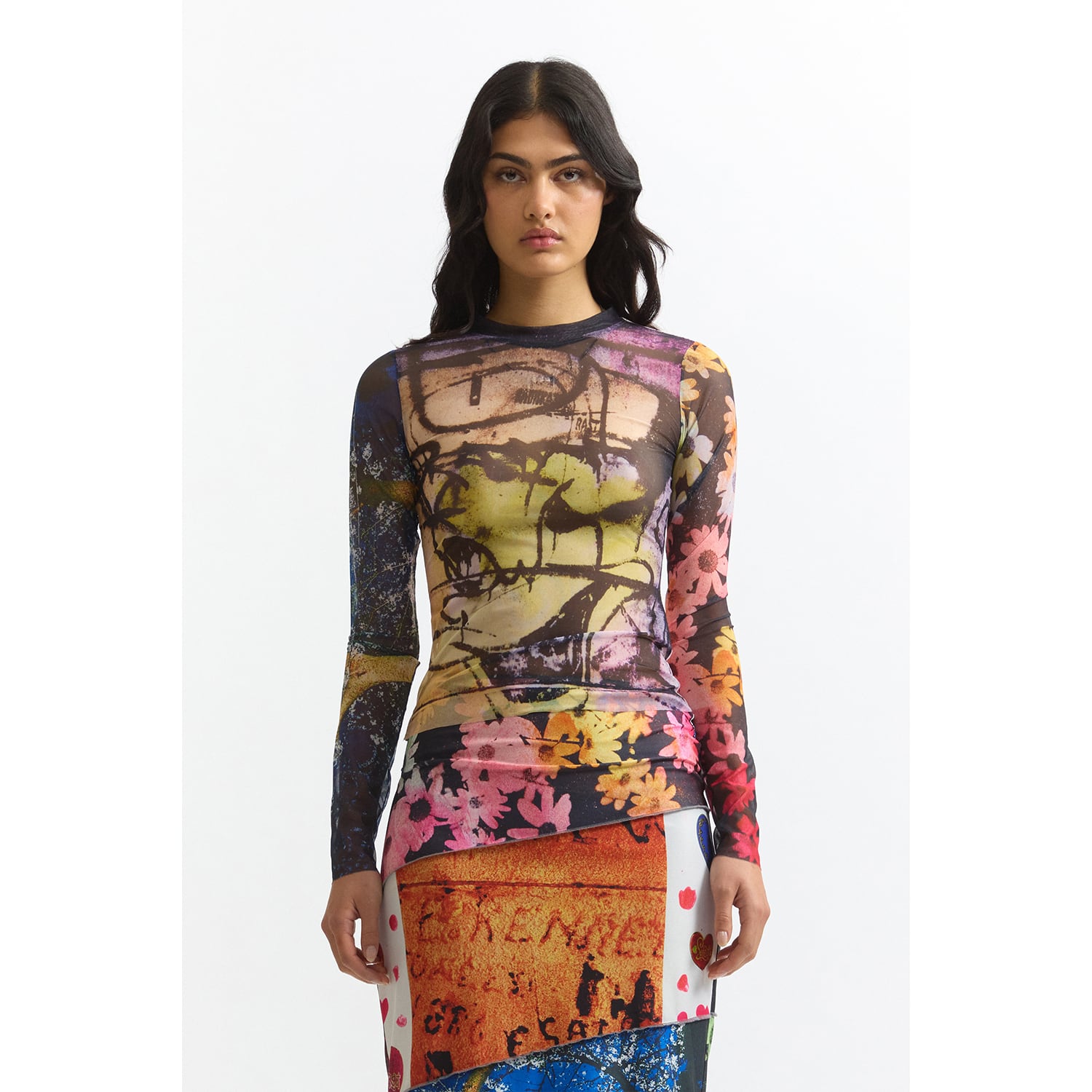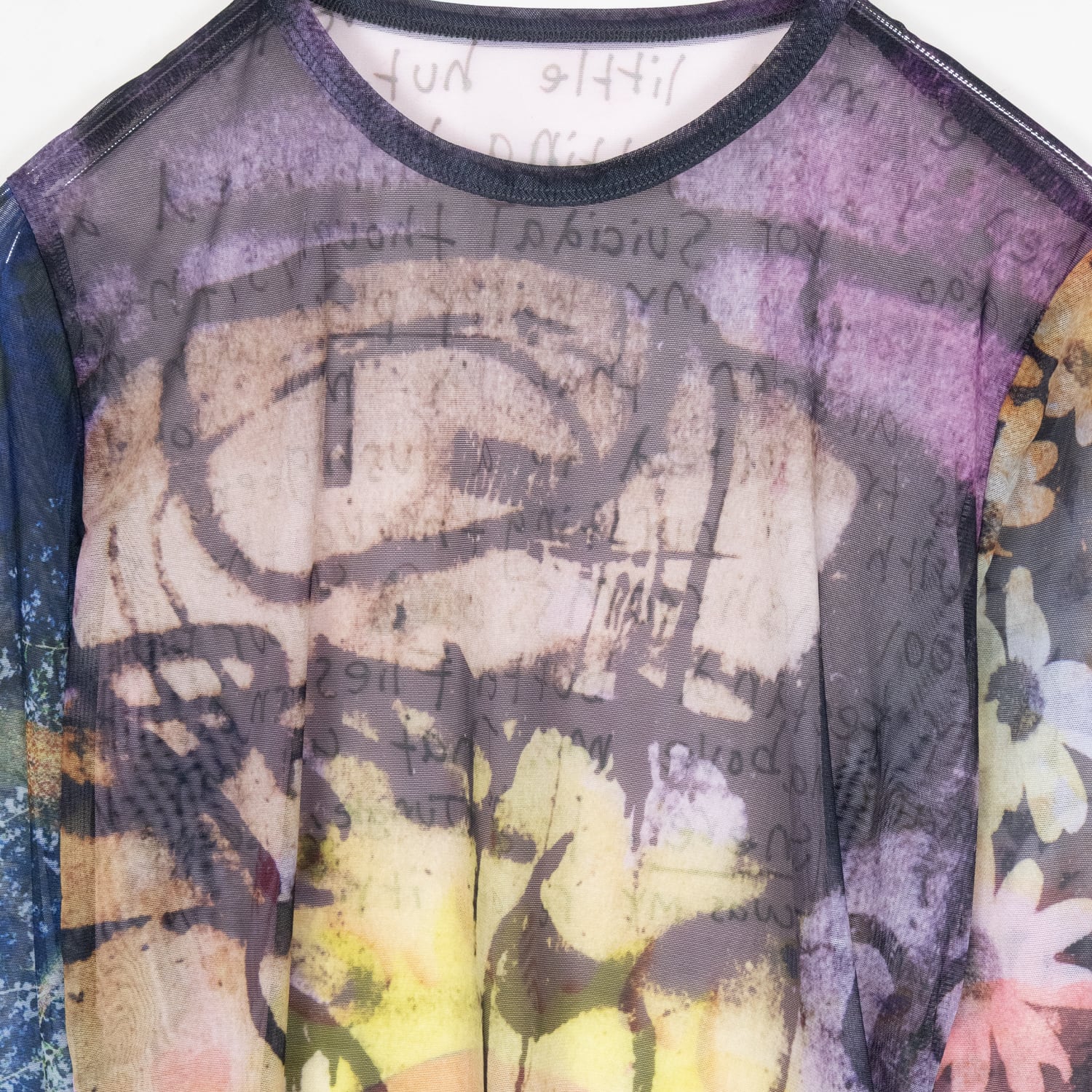 DazedやI-Dなど、カルチャーシーンの最前線で活動する写真家・映像作家のJoshua Gordon(ジョシュア・ゴードン)のアートワークを全面に配したシアーメッシュトップ。