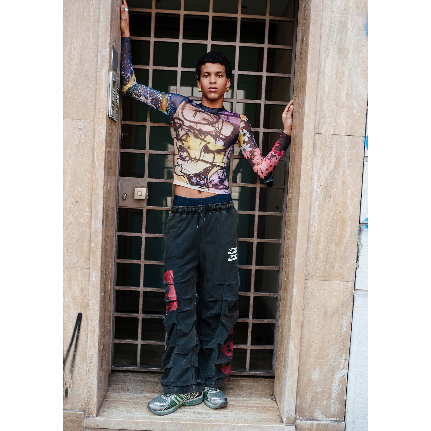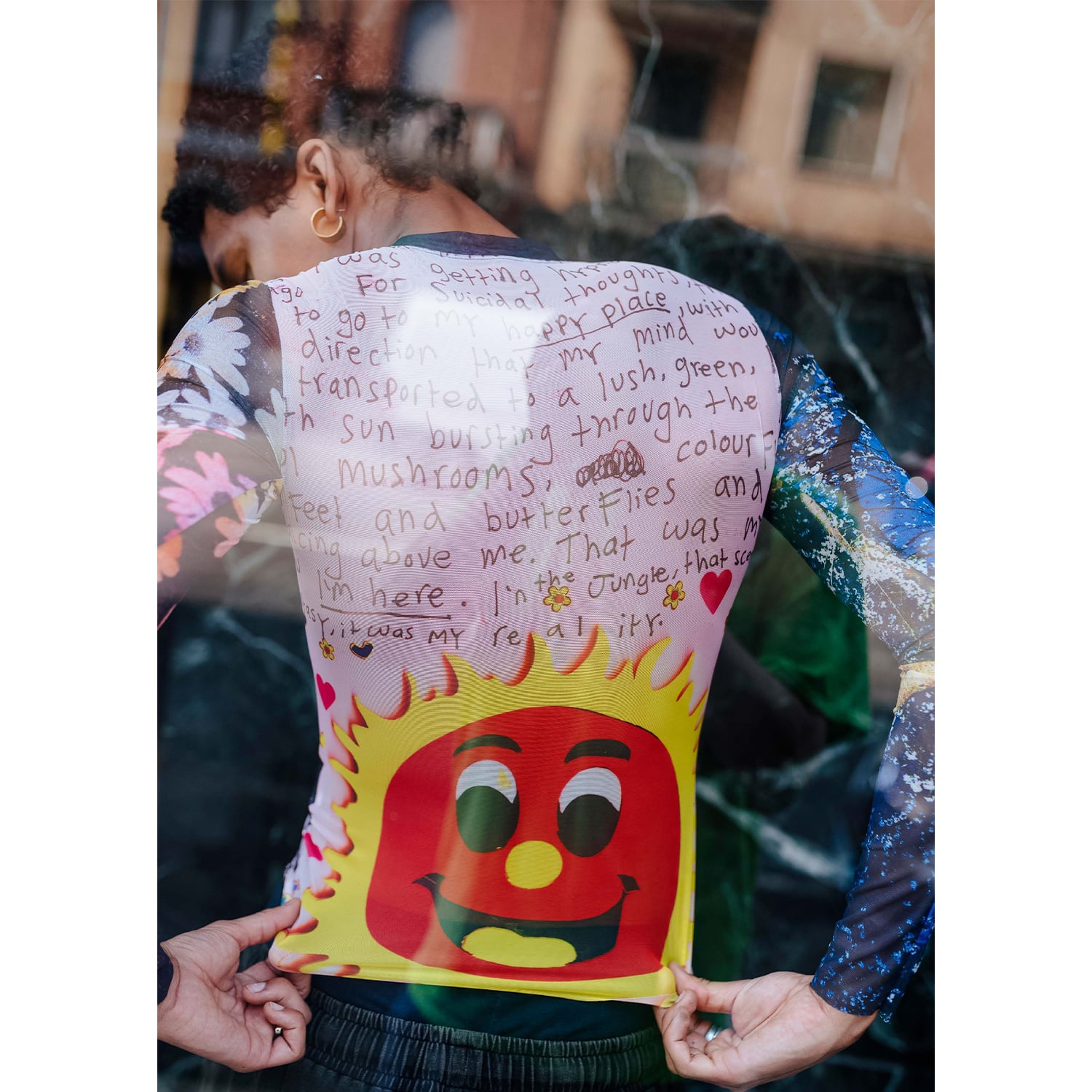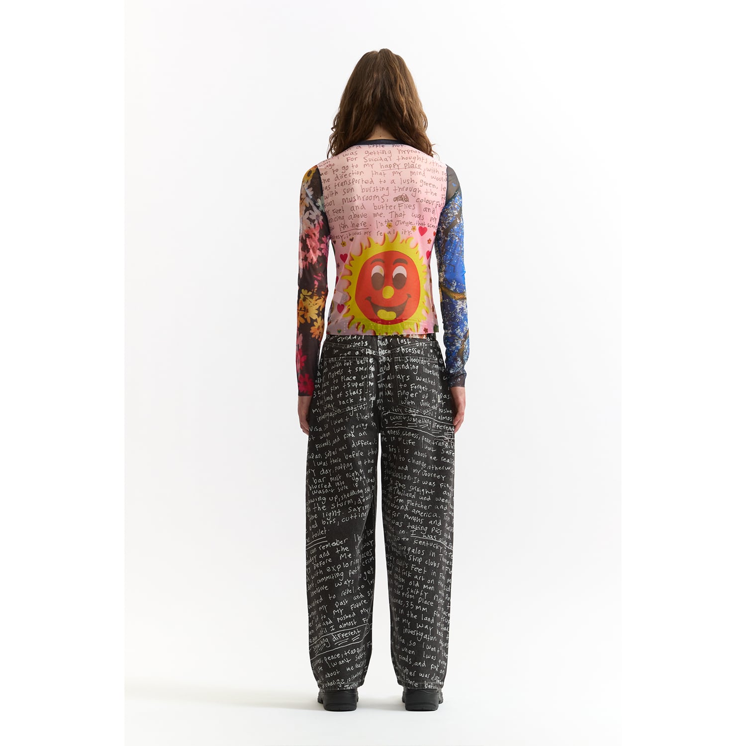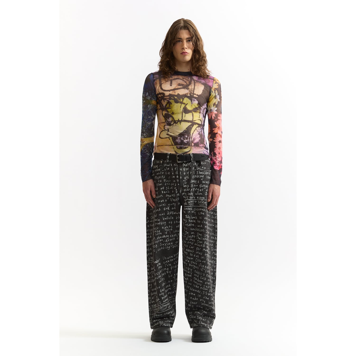 DazedやI-Dなど、カルチャーシーンの最前線で活動する写真家・映像作家のJoshua Gordon(ジョシュア・ゴードン)のアートワークを全面に配したシアーメッシュトップ。