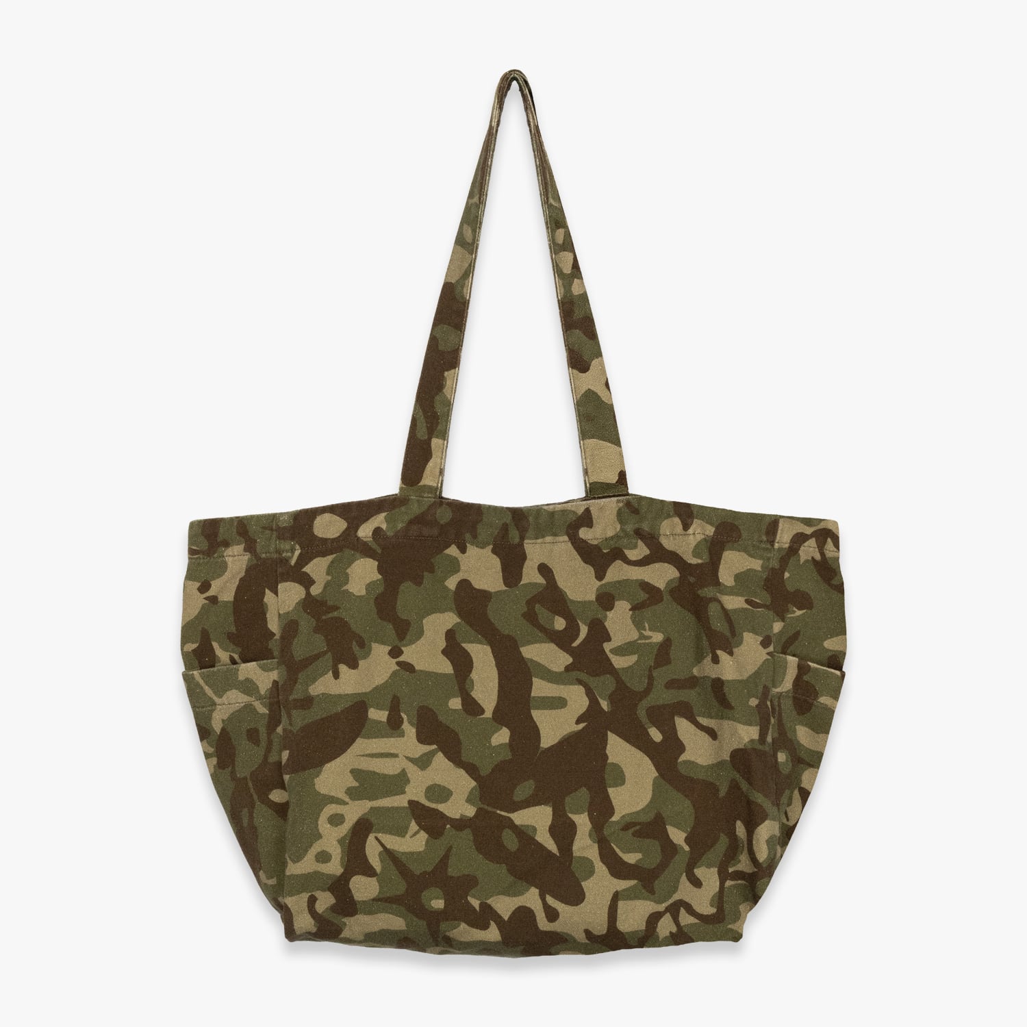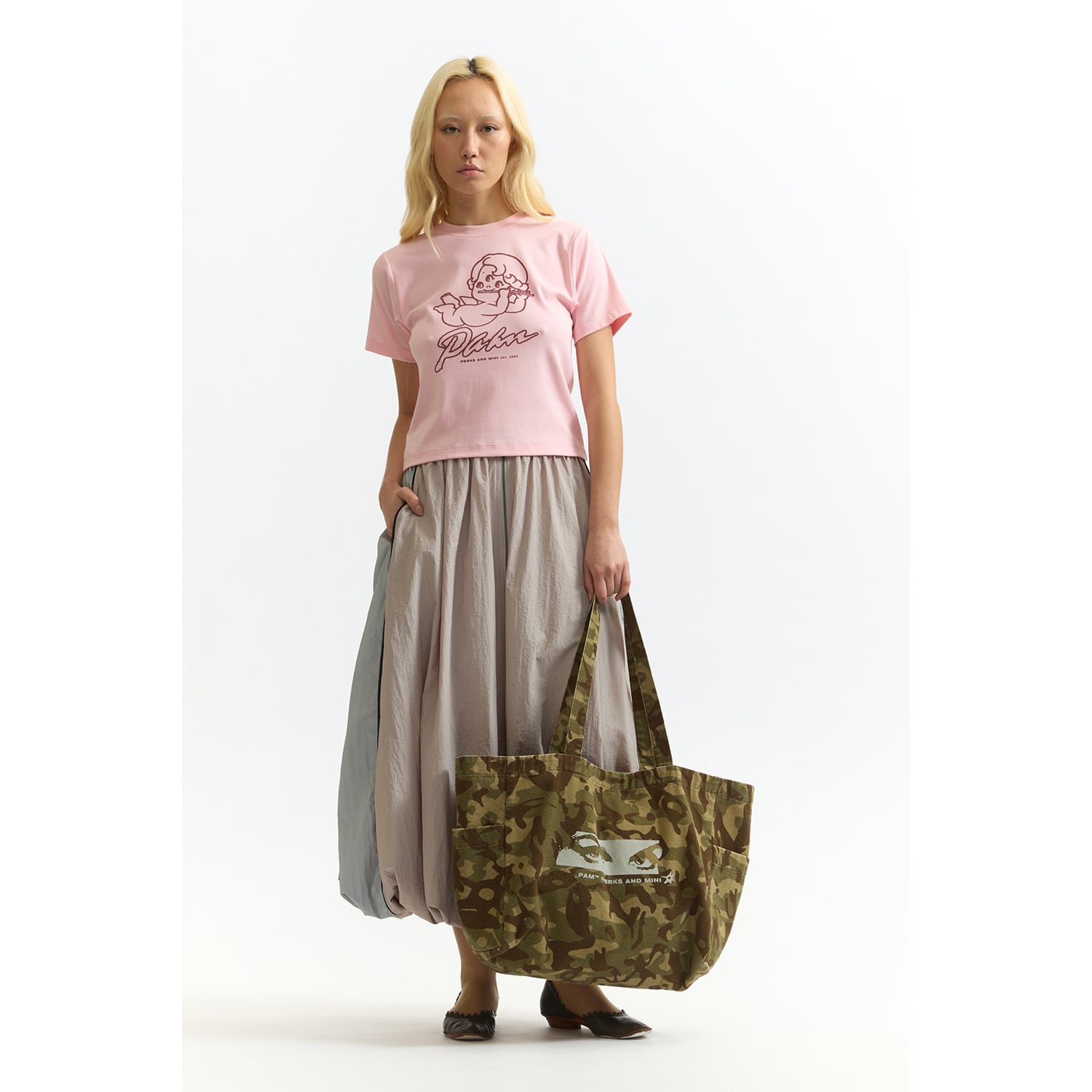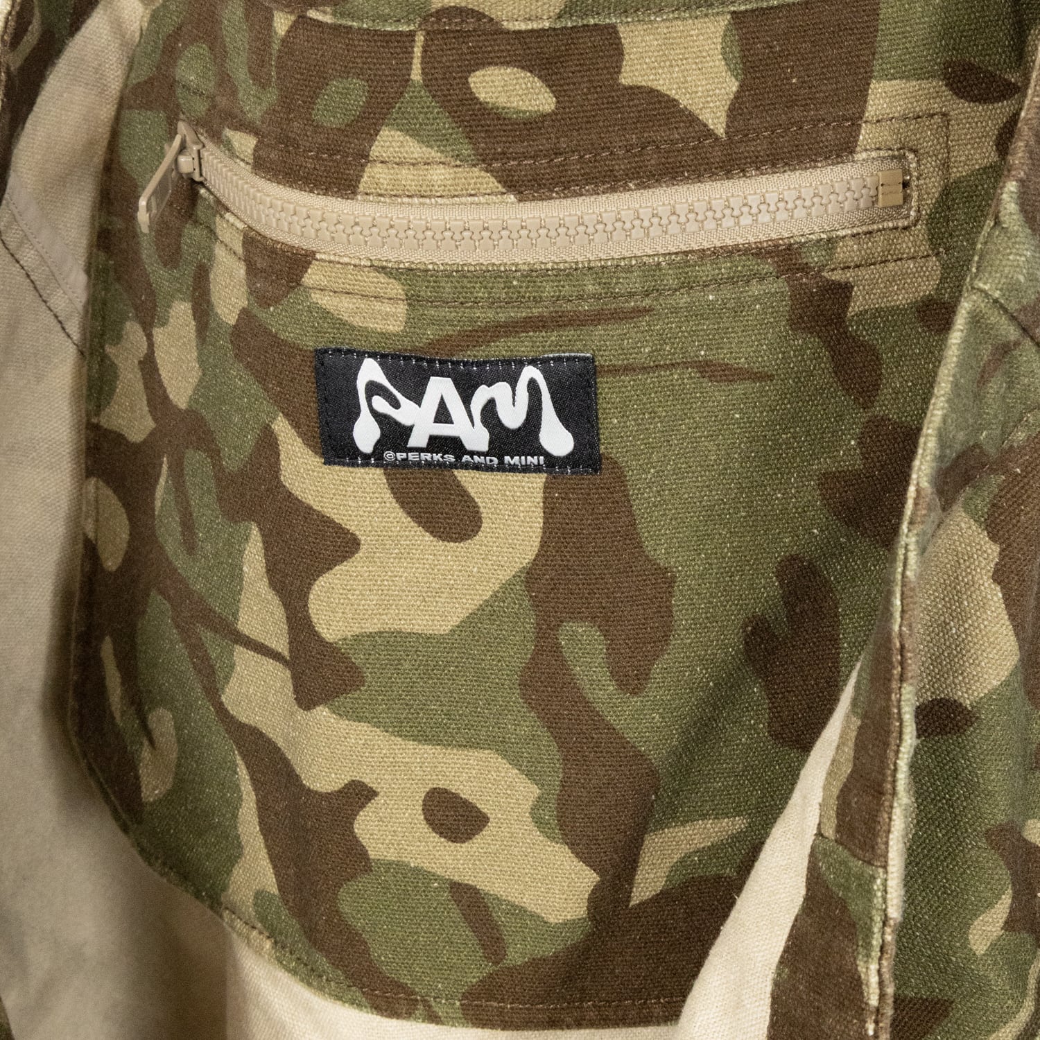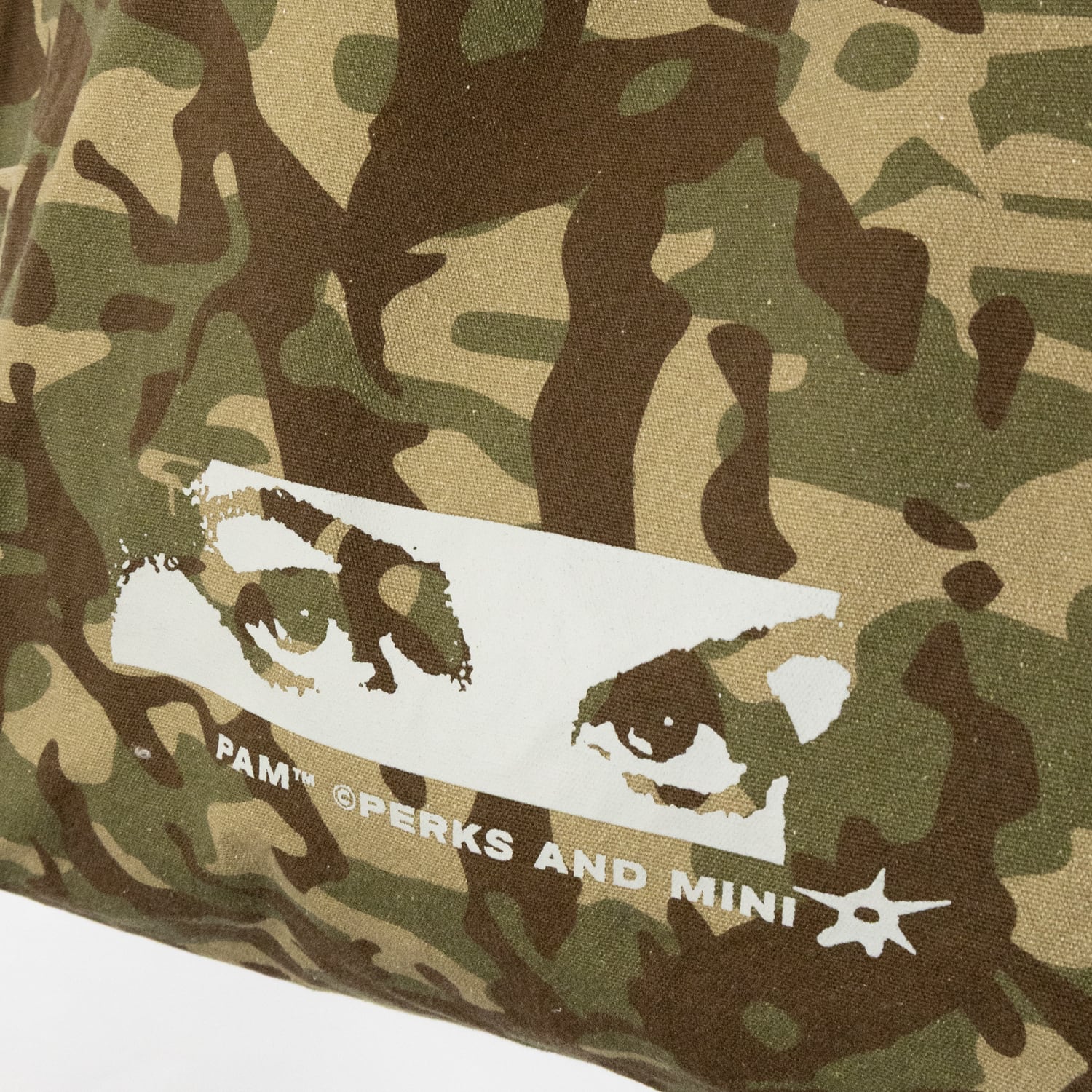 大きいキャンバス製のショッパートートバッグ。肩に掛けやすいハンドル。バッグ開口部はメタルボタンで開閉。内側にジッパー付きポケット。出し入れしやすいサイドポケット付きのマチパネル。全面に「P.A.M. Camo」のアートワーク。「P.A.M. Maiden eyes」と「Perks And Mini」のテキストをスクリーンプリント。