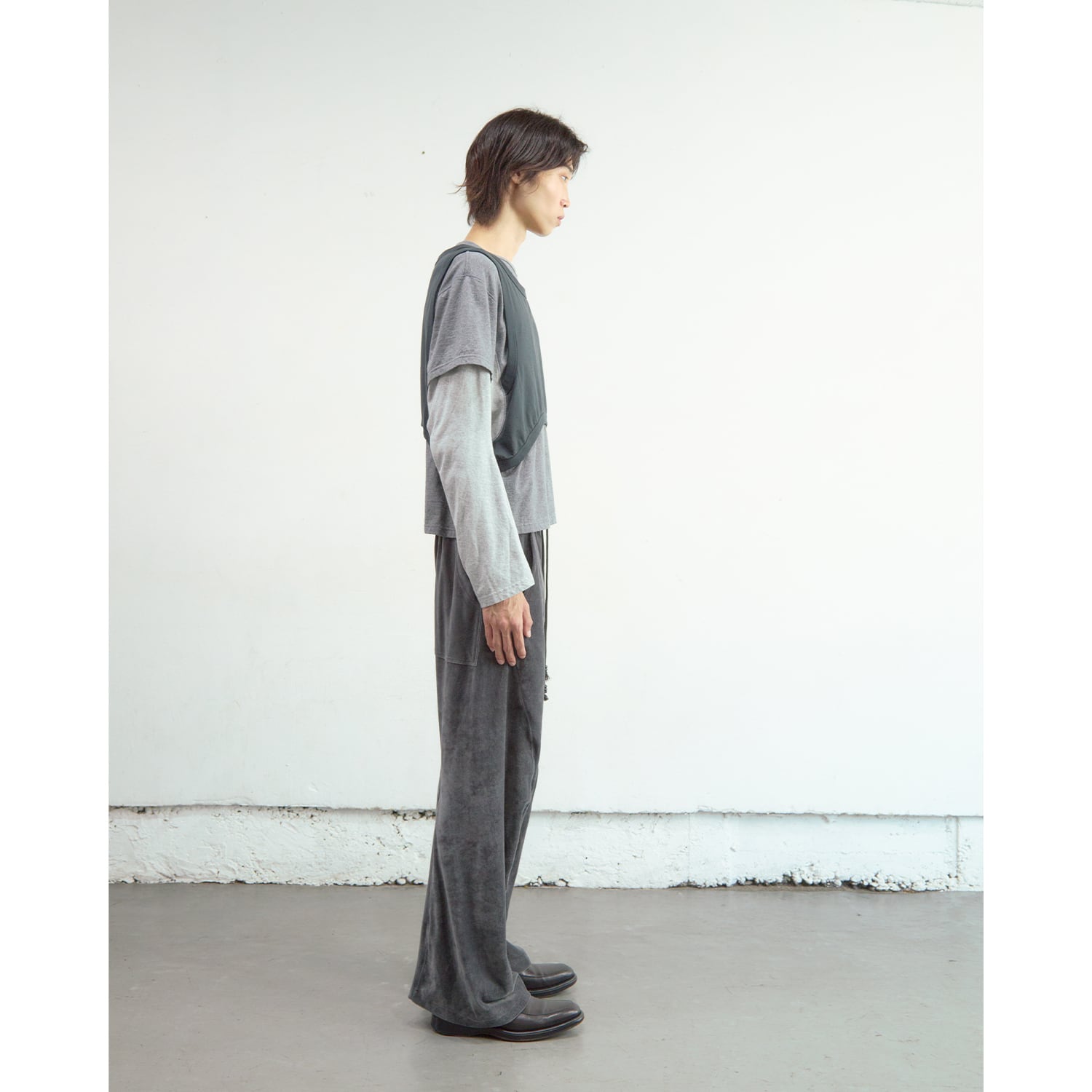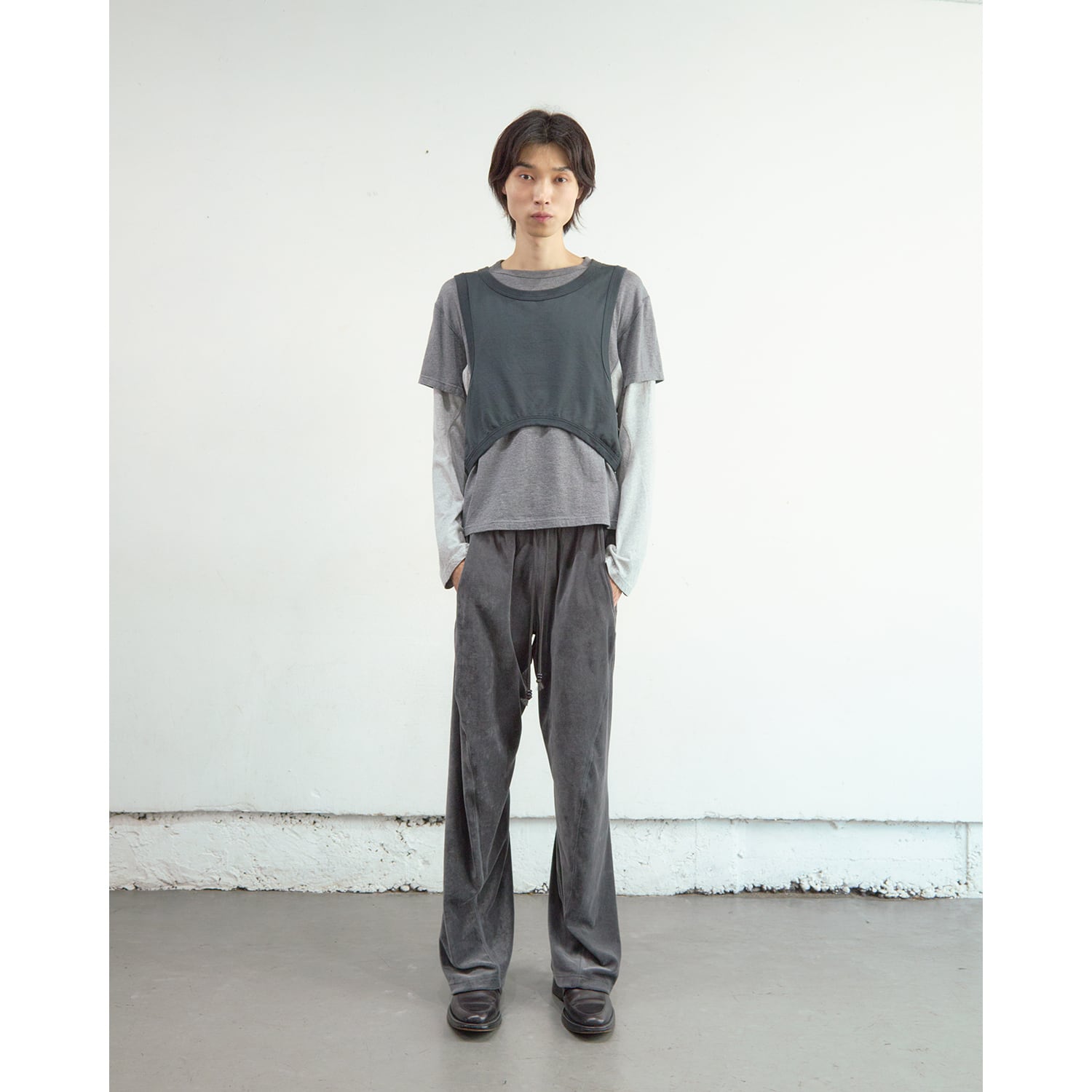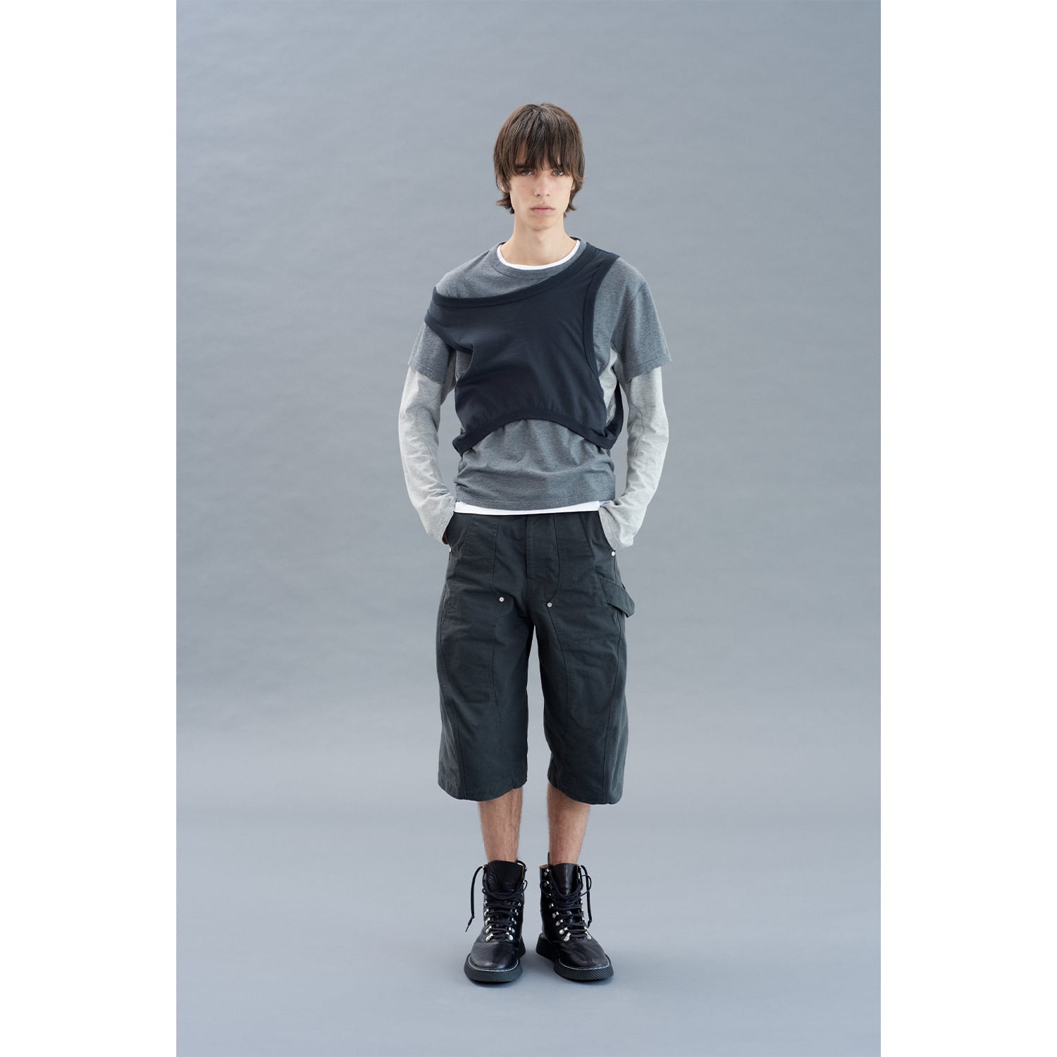 ピヴォットスリーブとフラットシーマー縫製によるパネリングデザイン、ノースリーブ、ハーフスリーブ、ロングスリーブが一体となった巧みなレイヤードデザインです。