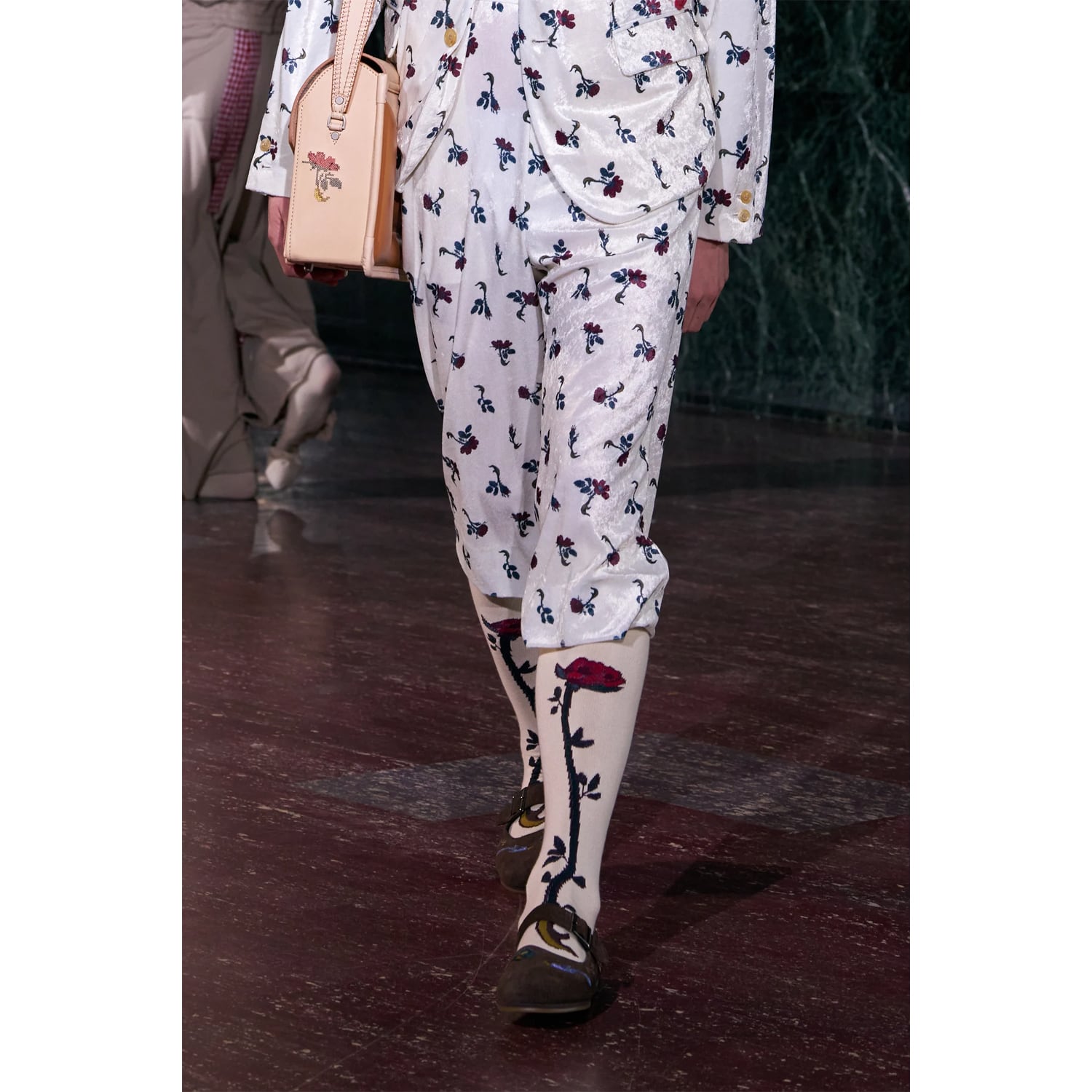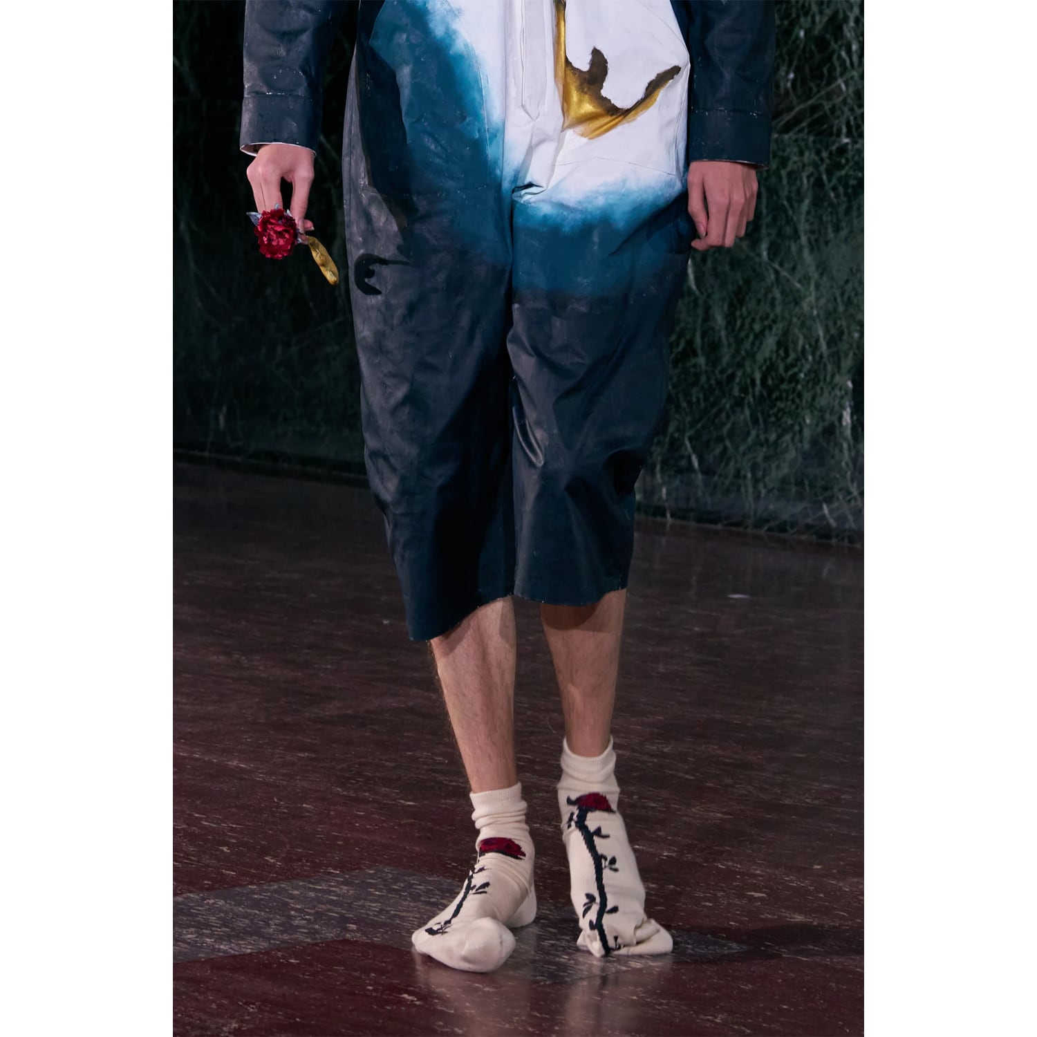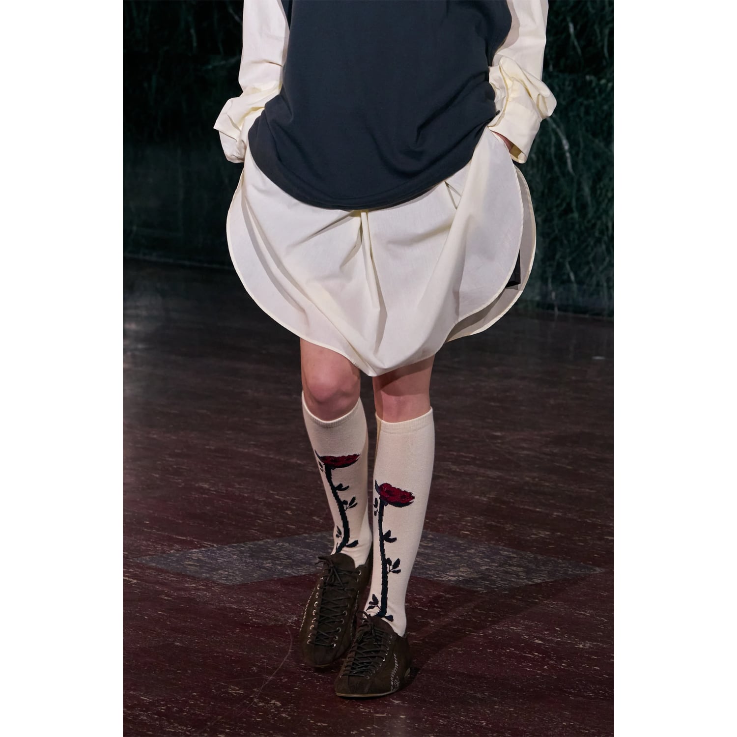 今シーズンを象徴するカーネーションと月のモチーフをのびやかに編み込んだハイソックス。