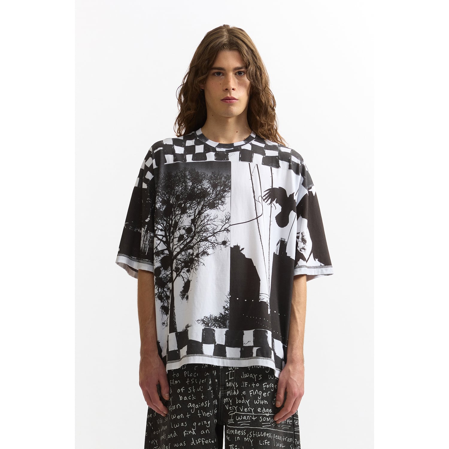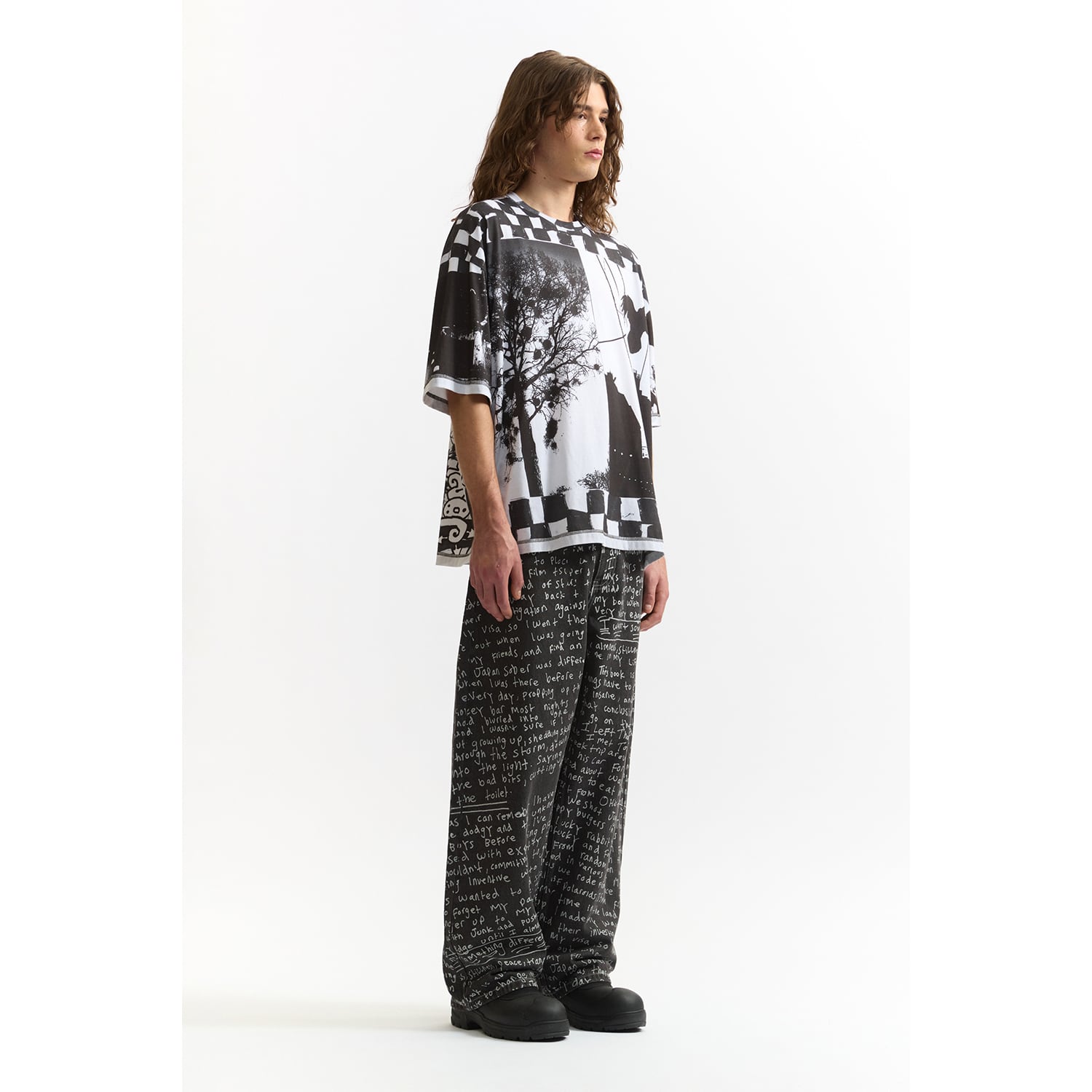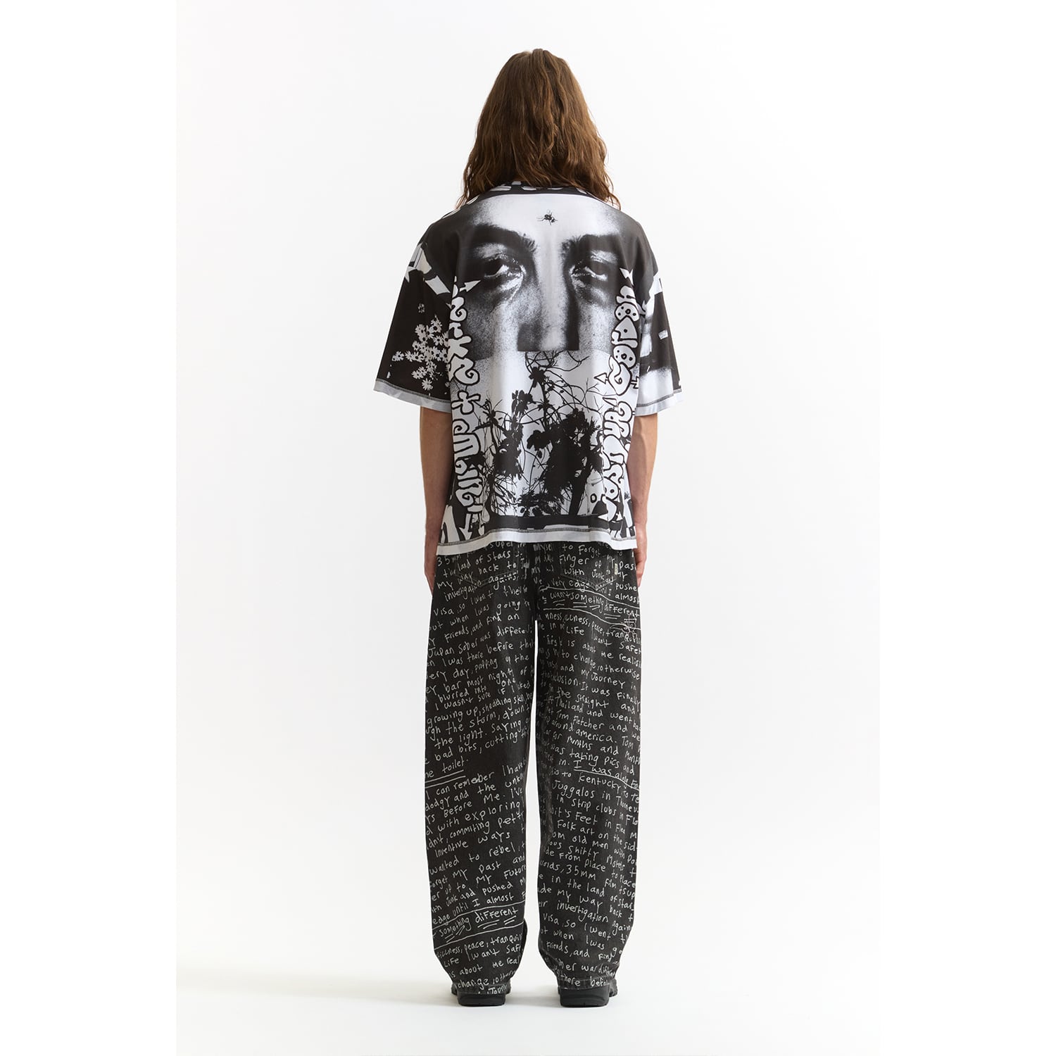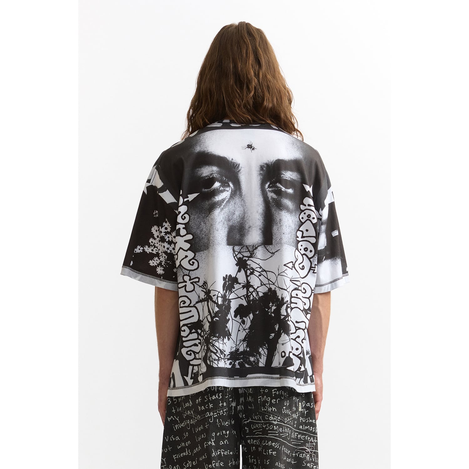 オーバーサイズでリラックスフィットの半袖Tシャツ。袖とボディはリバースヘム。ネックのリブにも意図的にプリント。全面に「Joshua Gordon」によるアートワークをデジタルプリント。