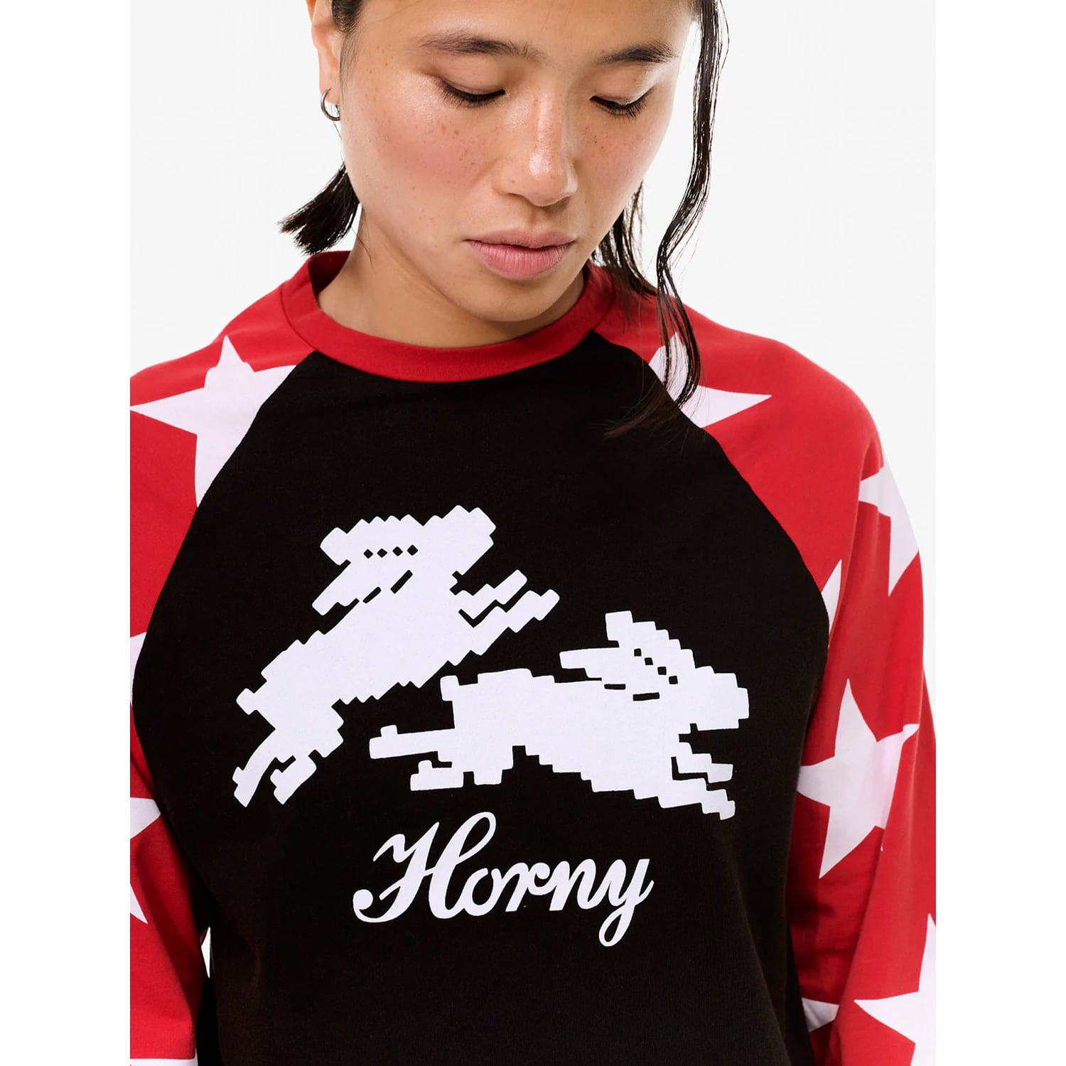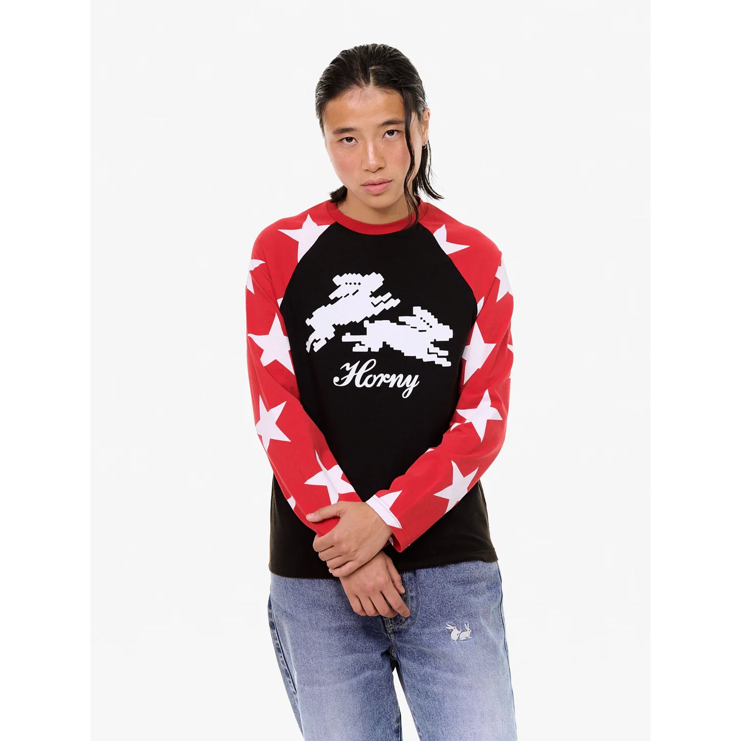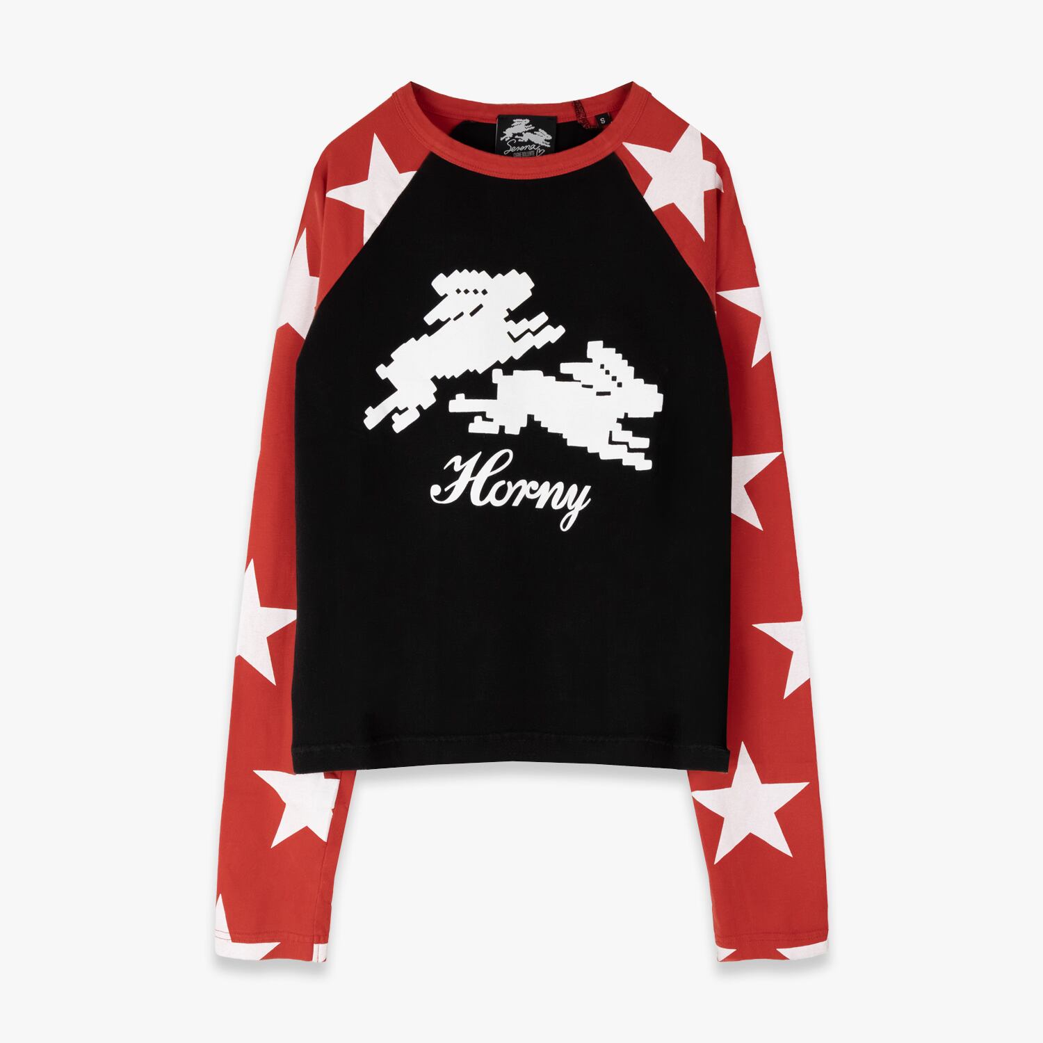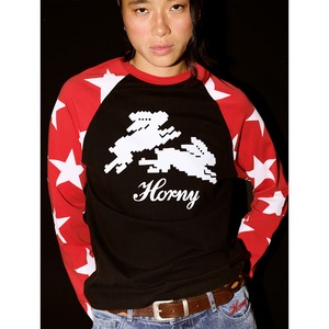 袖に大きめのスター、胸元には8ビットのラビットと“Horny”のスクリプト。
