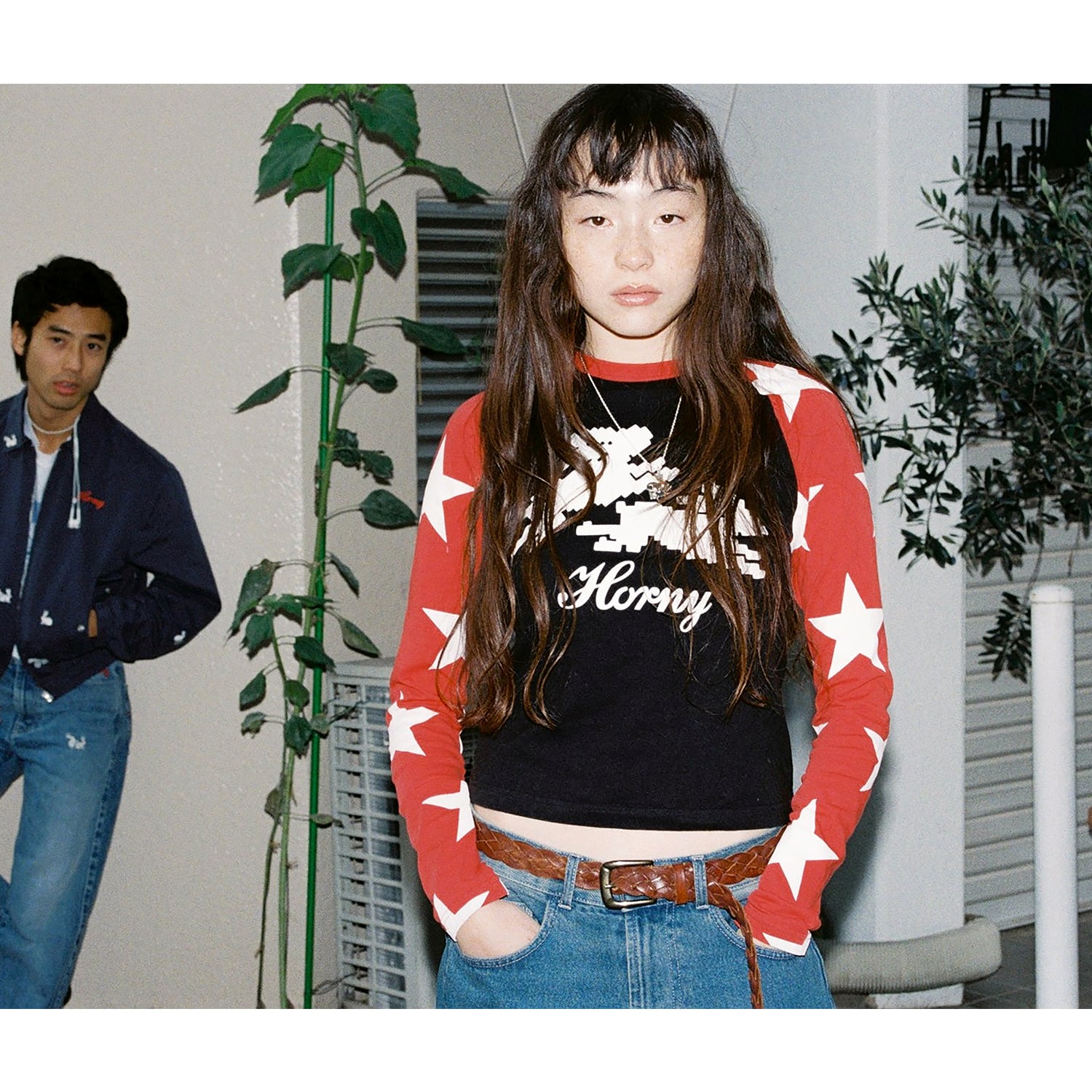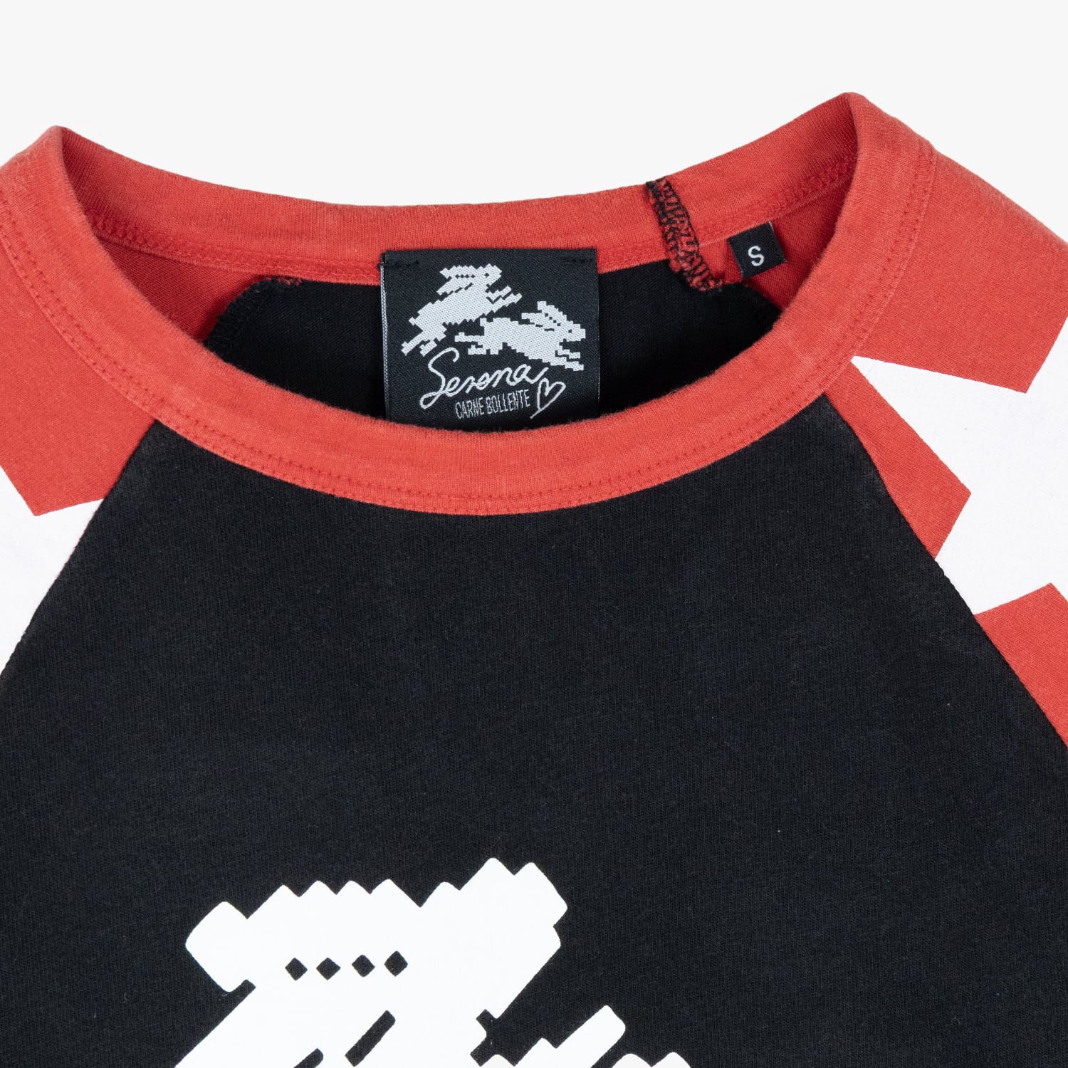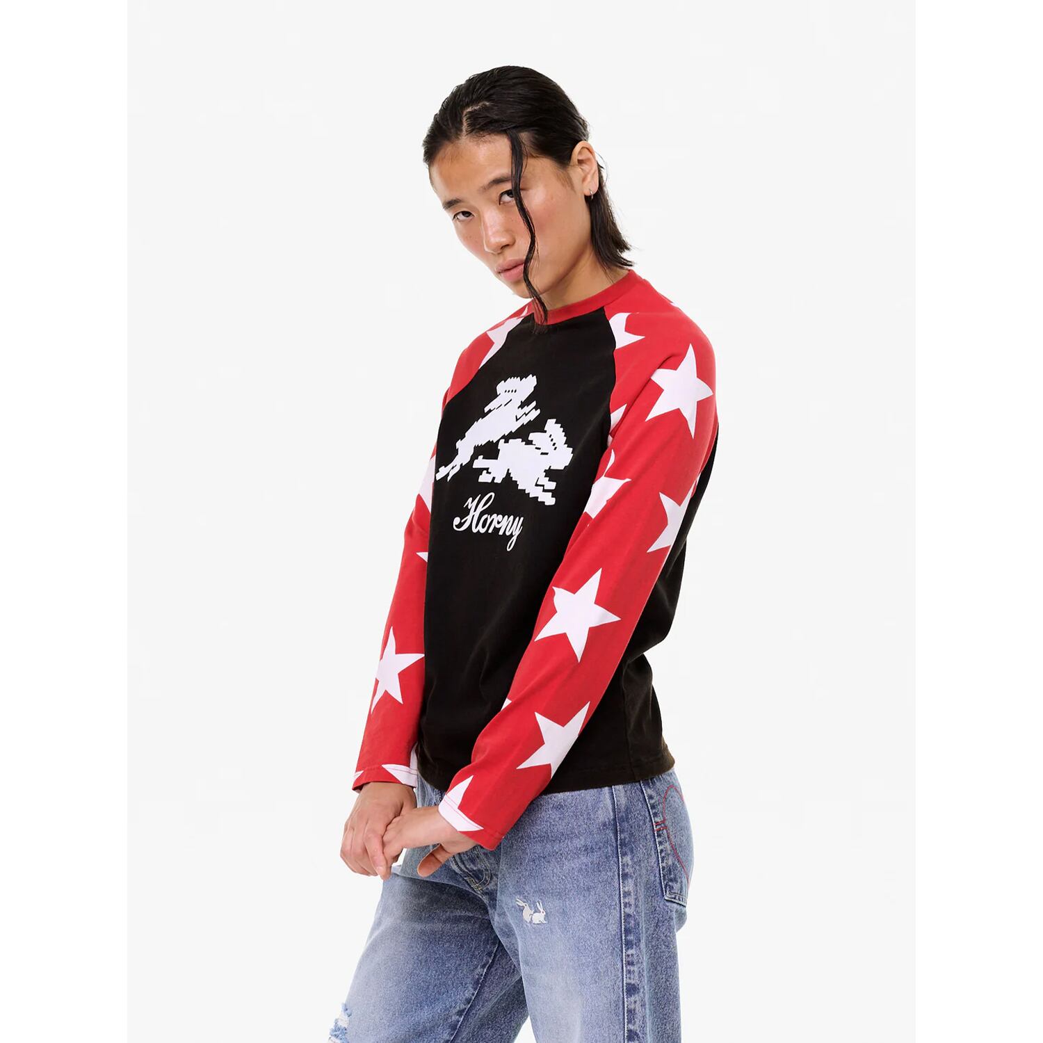 袖に大きめのスター、胸元には8ビットのラビットと“Horny”のスクリプト。