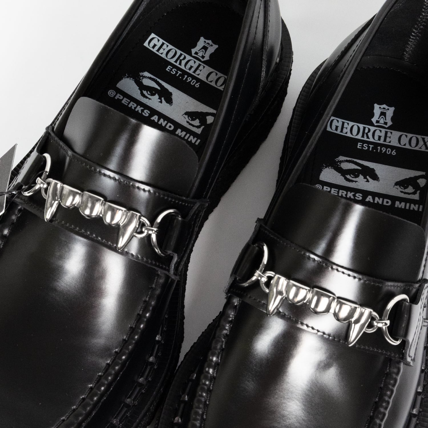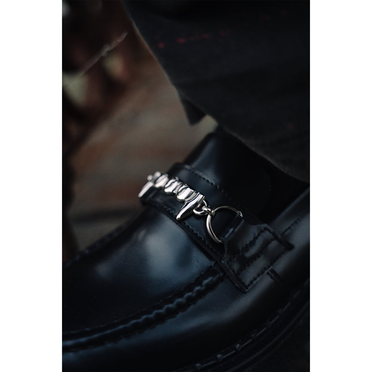 George Coxの代名詞とも言える重厚なクリーパーソールが足元を支え、サドル部分にはP.A.M.のアイコニックな「Fangs」のメタルビットを配置。硬質な輝きをもったブラックレザーと相まって、唯一無二の存在感を放ちます。
