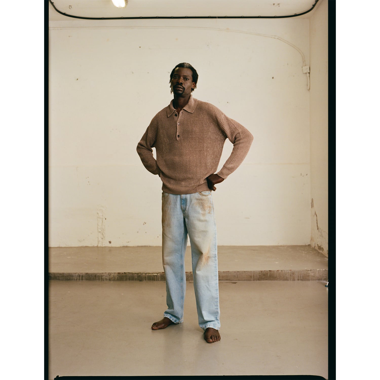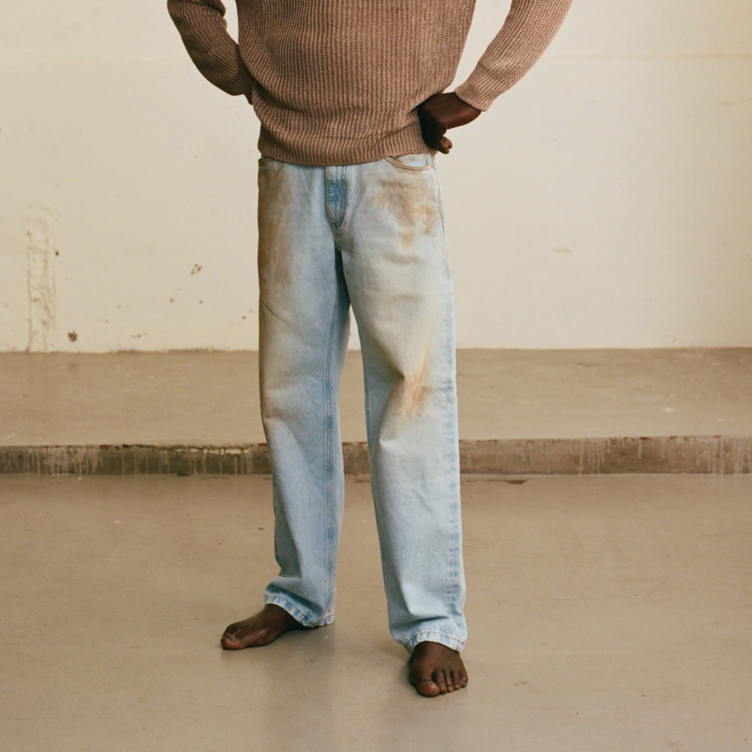 裾に向かって緩やかにすぼまる端正なワイドライン。武骨な加工感とは対照的に、計算されたカッティングが脚のラインを綺麗に見せてくれます。