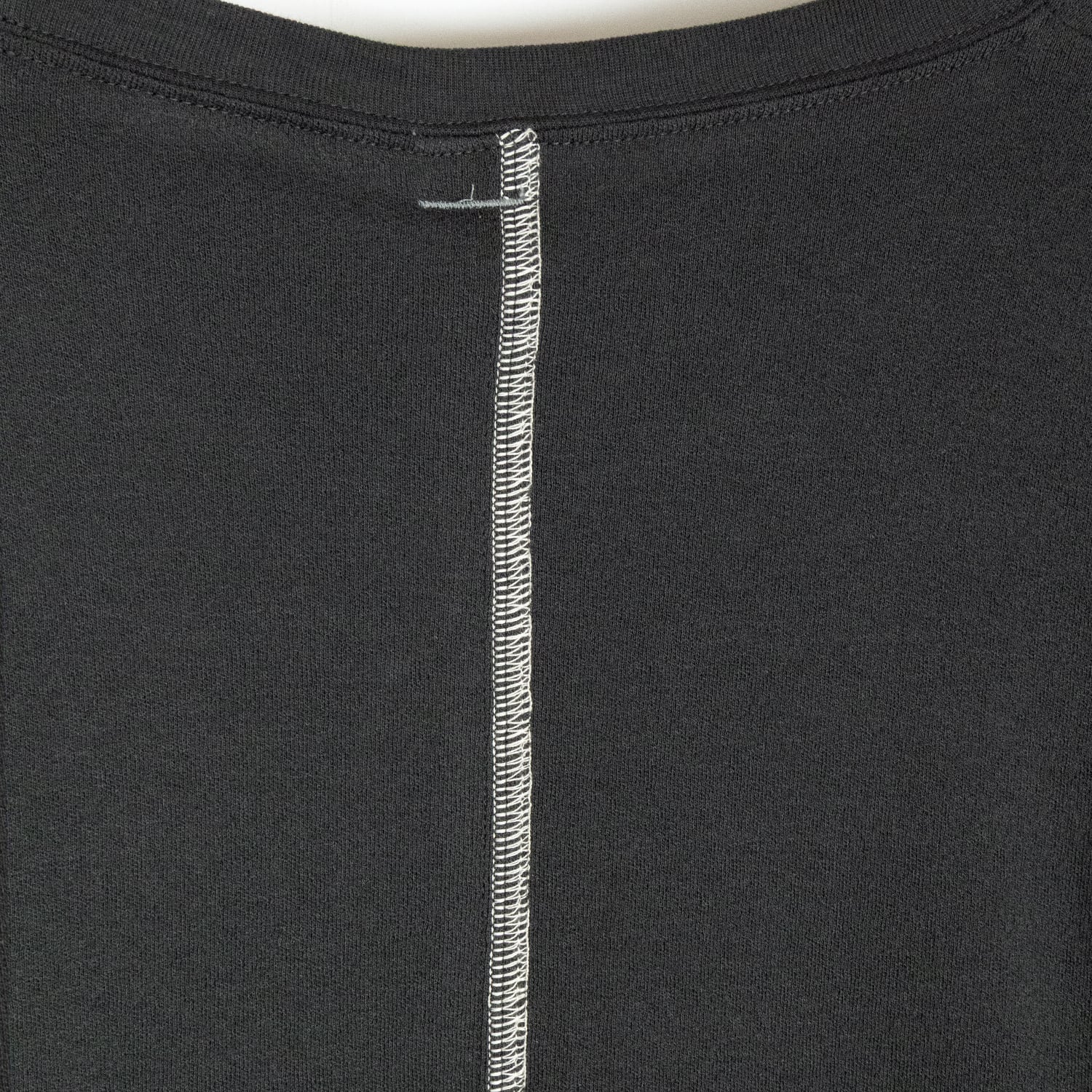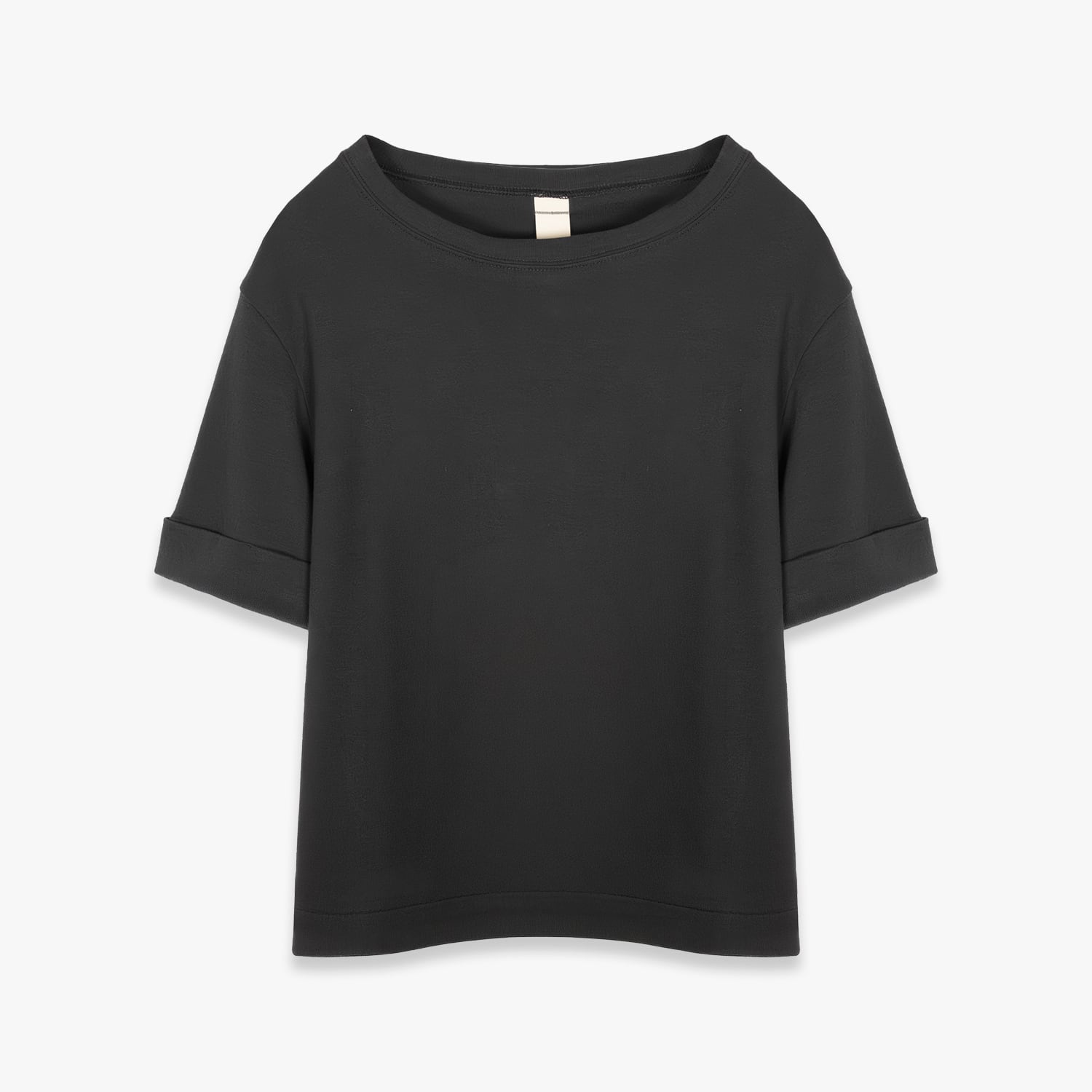 コンパクトフィットの半袖Tシャツ。袖をロールアップし、2点で縫い留めています。デンマークの画家であるハンマースホイの影をイメージした墨黒に近いチャコールカラー。