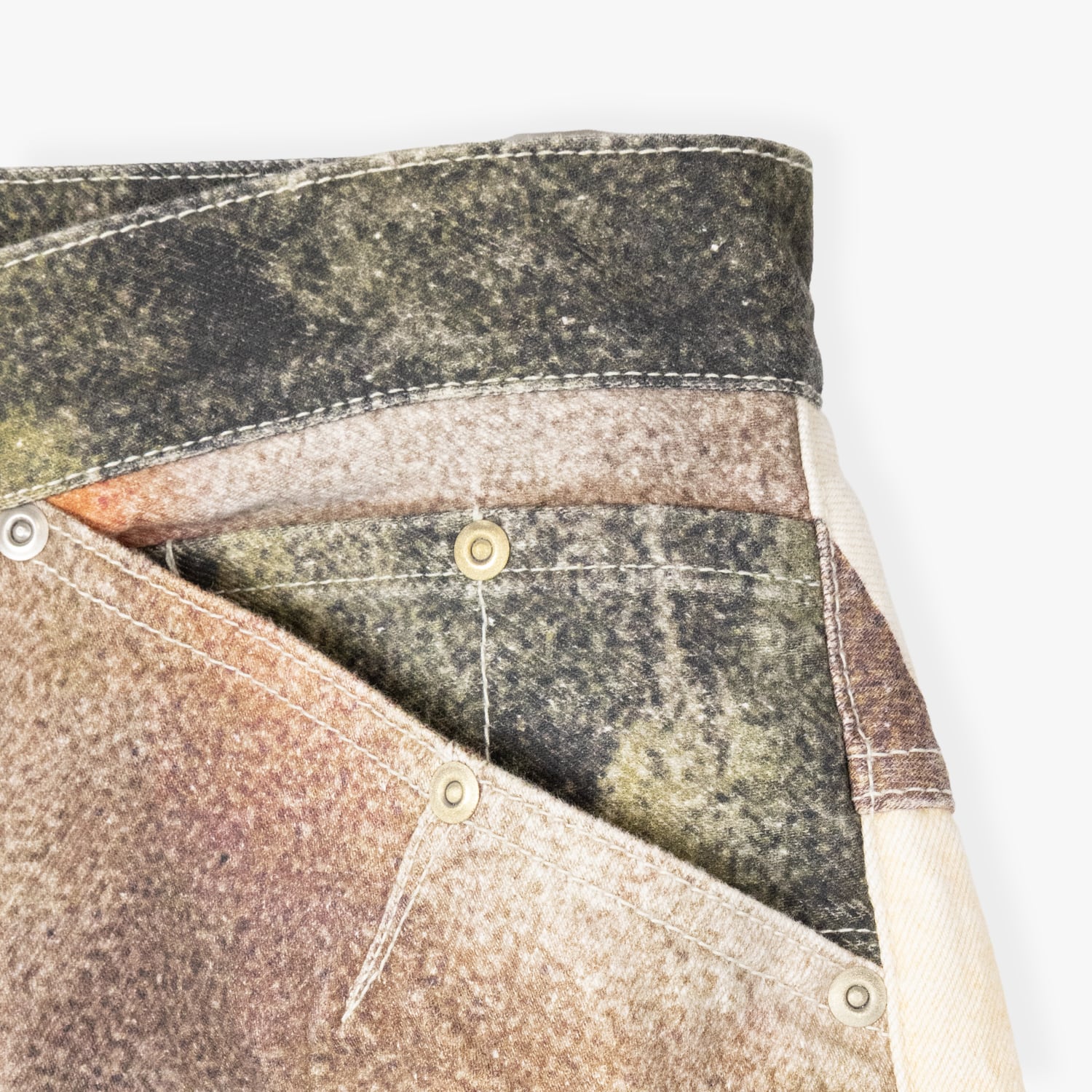 曲線的なステッチが特徴のダブルニーを採用し、ワークウェアの堅牢なディテールを取り入れつつ、グラフィックと相まってダイナミックな表情に仕上げています。