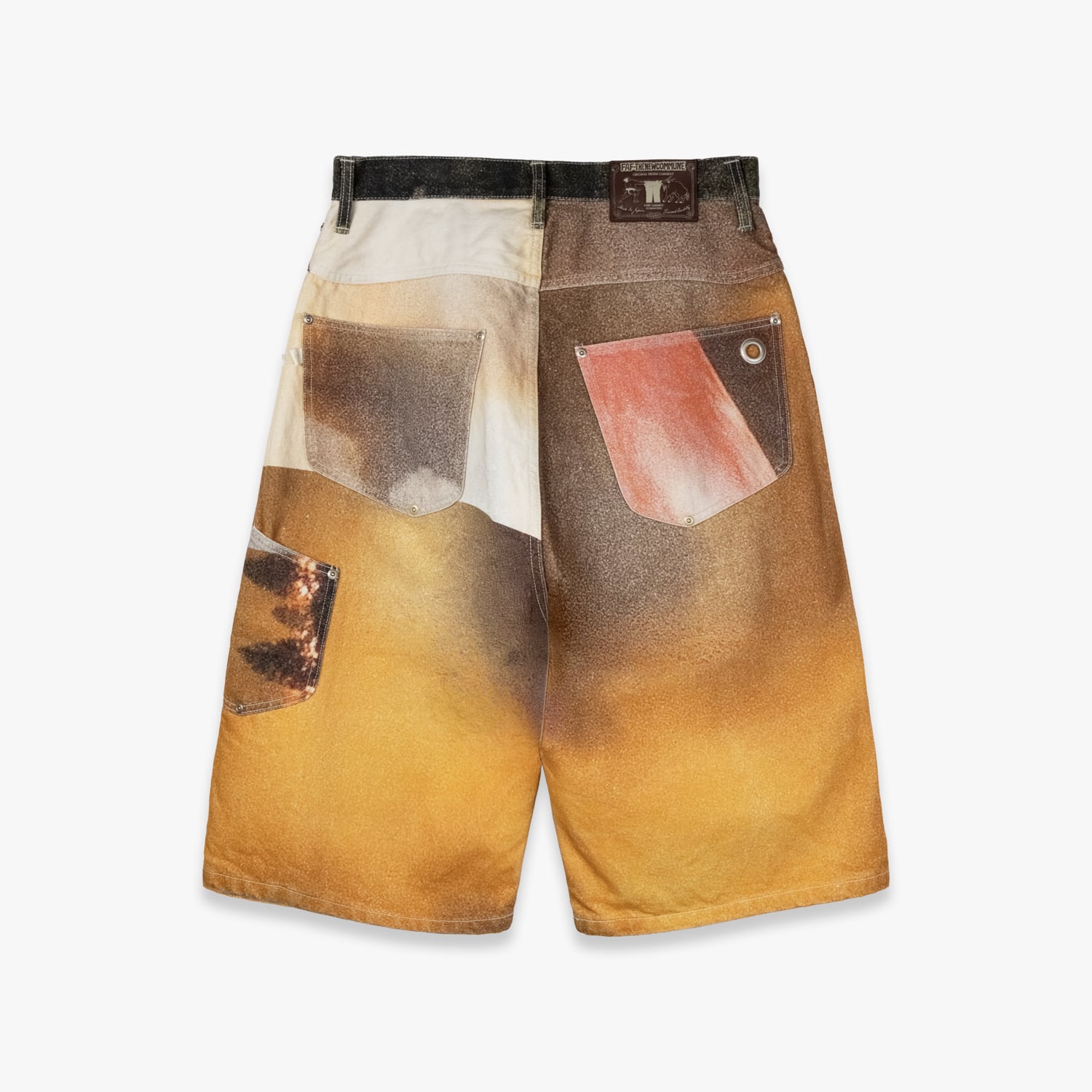 燃え上がるような色彩で森の情景をオーバープリントしたインパクト抜群のバギーショーツ。