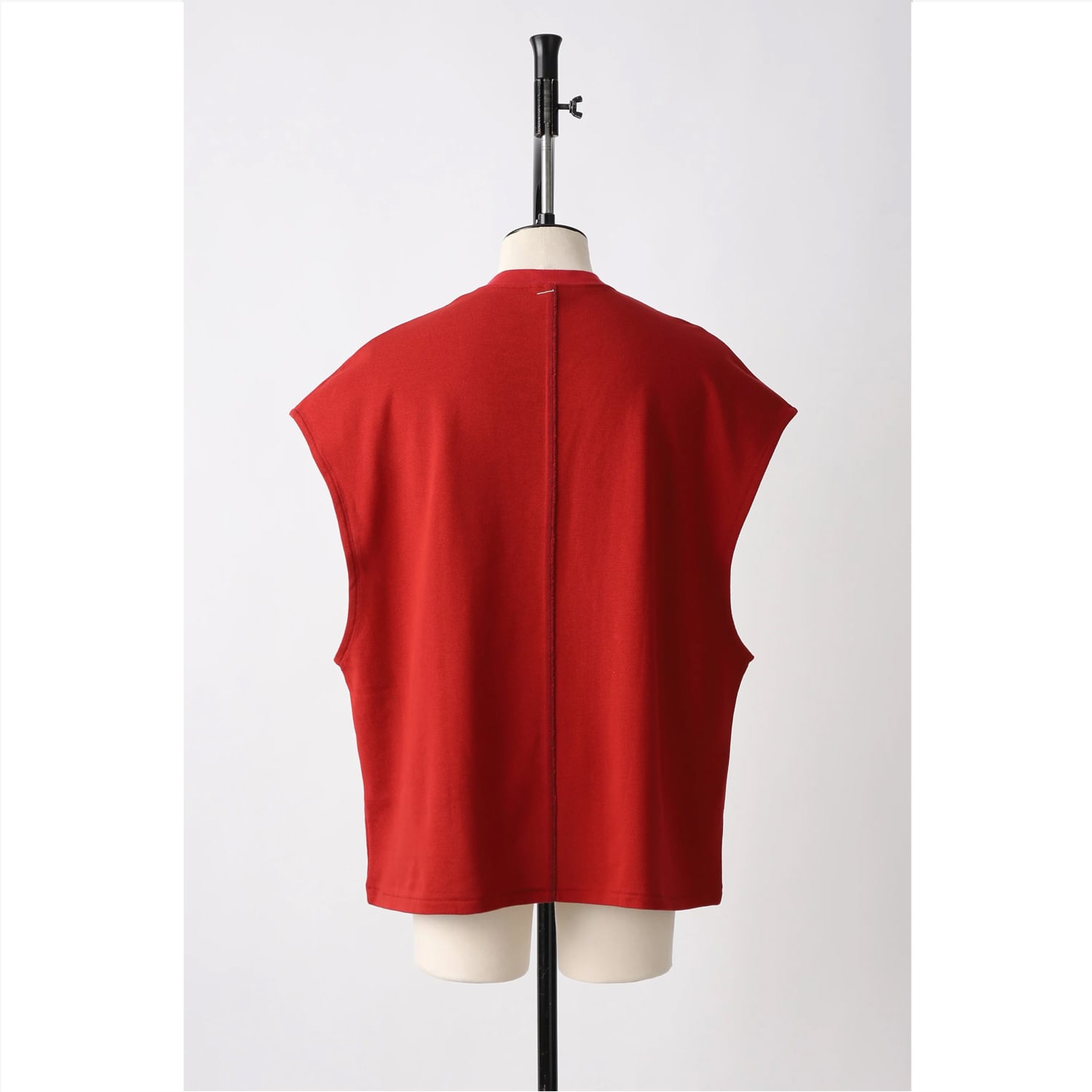 一見すると大胆なノースリーブですが、計算されたドロップショルダーが半袖のような見た目も演出します。