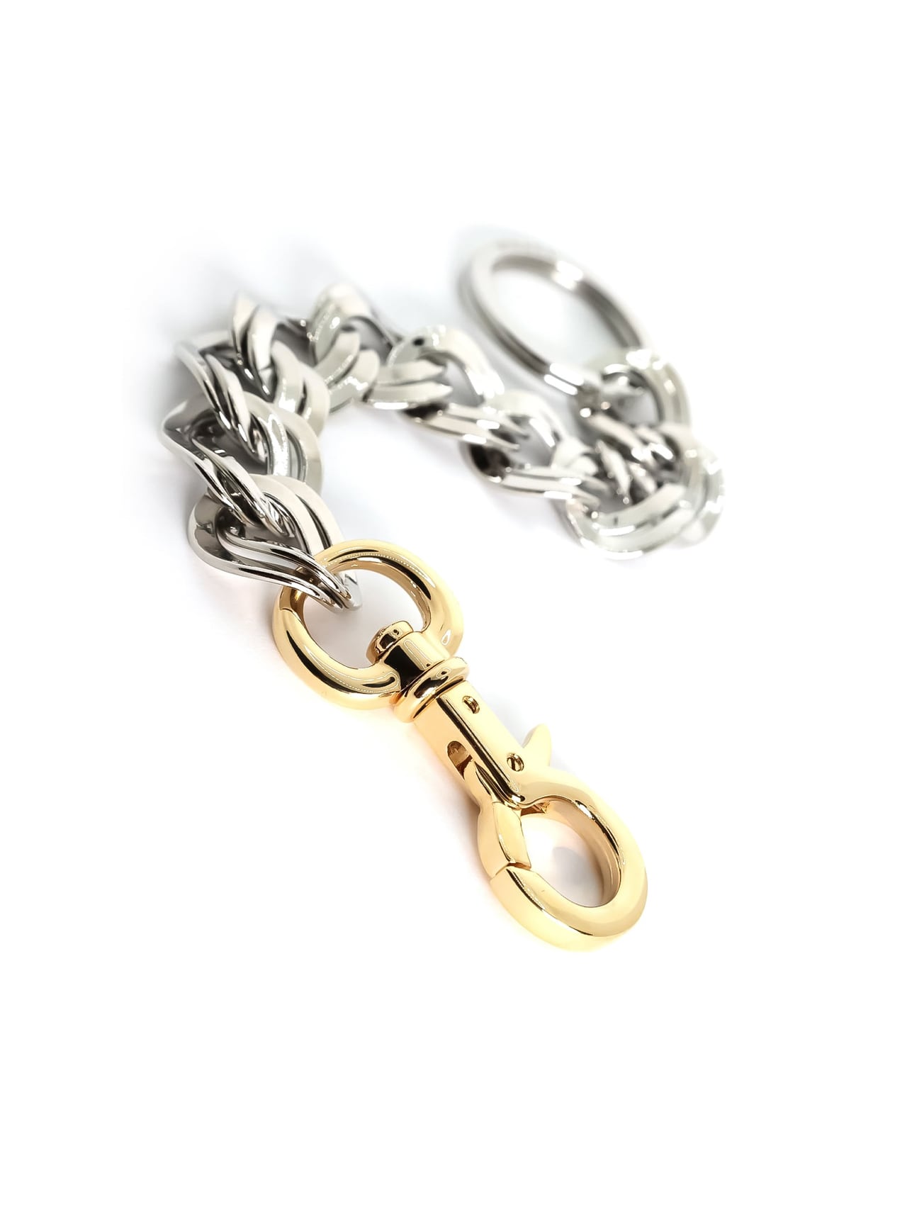 ツインカーブチェーンを使用したキーチェーン兼ブレスレット。通常のチェーンに比べてフラットな面が多く、強い光沢を放ちラグジュアリーな印象を与えてくれます。Silverには一部Goldのカラビナ、Goldには一部Silverのカラビナが使用されており、上品なアクセントになっています。