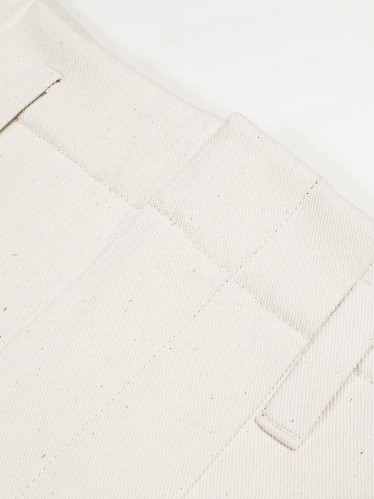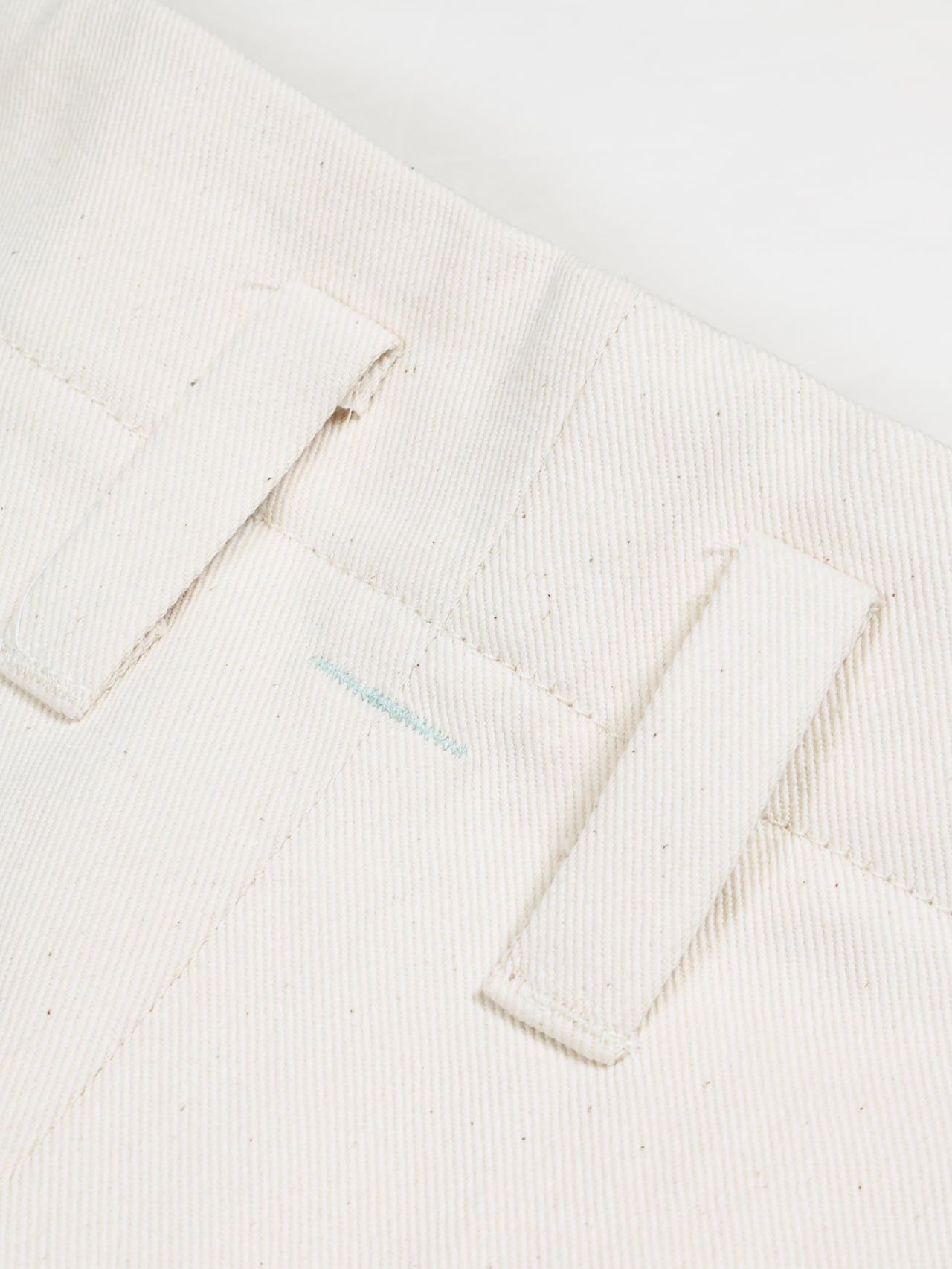 SHINYAKOZUKAの代名詞とも言える定番のBAGGY。深い2タックを入れ、中縫いを長めに入れることによって腰回りをすっきりとさせながら大胆な太さを出しています。膝裏に切り替えを入れ、少し足が曲がったような特徴的なシルエットを生み出しています。生地はデッドストックのオーガニックコットンツイル。