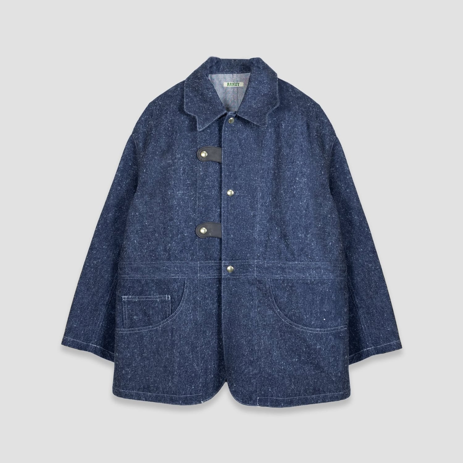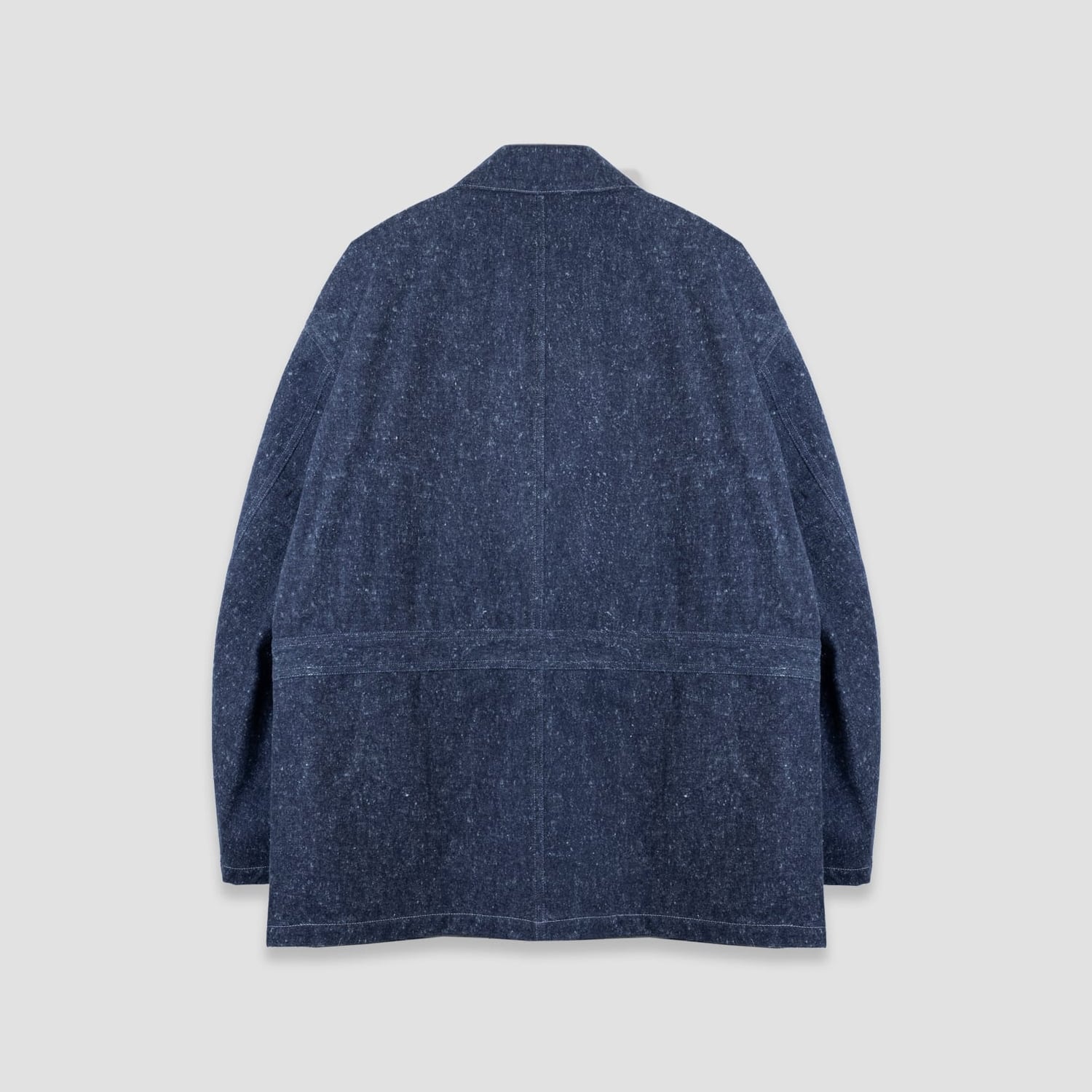 衿にはカッティングを施し、センターボタンにはチンアナゴを意識した2ヶ所のレザータブを取り入れています。腰ポケットはデニムパンツがくっついたようなディテールで、ポケットのないパンツを履いていても安心感を与えてくれます。インディゴは、ロープインディゴにシルクネップの生糸を使用し、3/1の綾織りで仕上げた贅沢なシャギー加工のデニム。シルクの繊維長を生かして、最大の長さでシャギーをかけています。着れば着るほど、洗えば洗うほどにオリジナルデニムへと変化していきます。